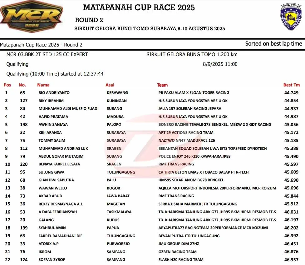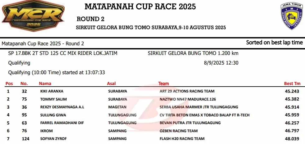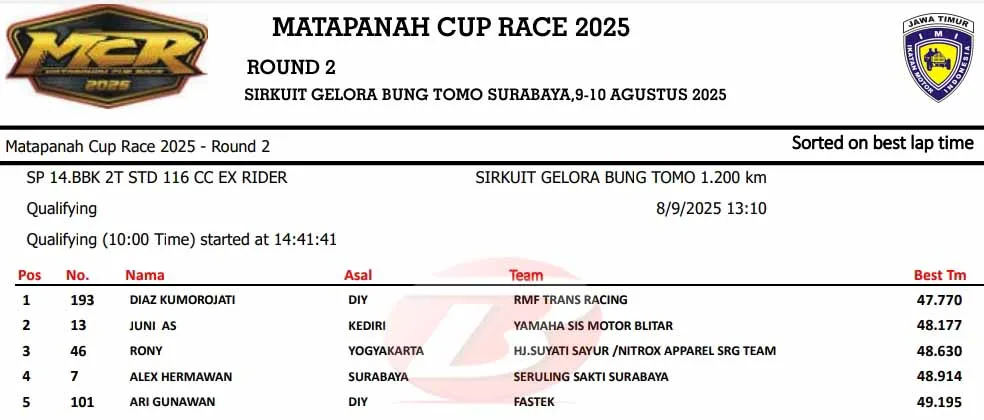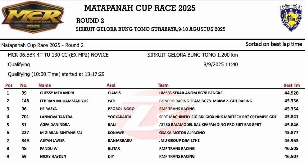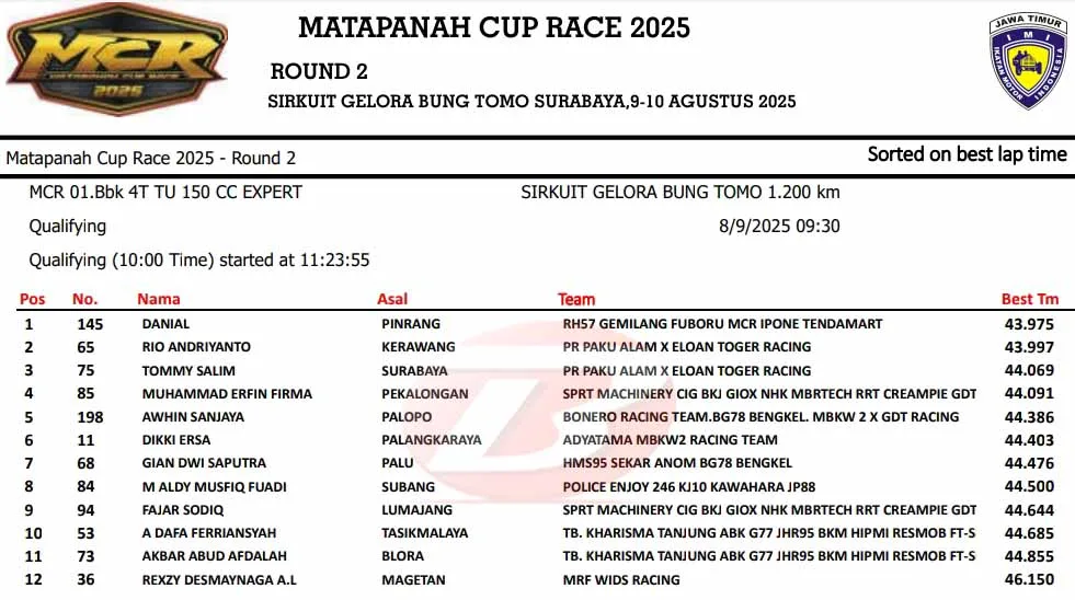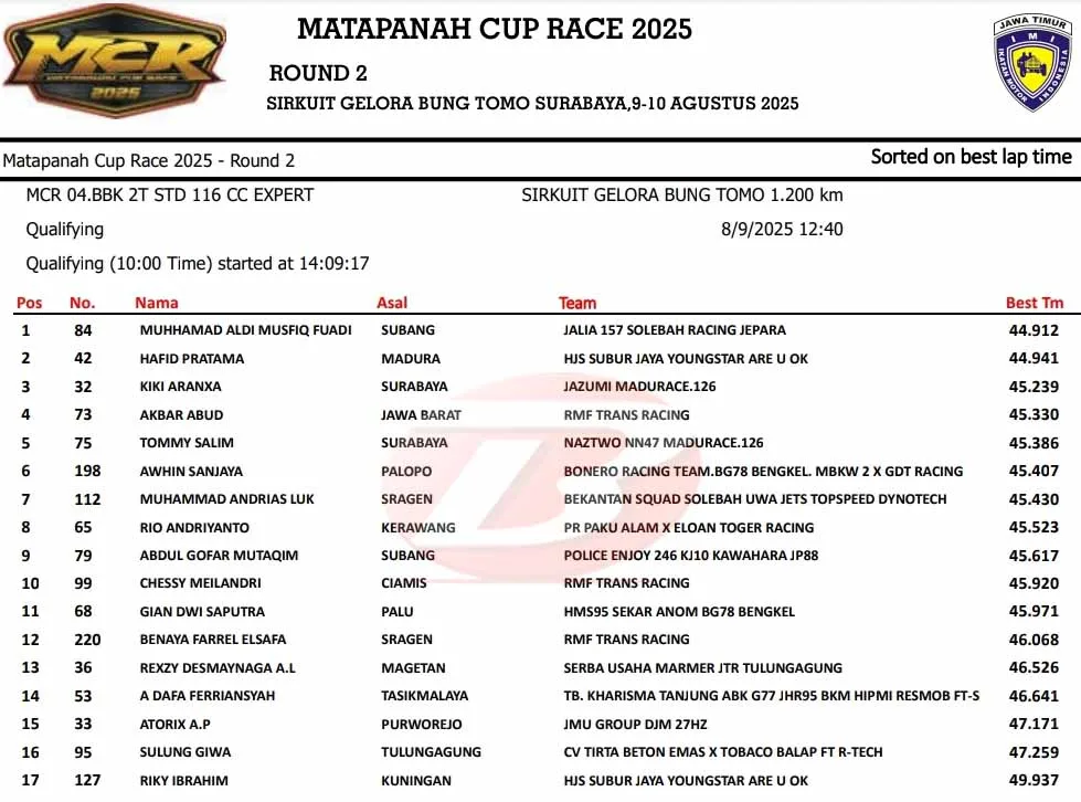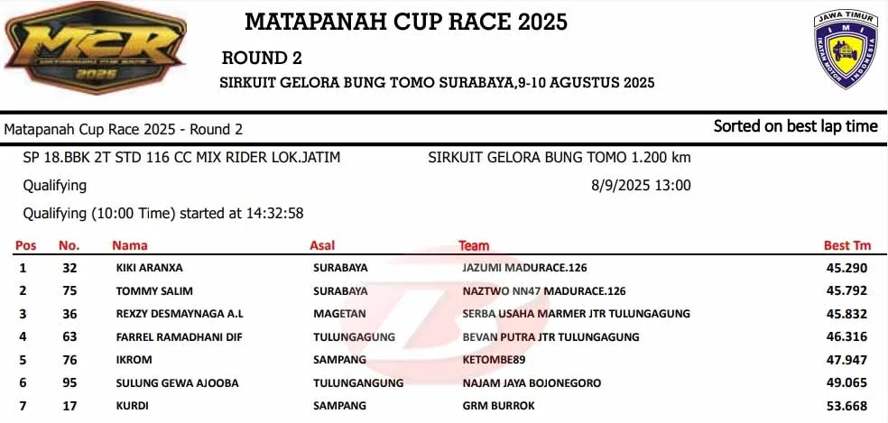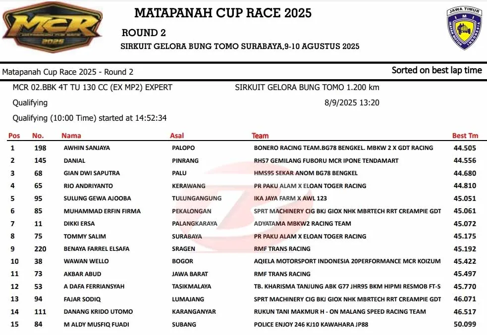 BalapMotor.Net – Berikut merupakan hasil sesi kualifikasi kejuaraan Matapanah Cup Race (MCR) 2025 putaran kedua yang berlangsung di sirkuit Gelora Bung Tomo (GBT) Surabaya, Jawa Timur pada Sabtu 9 Agustus 2025. (**)