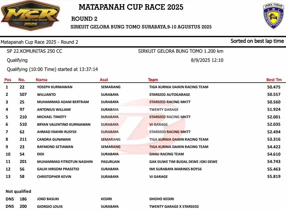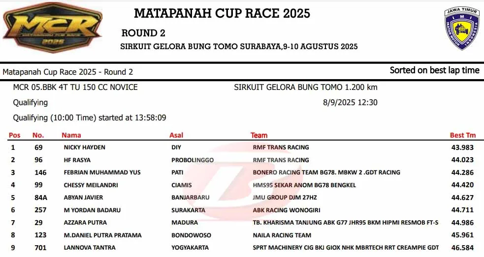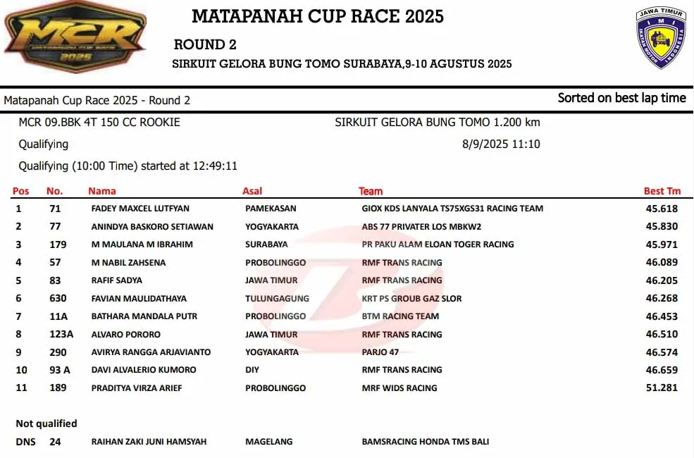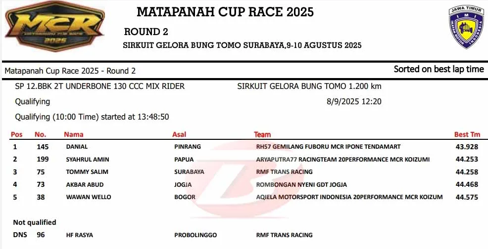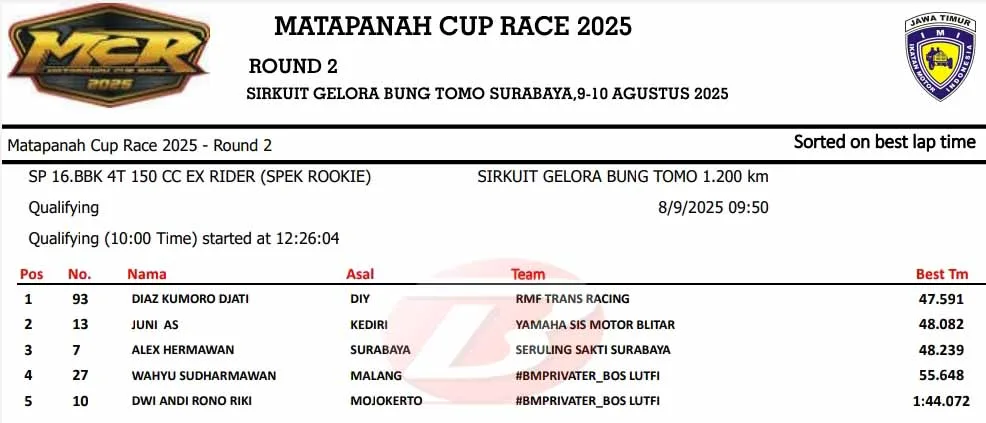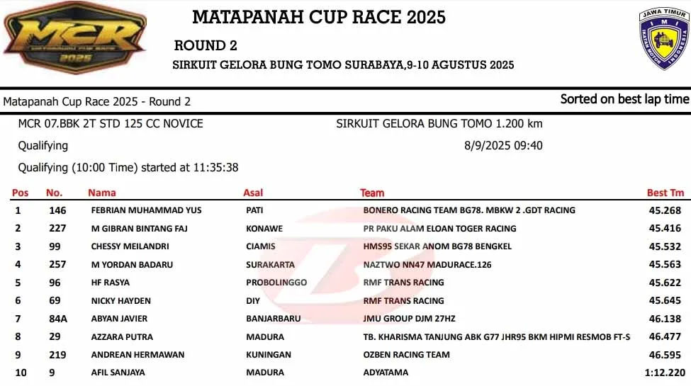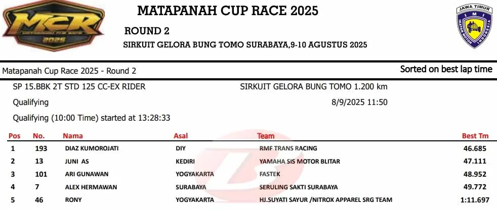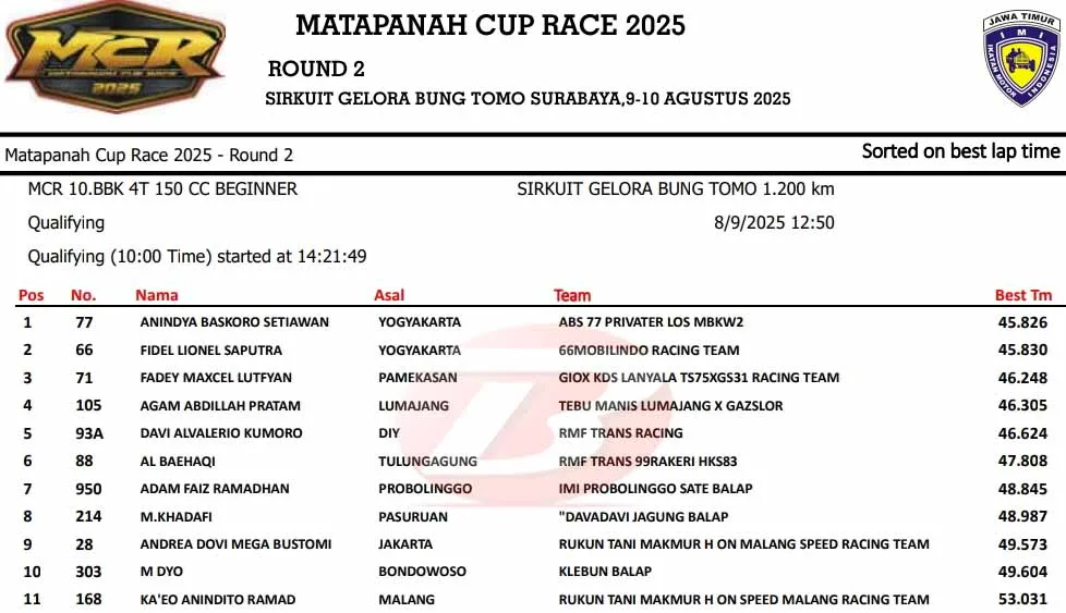 BalapMotor.Net – Berikut merupakan hasil sesi kualifikasi kejuaraan Matapanah Cup Race (MCR) 2025 putaran kedua yang berlangsung di sirkuit Gelora Bung Tomo (GBT) Surabaya, Jawa Timur pada Sabtu 9 Agustus 2025. (**)