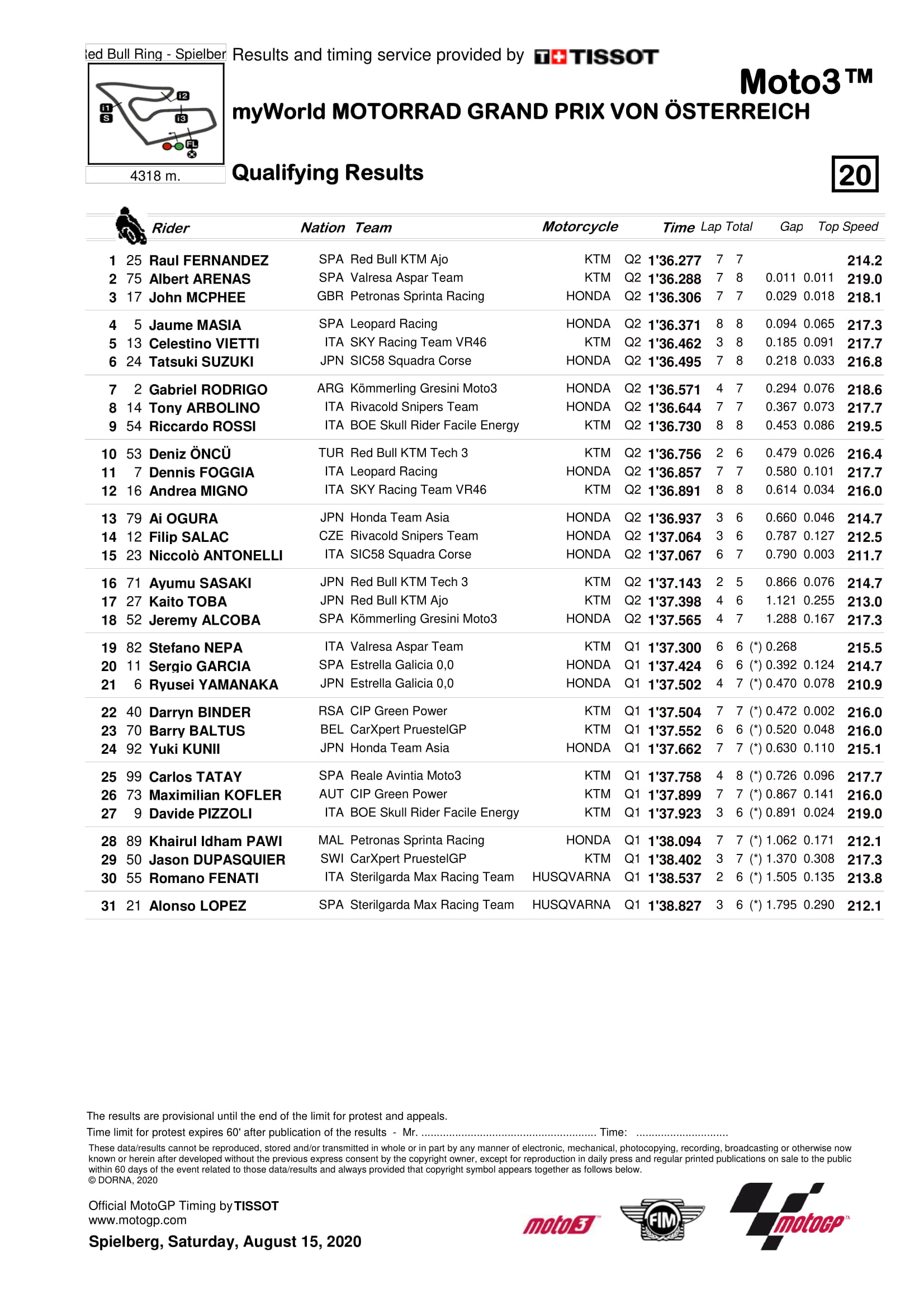 Hasil Kualifikasi MotoGP Austria 2020 Semua KelasPenulis Fajar Sulistiono - 15/08/2020Foto: MotoGP BalapMotor.Net – Berikut merupakan hasil dari sesi Kualifikasi gelaran myWorld Motorrad Von Österreich 2020 yang berlangsung di sirkuit Red Bull Ring, Austria pada 15 Agustus 2020.
