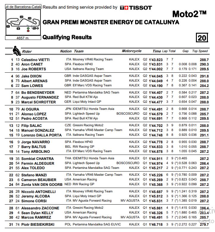 BalapMotor.Net – Berikut merupakan hasil dari sesi kualifikasi gelaran Gran Premi Monster Energy De Catalunya (GP Catalunya) yang berlangsung di Circuit De Barcelona Catalunya, Spanyol hari Sabtu 4 Juni 2022.