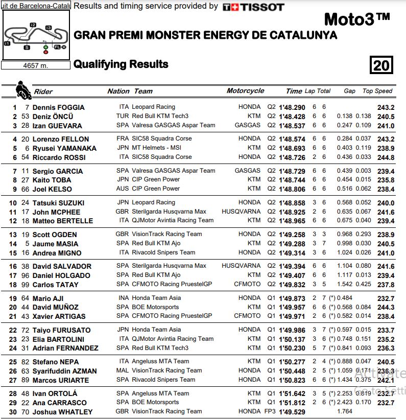 BalapMotor.Net – Berikut merupakan hasil dari sesi kualifikasi gelaran Gran Premi Monster Energy De Catalunya (GP Catalunya) yang berlangsung di Circuit De Barcelona Catalunya, Spanyol hari Sabtu 4 Juni 2022.