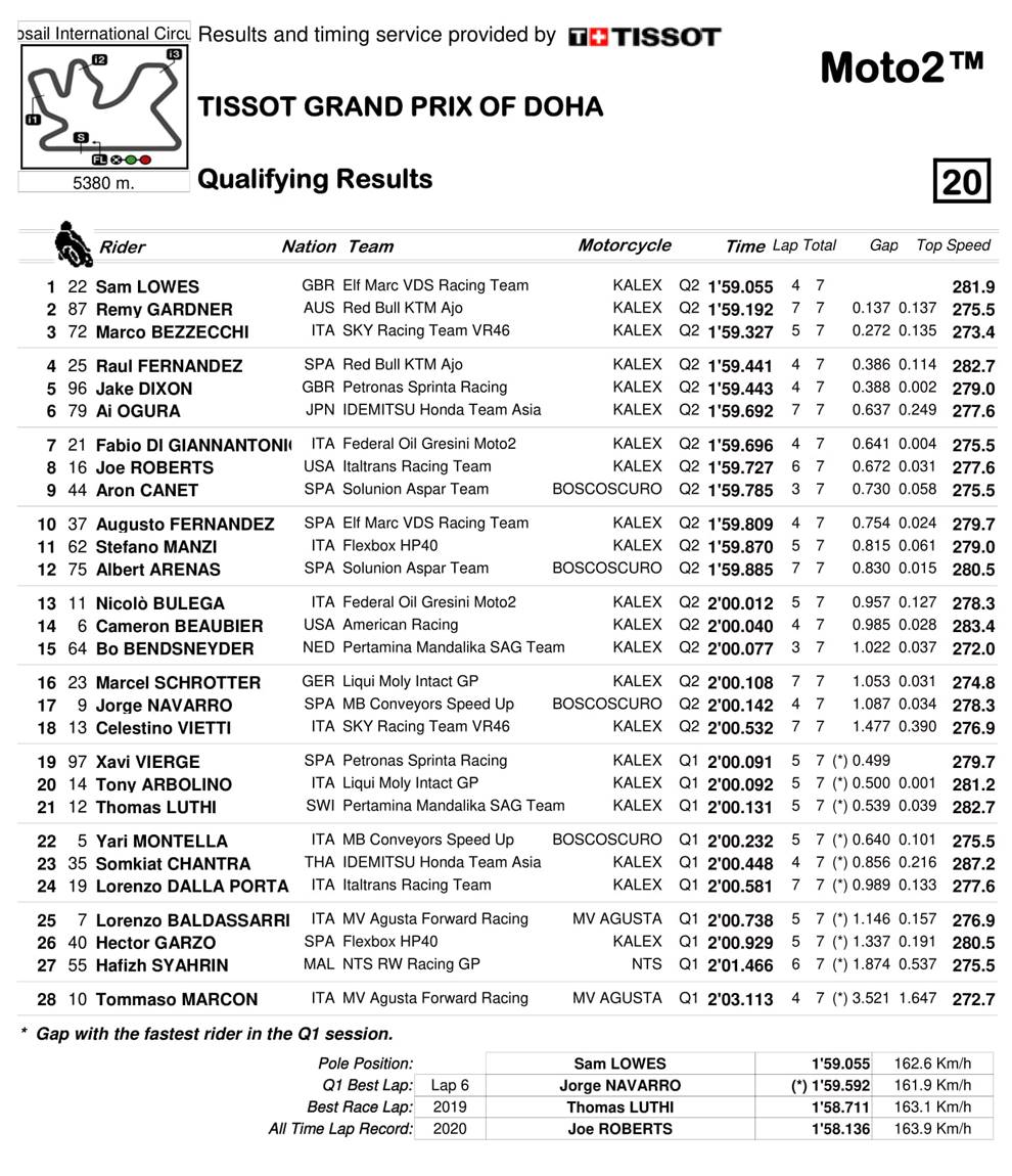 BalapMotor.Net – Berikut merupakan hasil kualifikasi dari gelaran Tissot Grand Prix Of Doha yang berlangsung di sirkuit Losail, Qatar pada 3 April 2021 untuk semua kelas baik MotoGP, Moto2 dan Moto3.