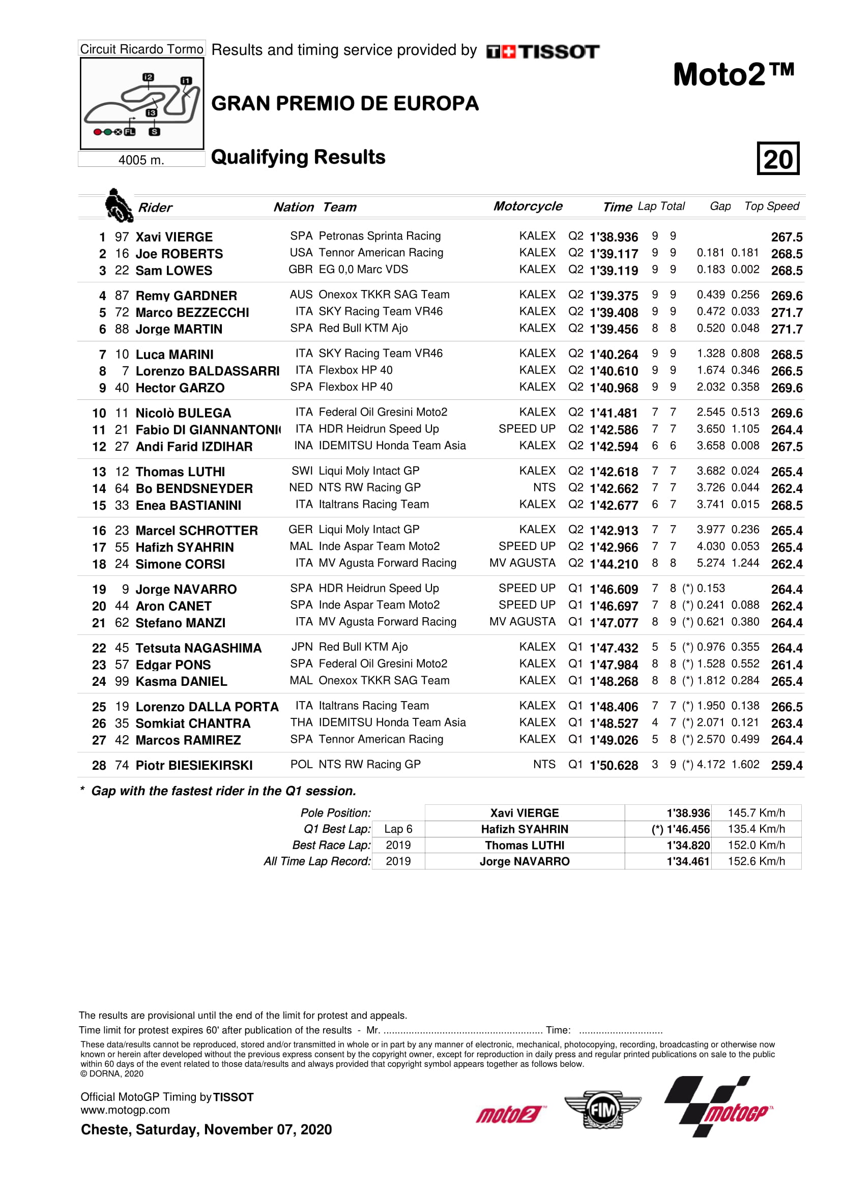 Hasil Kualifikasi MotoGP Eropa 2020 Semua KelasPenulis Fajar Sulistiono - 07/11/2020Foto: MotoGP BalapMotor.Net – Berikut merupakan hasil kualifikasi untuk semua kelas dari MotoGP Eropa 2020. Sesi kualifikasi MotoGP Eropa 2020 sendiri berlangsung di sirkuit Ricardo Tormo Valencia, Spanyol pada hari sabtu 07 November 2020.