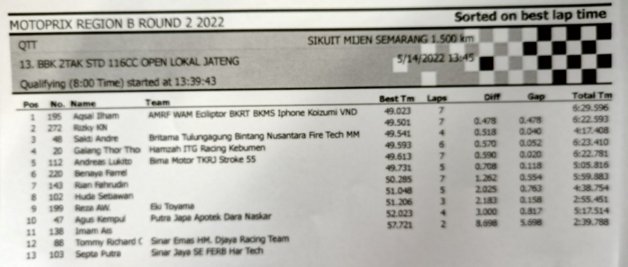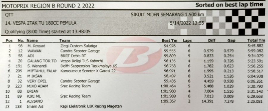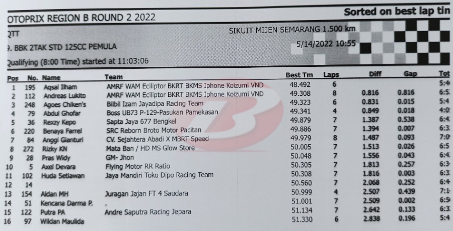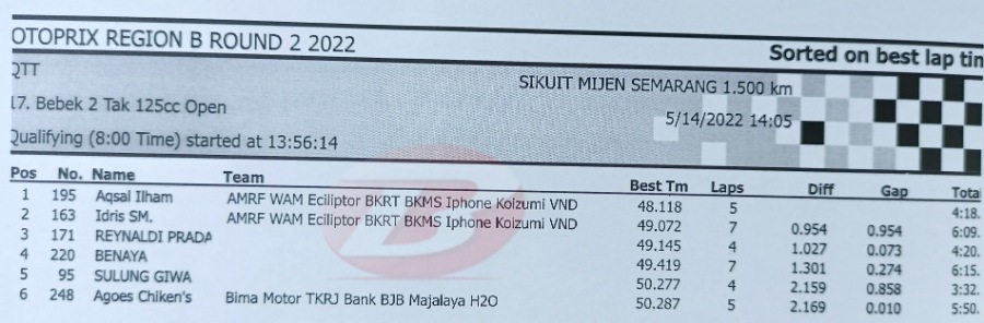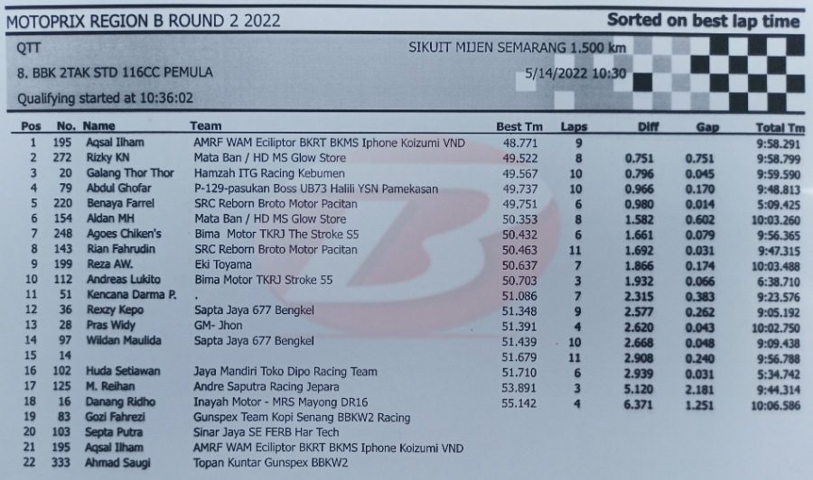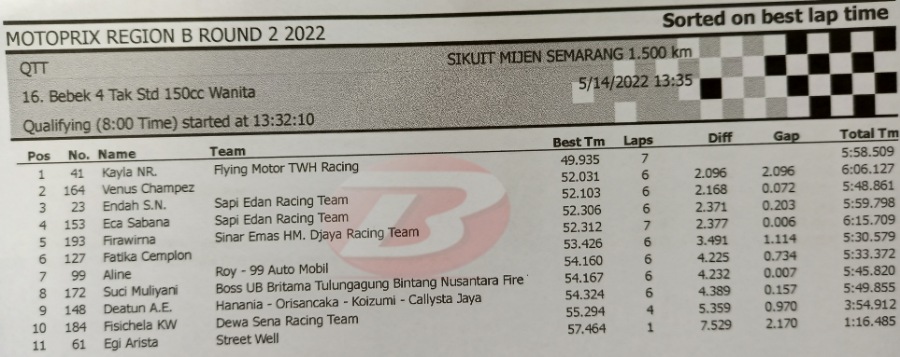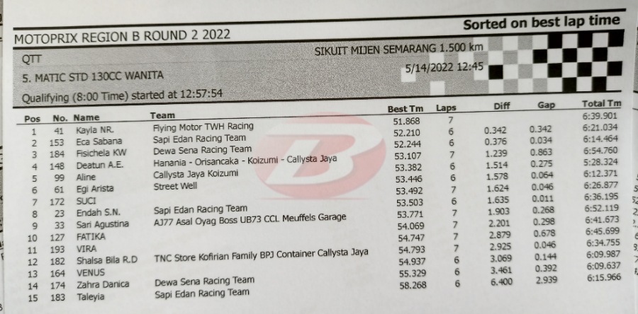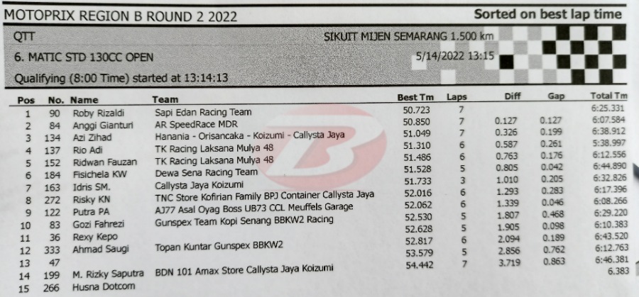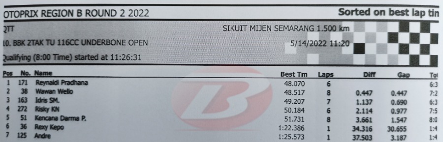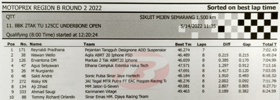 BalapMotor.Net – Berikut kami paparkan hasil lengkap babak kualifikasi (QTT) kejurnas Motoprix Region B putaran 2 yang berlangsung di sirkuit Mijen Semarang, Jawa Tengah (14 Mei).