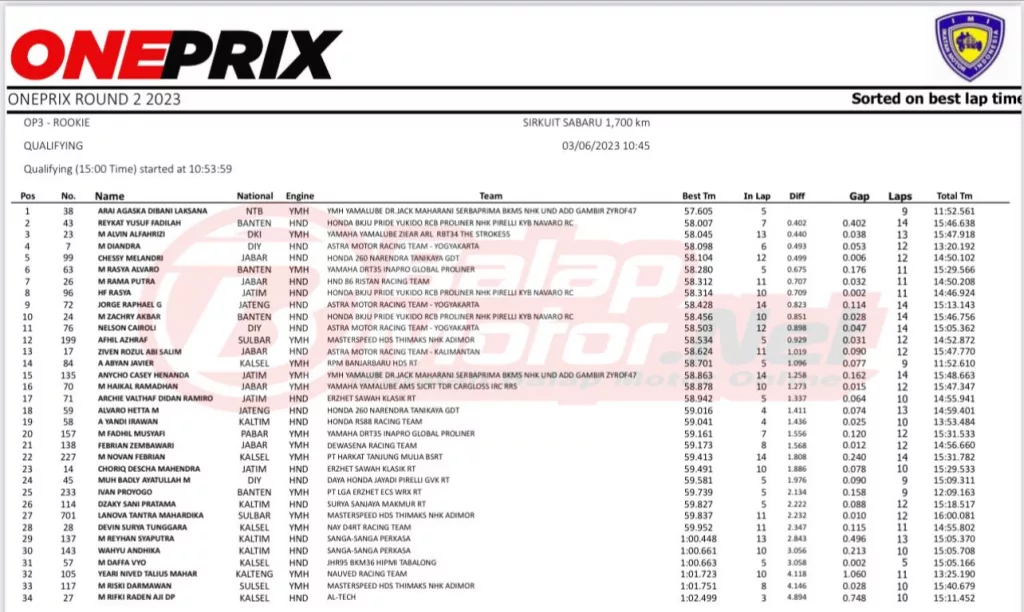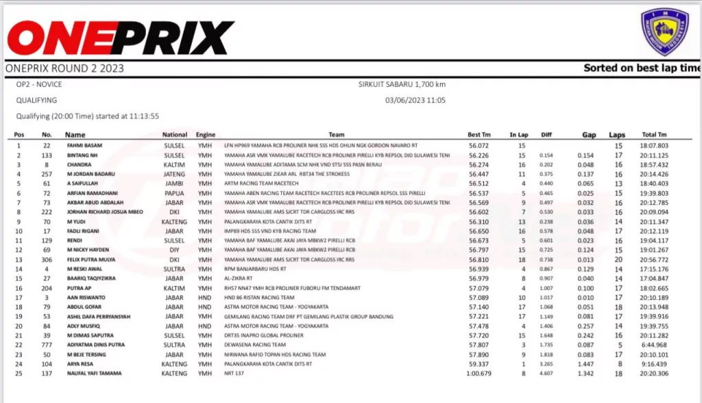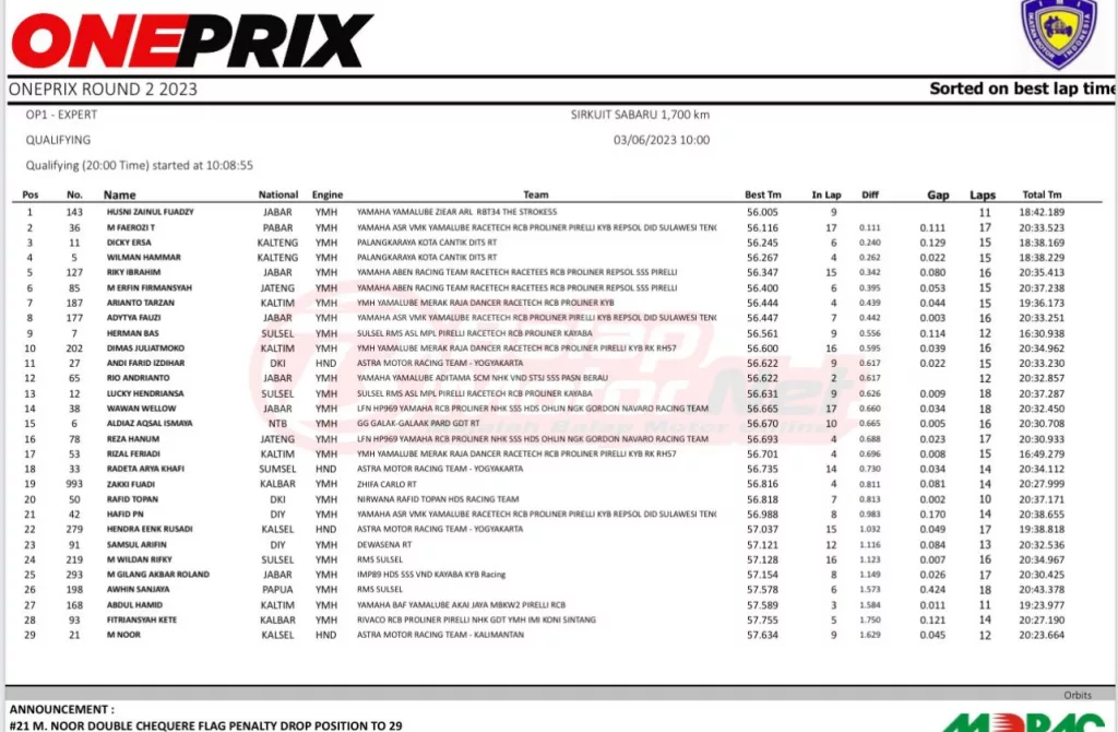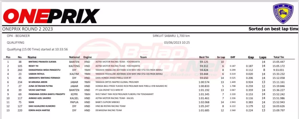BalapMotor.Net – Berikut merupakan hasil kualifikasi Kejurnas Oneprix putaran kedua yang berlangsung di sirkuit Sabaru, Palangkaraya pada Sabtu 3 Juni 2023. (***)