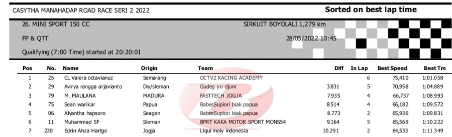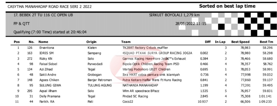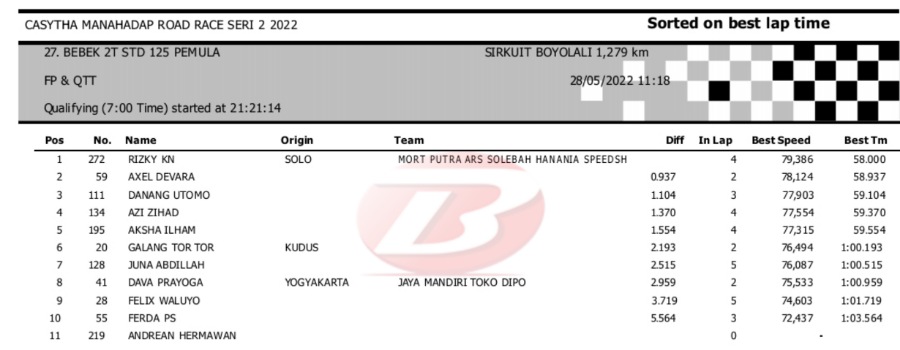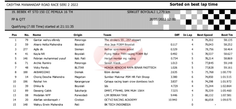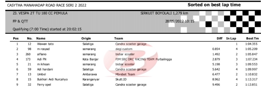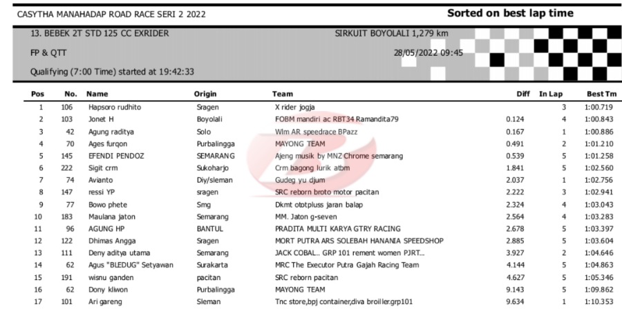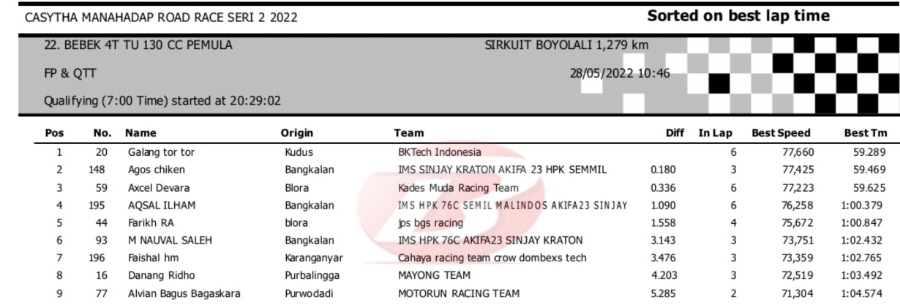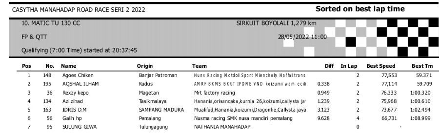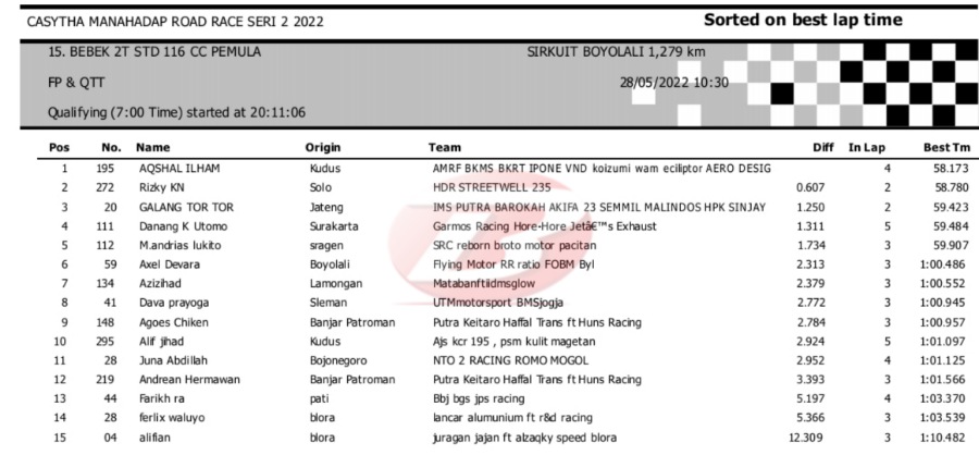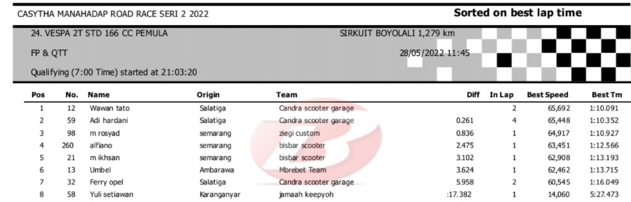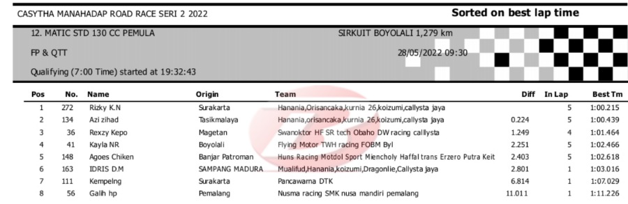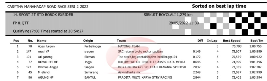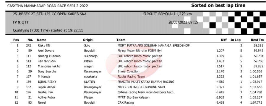Hasil Kualifikasi Road Race Boyolali 28 Mei 2022 (Hari Pertama)Penulis Yugo Aol - 28/05/2022 BalapMotor.Net – Berikut kami paparkan hasil lengkap kualifikasi kelas yang dilombakan pada hari pertama pada kejuaraan balap motor Kejurprov Jateng Casytha Manahadap Road Race Seri 2 yang berlangsung di sirkuit Gokart, Boyolali, Sabtu 28 Mei 2022.