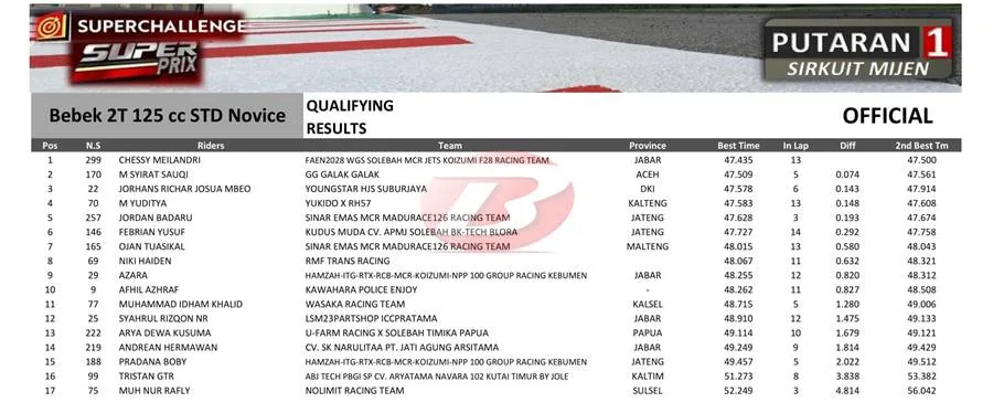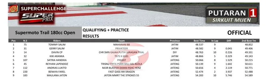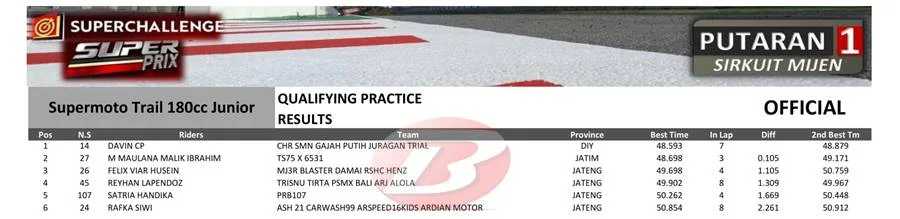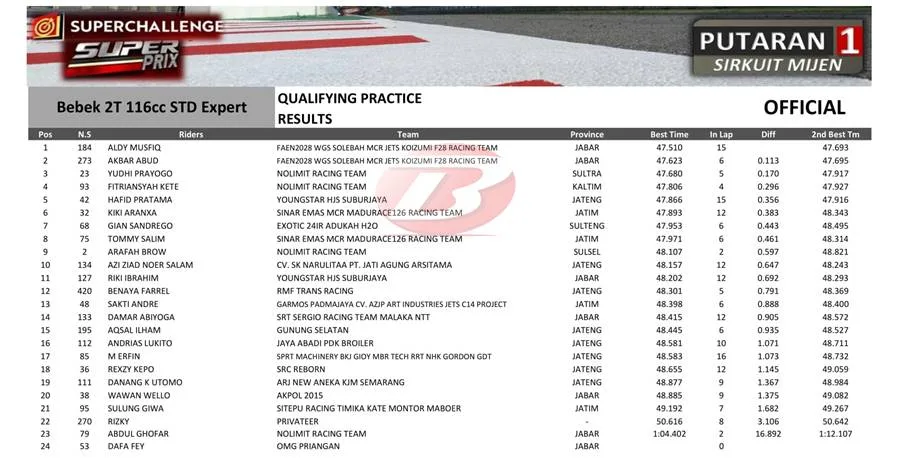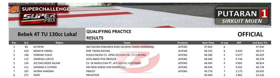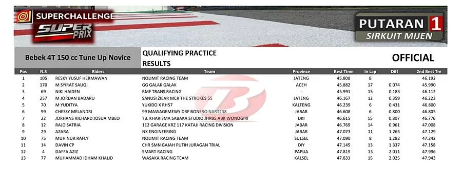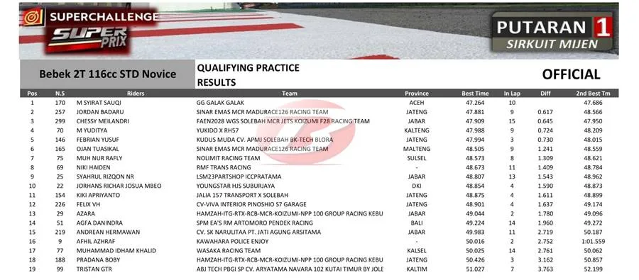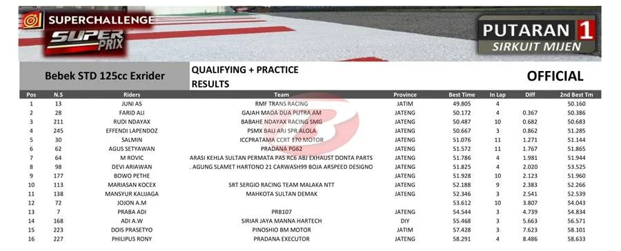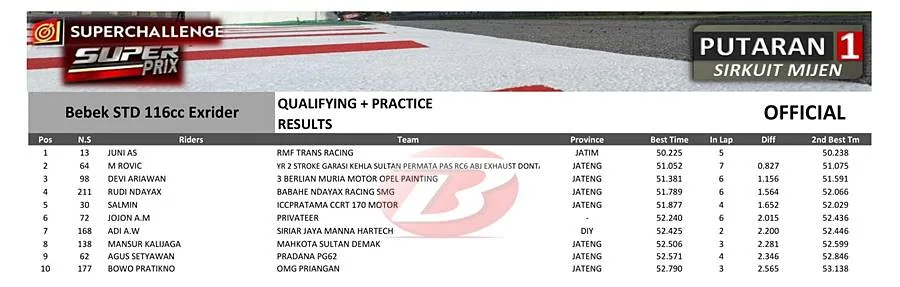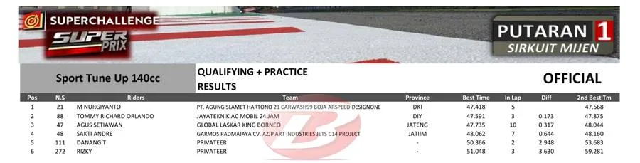 BalapMotor.Net – Berikut merupakan hasil sesi kualifikasi kejuaraan Superchallenge Super Prix 2025 Round 1 yang berlangsung di sirkuit Mijen, Semarang, Jawa Tengah pada 30-31 Mei 2025. (**)