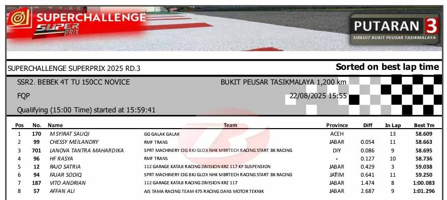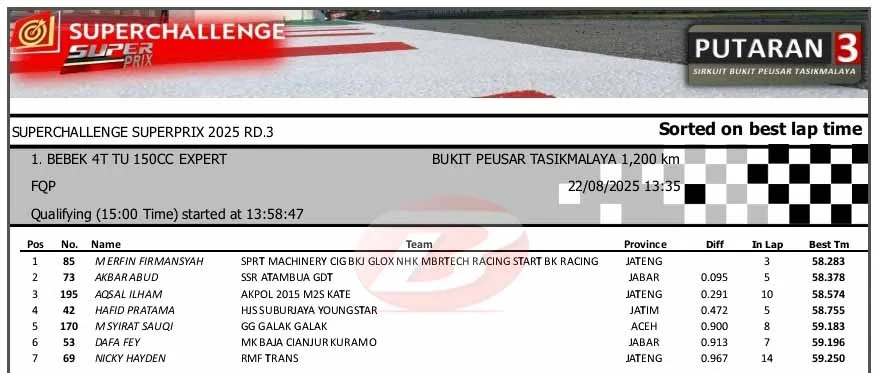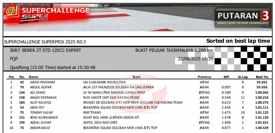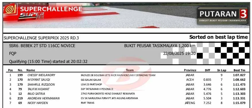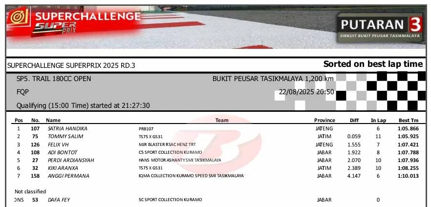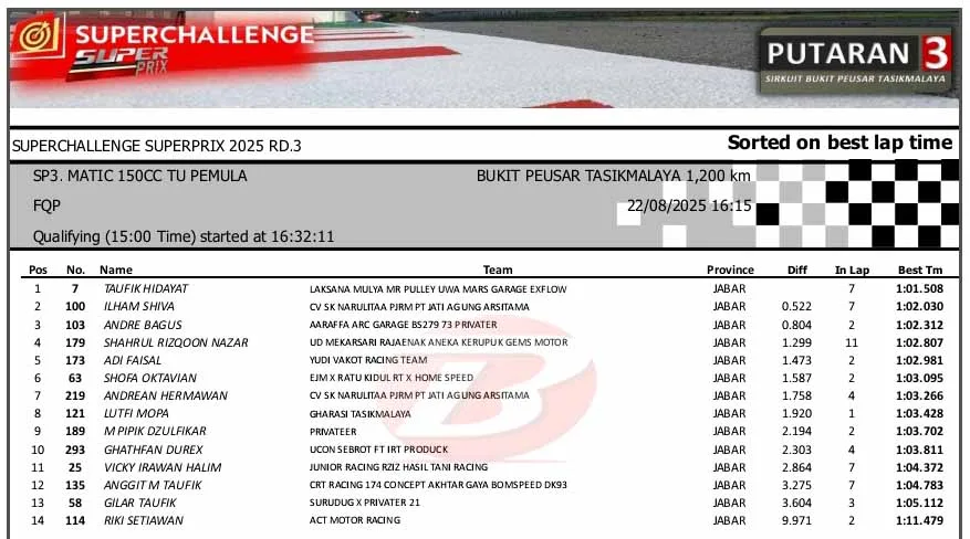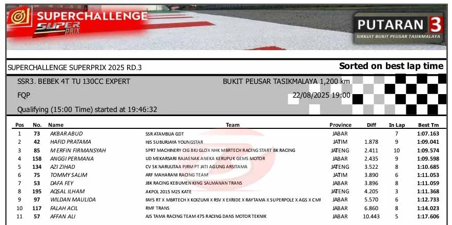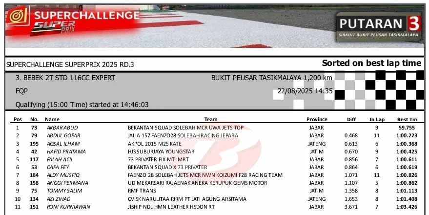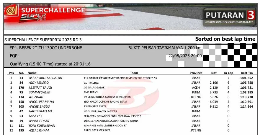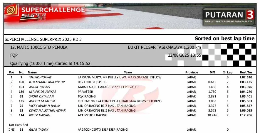 BalapMotor.Net – Berikut merupakan hasil sesi kualifikasi kejuaraan Superchallenge Super Prix Race putaran ketiga yang berlangsung di sirkuit Bukit Peusar, Tasikmalaya, Jawa Barat pada Jumat 22 Agustus 2025. (**)