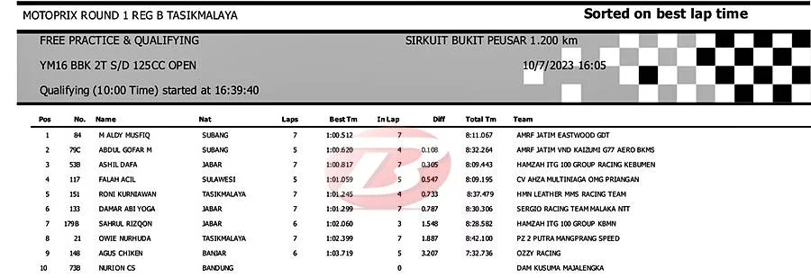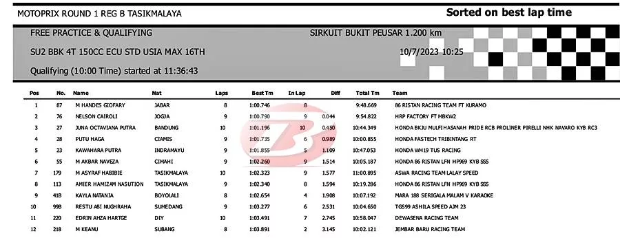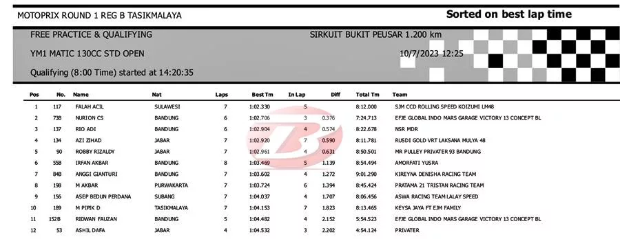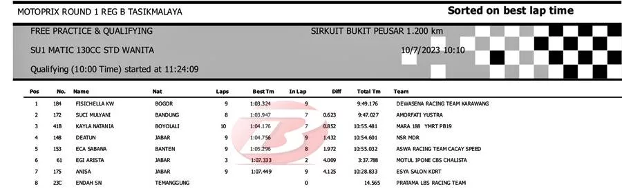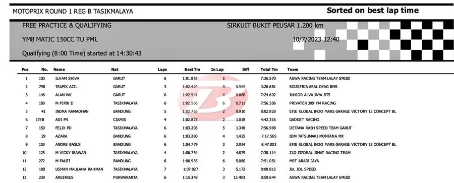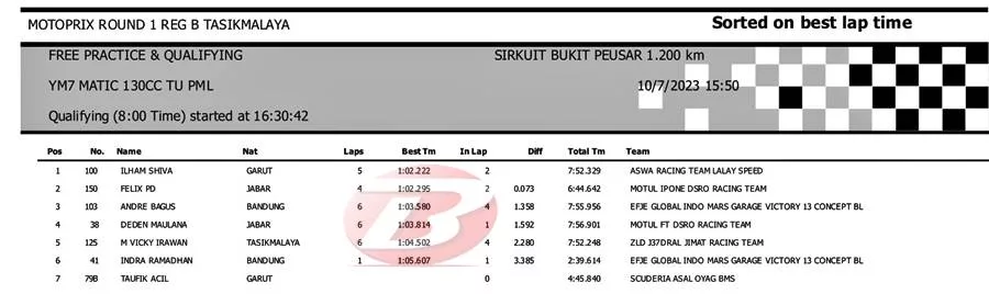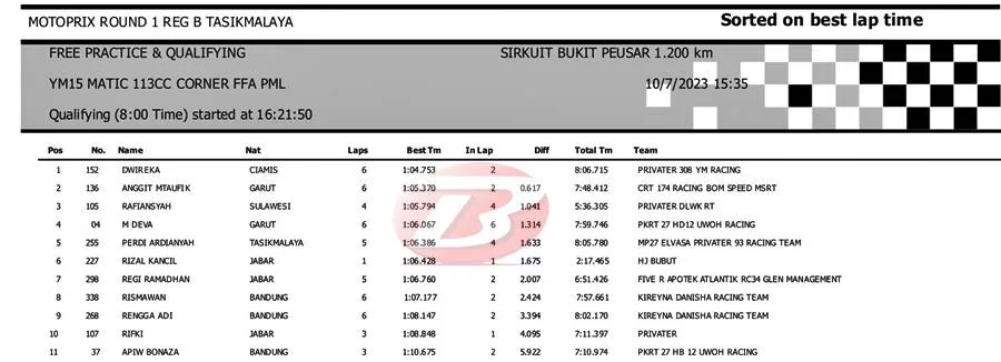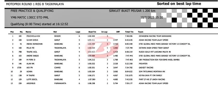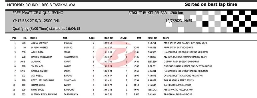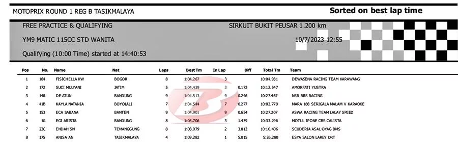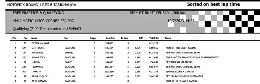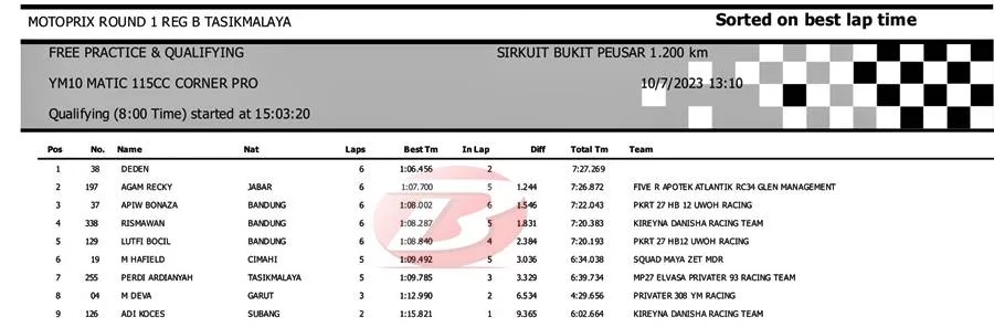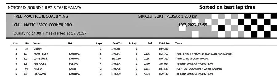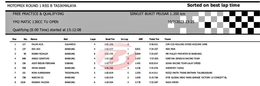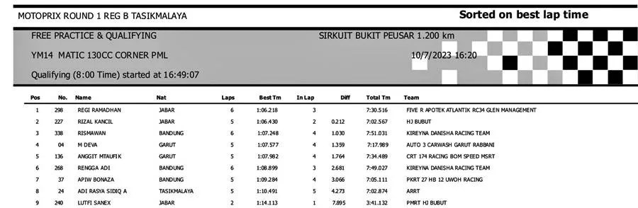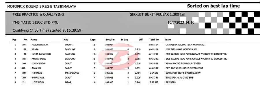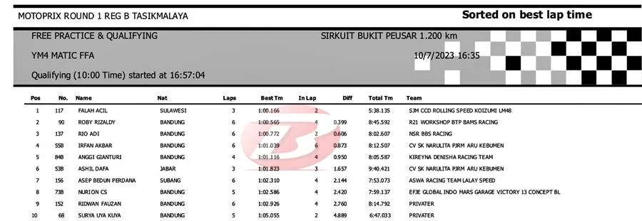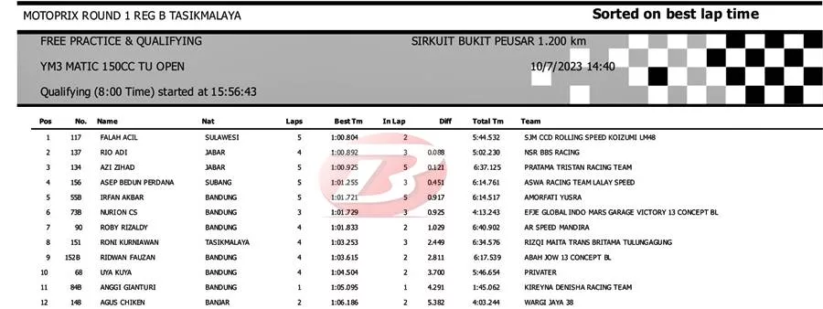 BalapMotor.Net – Berikut merupakan hasil kualifikasi (QTT) YM Matic Race Championship Round 3 yang digelar bersamaan dengan Kejurnas Motoprix Region B putaran 1 yang berlangsung di sirkuit Bukit Peusar, Tasikmalaya, Jawa Barat pada Sabtu 7 Oktober 2023. (***)
