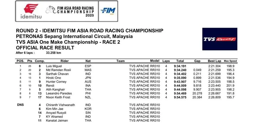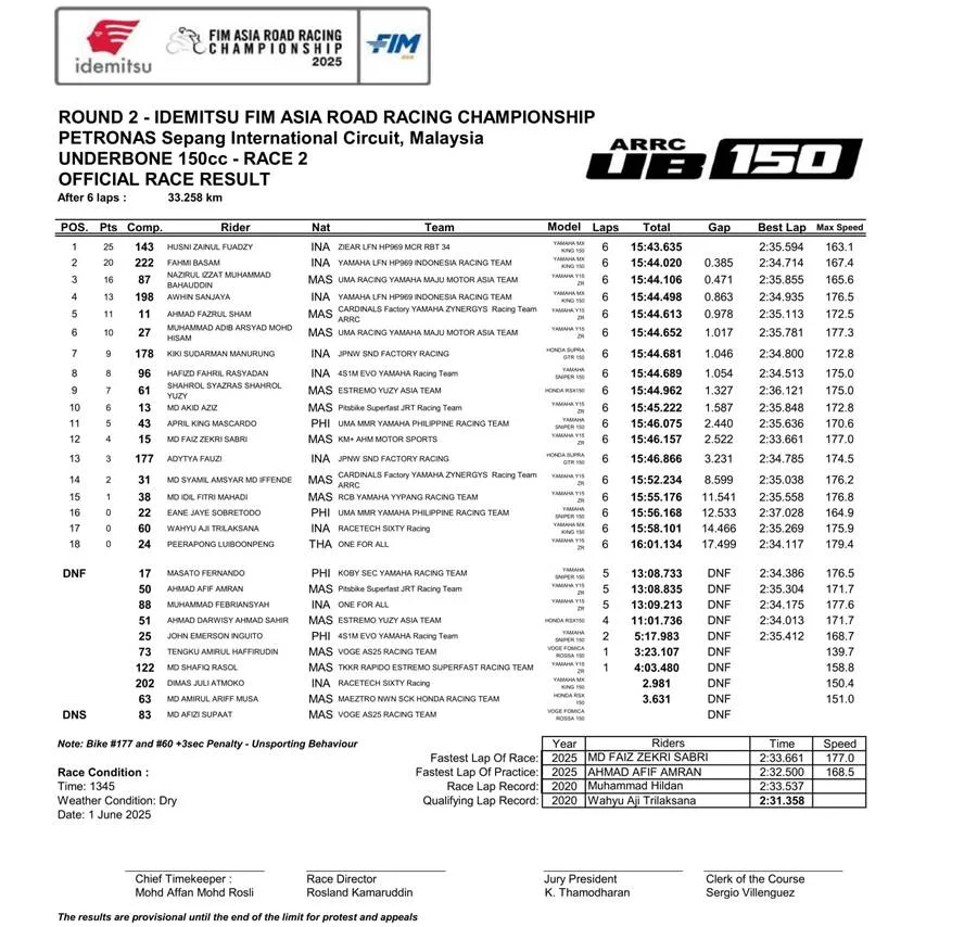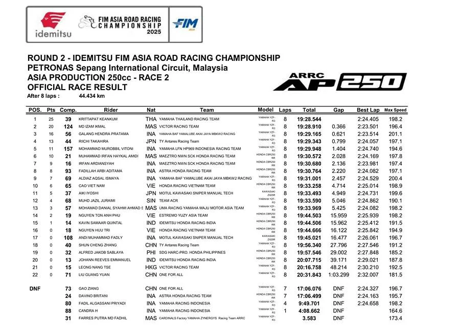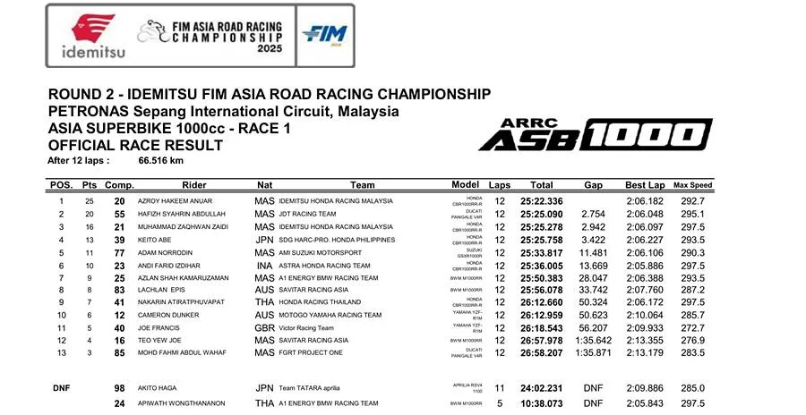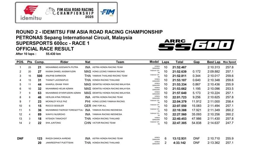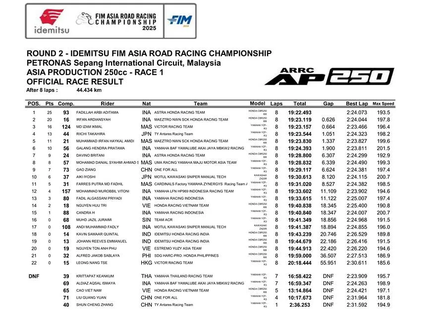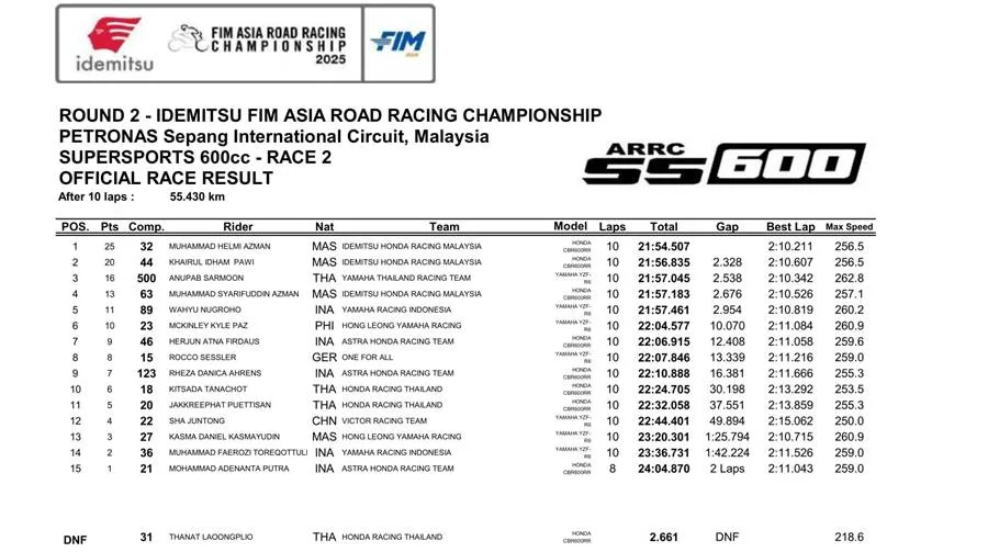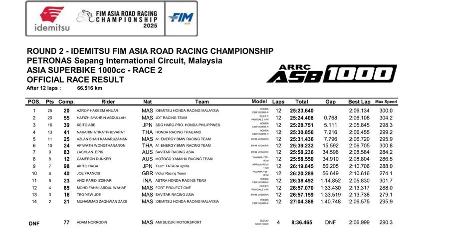 BalapMotor.Net – Berikut merupakan hasil lengkap race 1 dan race 2 kejuaraan Asia Road Racing Championship 2025 putaran kedua yang berlangsung di sirkuit Sepang, Malaysia pada 29-31 Mei 2025. (**)
