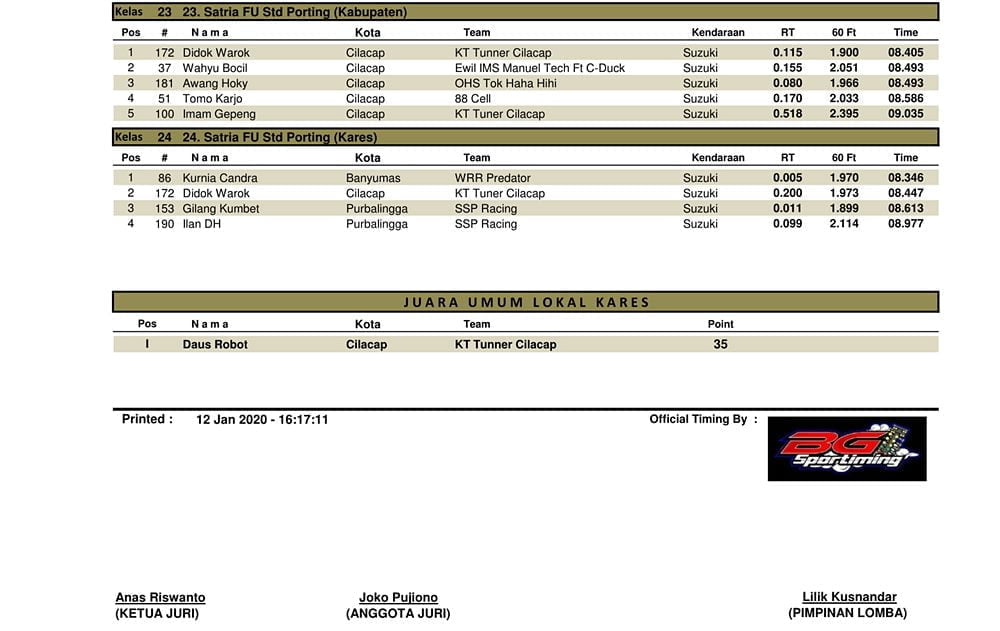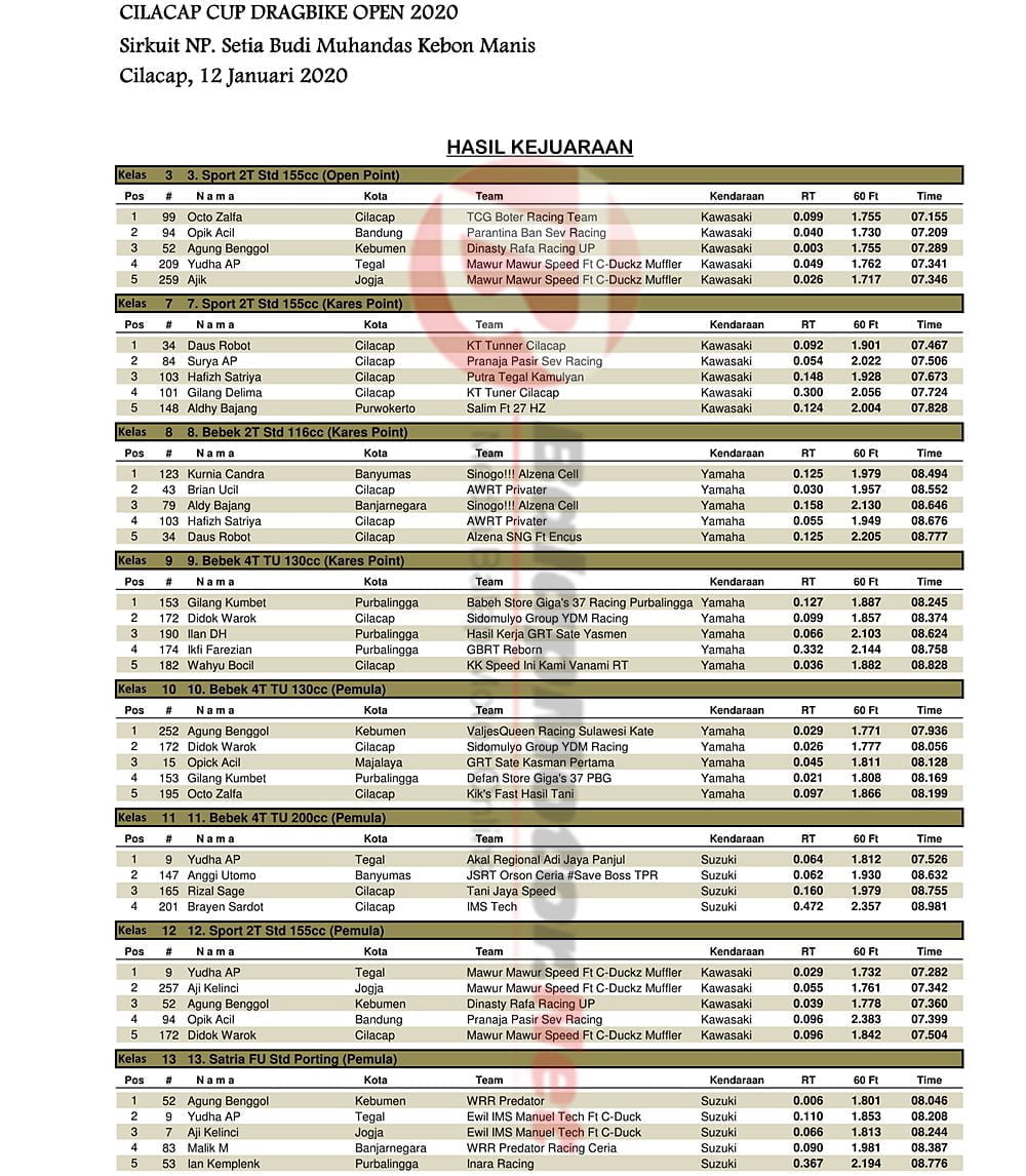 Hasil Lengkap Drag Bike Cilacap 12 Januari 2020