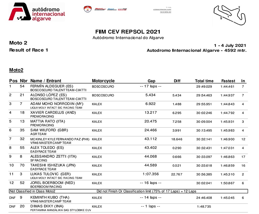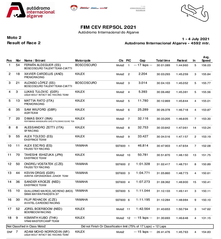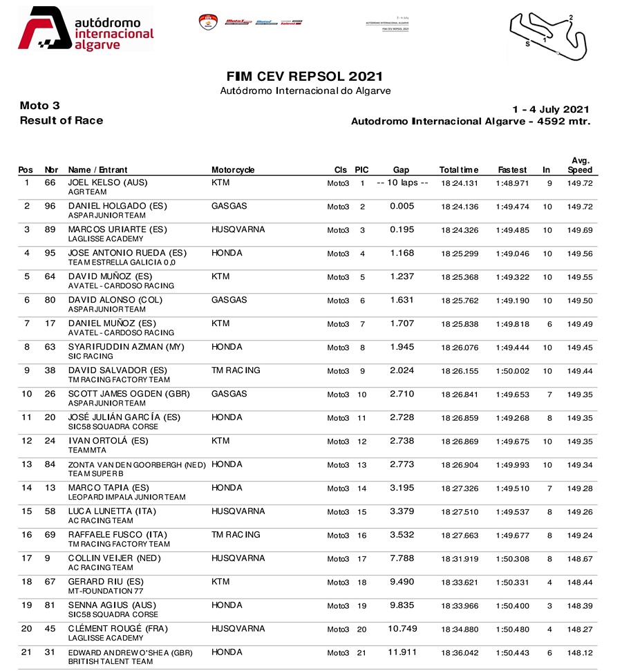 BalapMotor.Net –Berikut kami paparkan hasil kejuaraan FIM CEV Repsol Moto3 dan Moto2 yang berlangsung di sirkuit Autodromo Internacional do Algarve, Portugal pada Minggu, 4 Juli 2021.