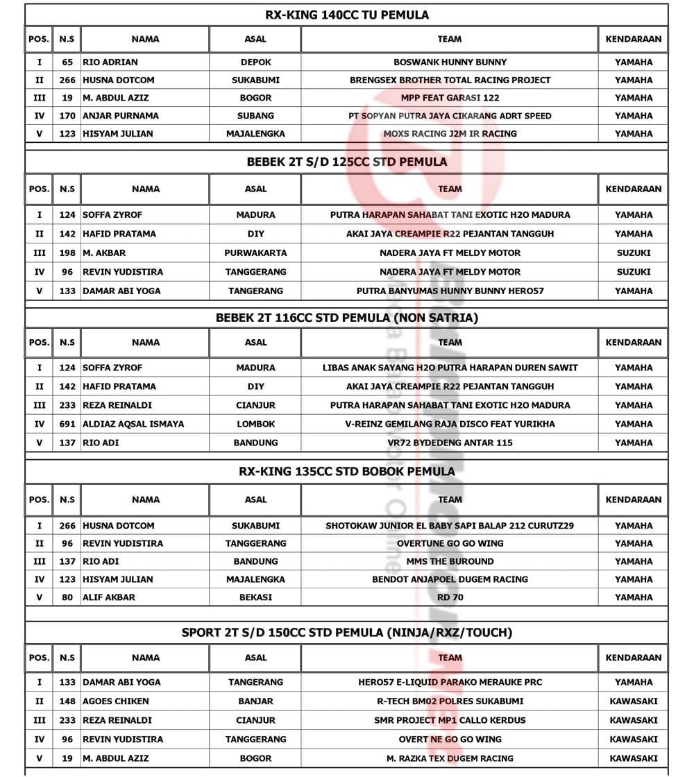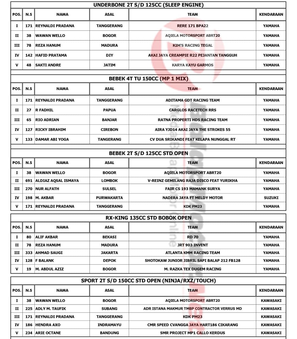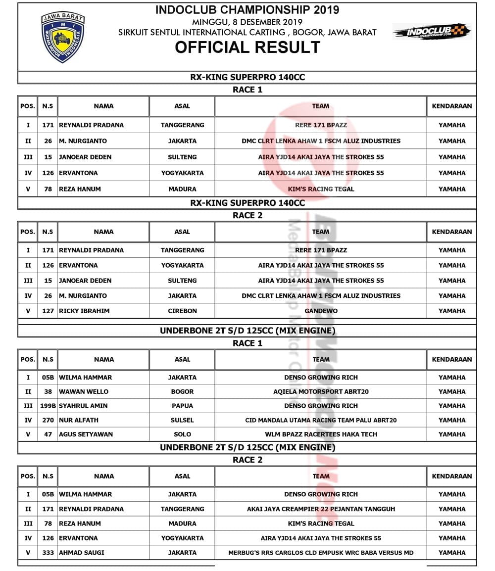 BalapMotor.Net – Berikut kami paparkan hasil lengkap putaran final Daytona Indoclub Championship 2019 yang berlangsung di sirkuit Sentul Karting, Bogor, Jawa Barat pada 8 Desember 2019. | Yugo