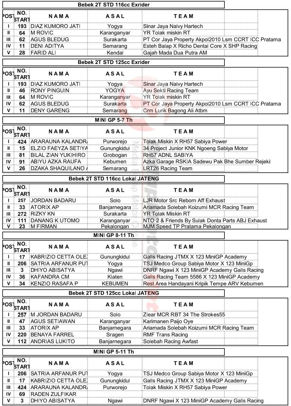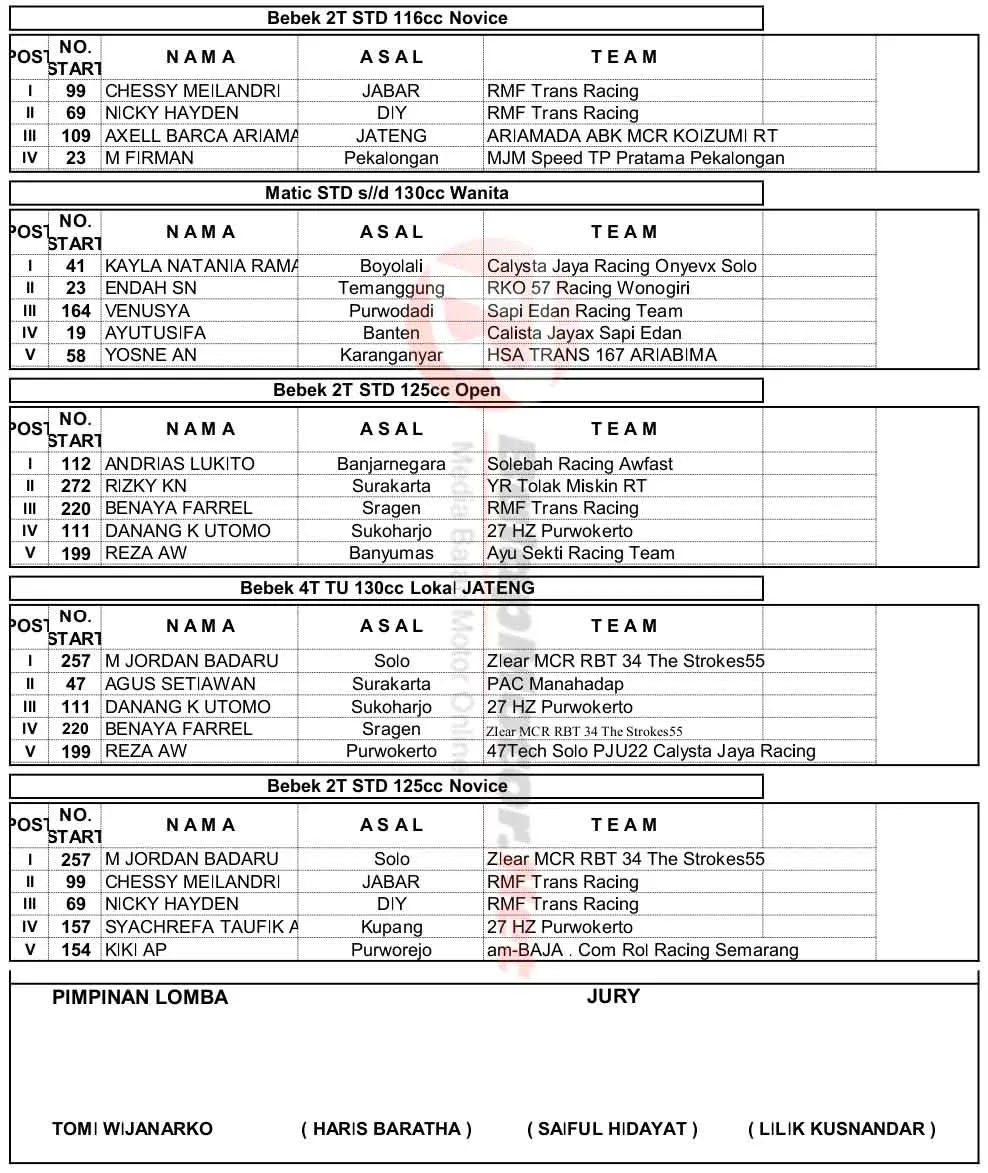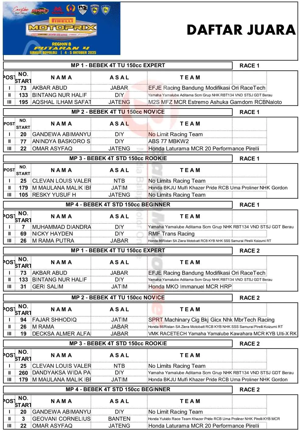 BalapMotor.Net – Berikut merupakan hasil juara Kejurnas Motoprix Region B putaran 4 yang berlangsung di sirkuit Gokart Boyolali, Jawa Tengah pada 4-5 Oktober 2025. (**)