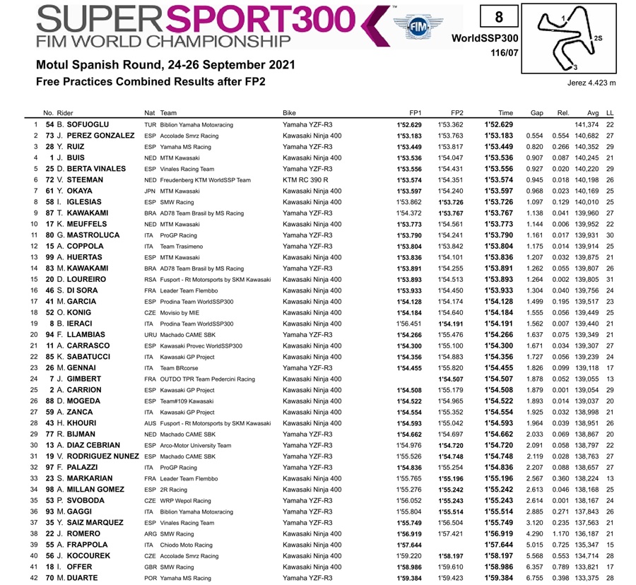 BalapMotor.Net – Berikut kami paparkan hasil kombinasi latihan bebas pertama dan kedua Kejuaraan Dunia Superbike, Supersport dan Supersport300 dalam Motul Spanish Round yang berlangsung di Circuito de Jerez – Angel Nieto pada Jumat, 24 September 2021.