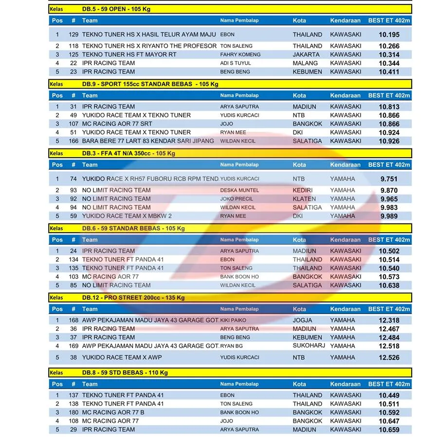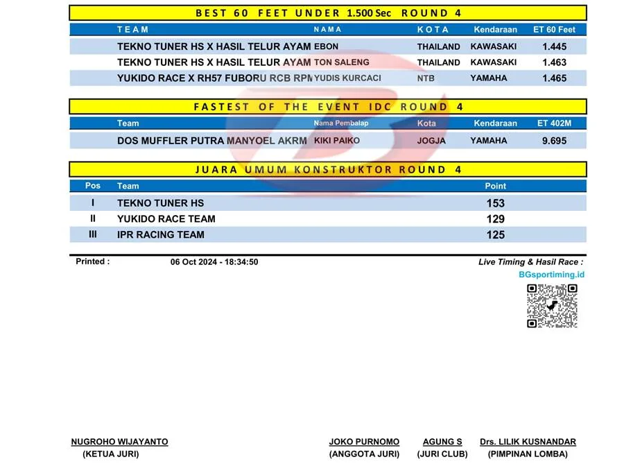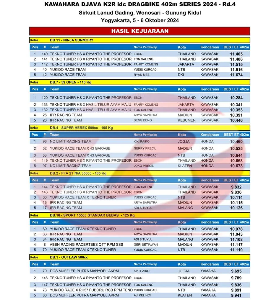 BalapMotor.Net – Berikut merupakan hasil lengkap kejuaraan balap lurus Kawahara Djava K2R IDC Drag Bike Championship 2024 kategori 402m putaran keempat yang berlangsung di sirkuit NP. Lanud Gading Wonosari, Yogyakarta pada 5 – 6 Oktober 2024. (***)