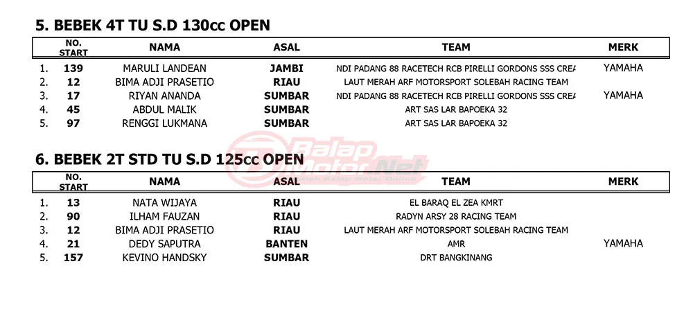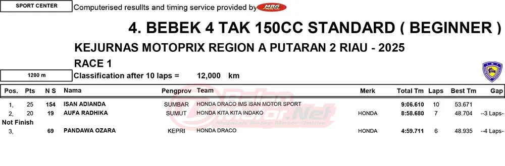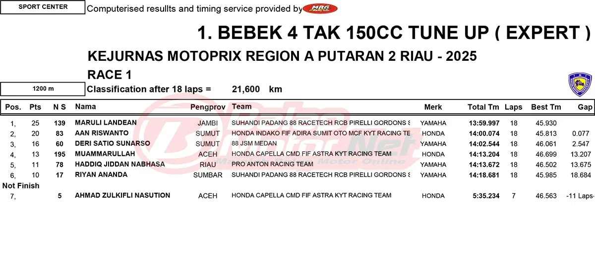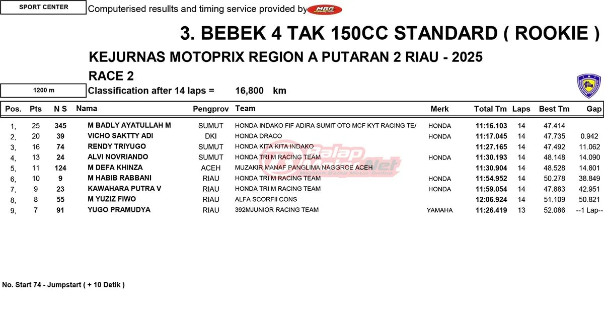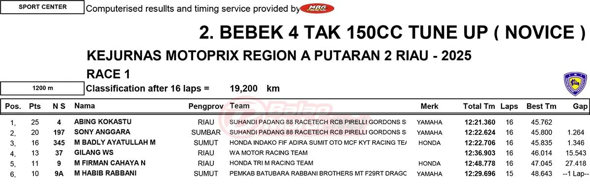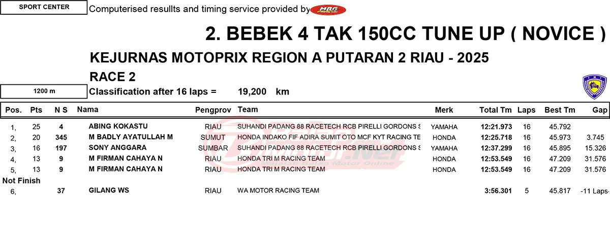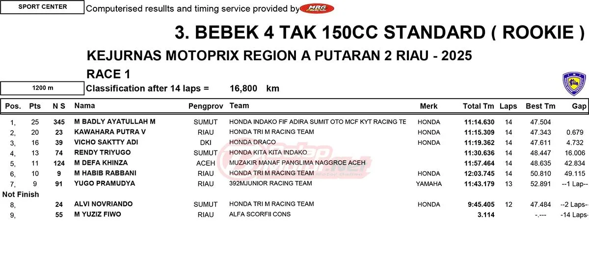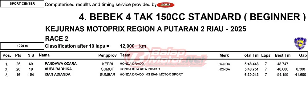 BalapMotor.Net – Berikut merupakan hasil race lengkap dari gelaran ronde 2 Kejurnas Motoprix Region A Sumatera 2025 yang berlangsung di sirkuit Sport Center Bangkinang, Kabupaten Kampar, Riau pada 24-25 Mei 2025. (Thamrin)