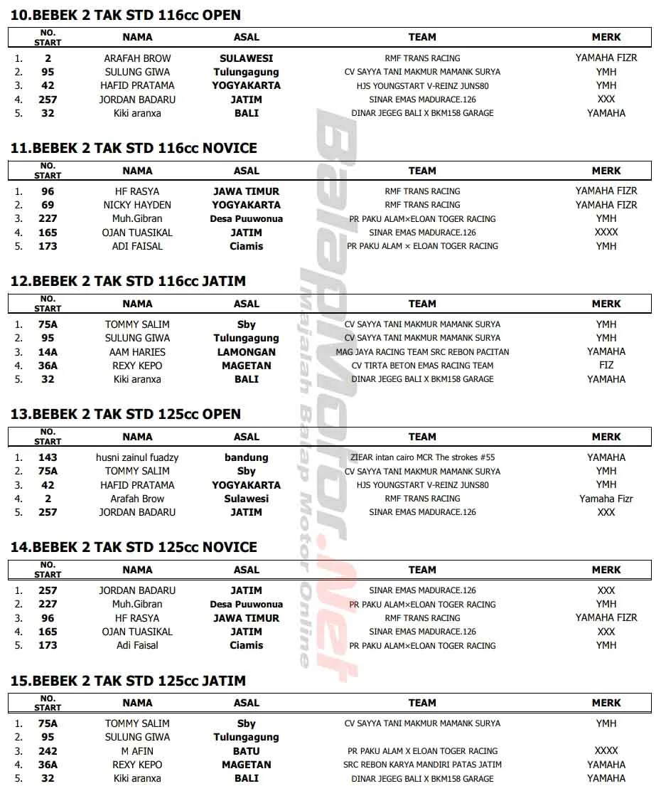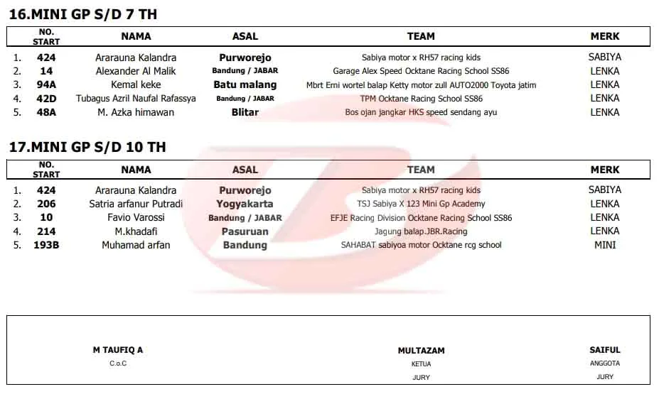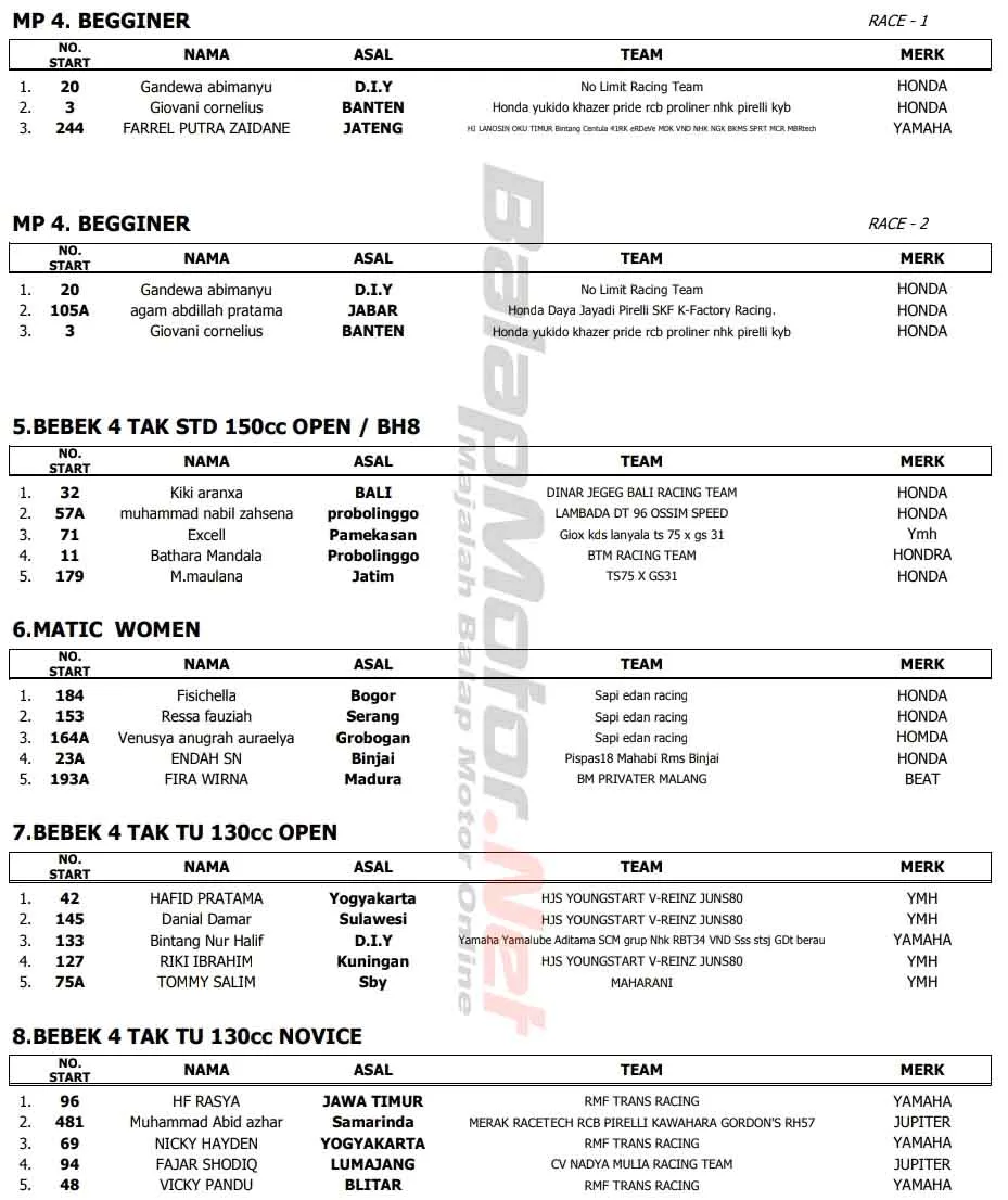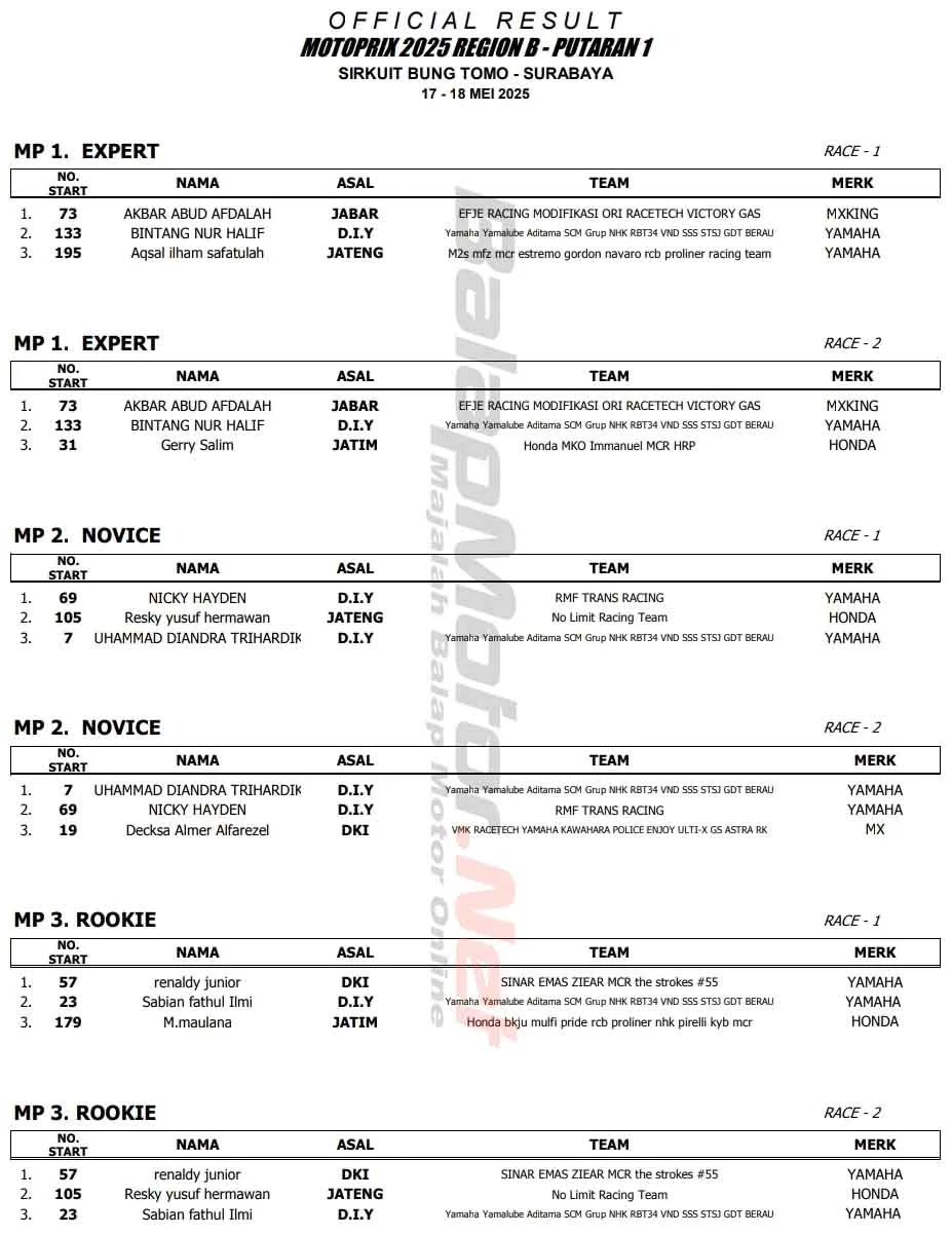 BalapMotor.Net – Berikut merupakan hasil keseluruhan kejuaraan nasional Motoprix Region B putaran pertama yang berlangsung di sirkuit Gelora Bung Tomo (GBT) Surabaya pada 17-18 Mei 2025. (**)