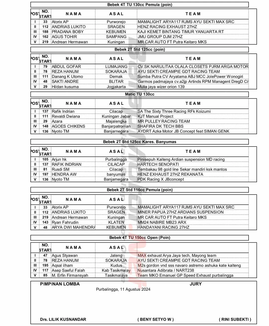 BalapMotor.Net – Berikut merupakan hasil lengkap juara Kejurprov Jateng Casytha Manahadap Road Race Championship 2024 putaran kedua yang berlangsung di sirkuit NP. Alun-alun Purbalingga, Jawa Tengah pada 10-11 Agustus 2024. (***)