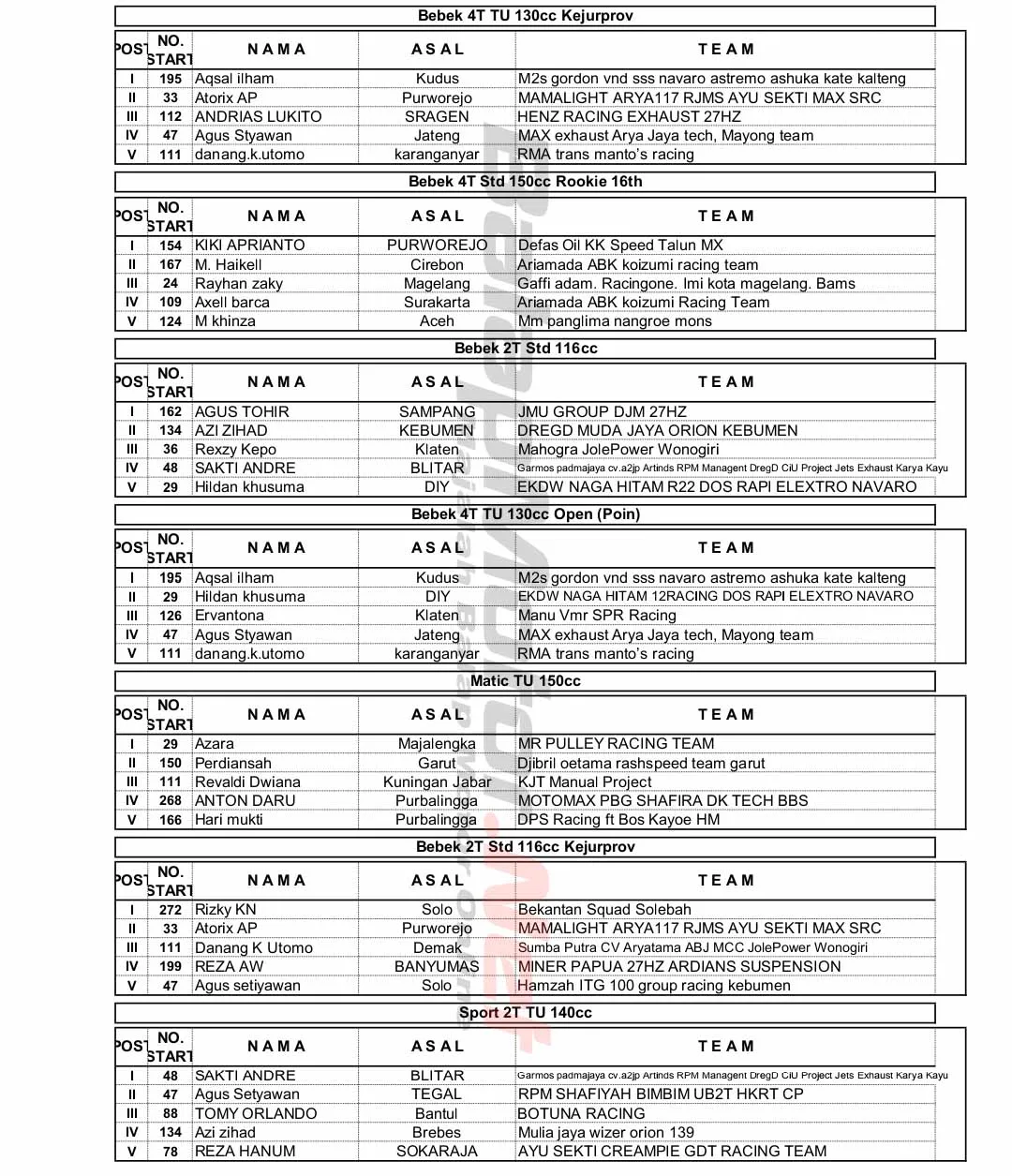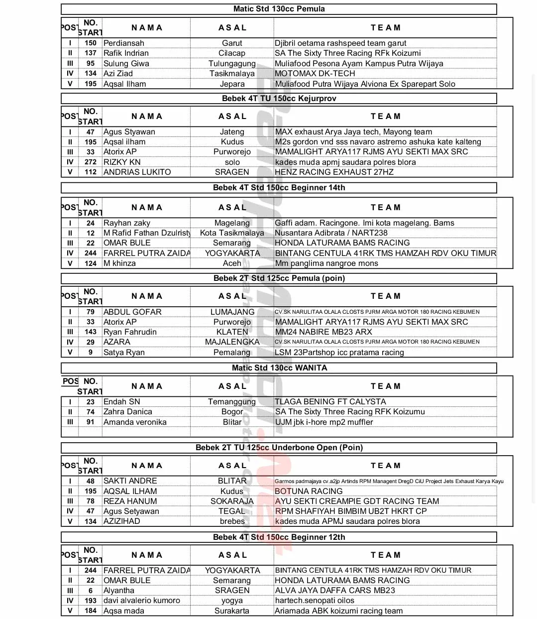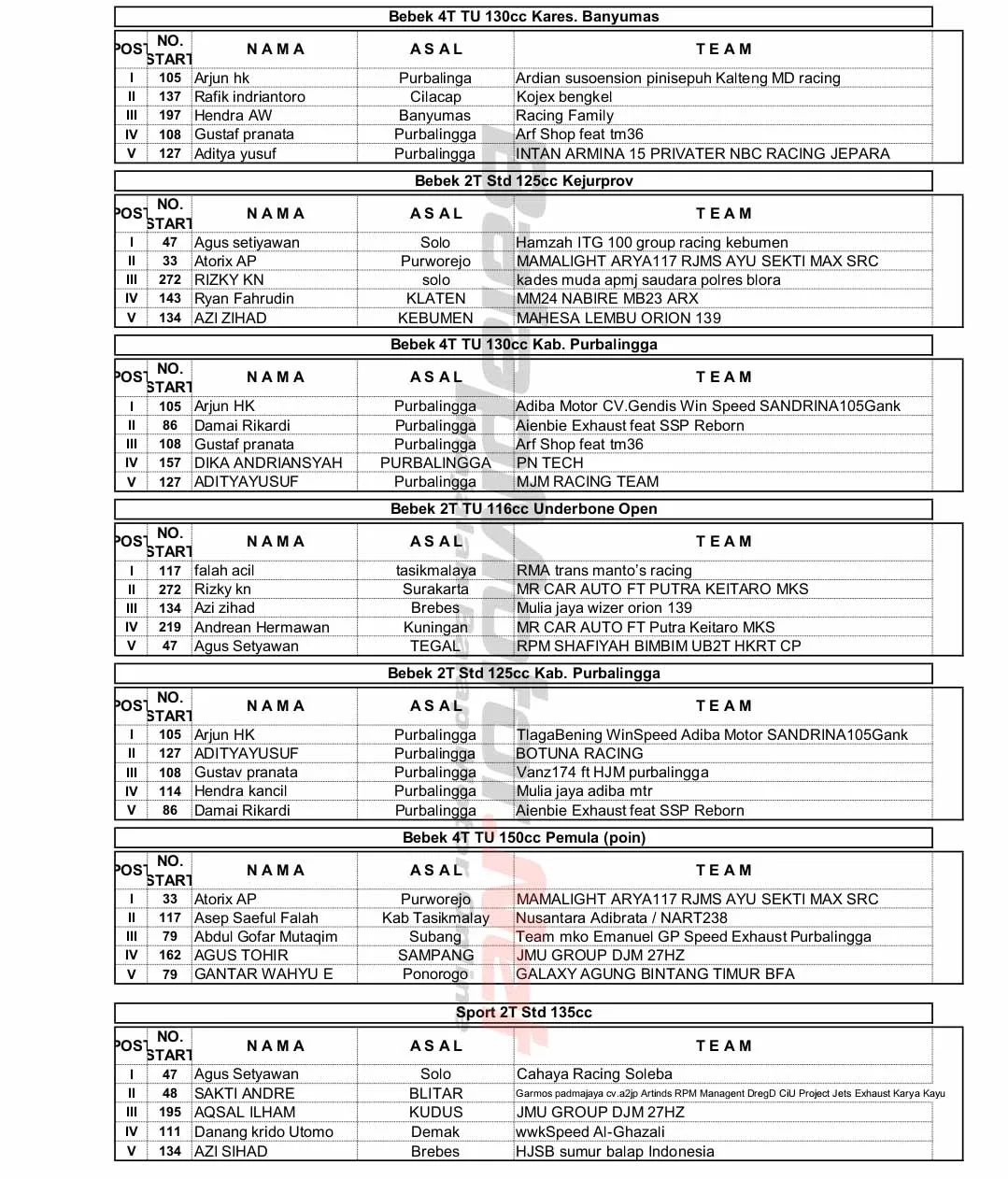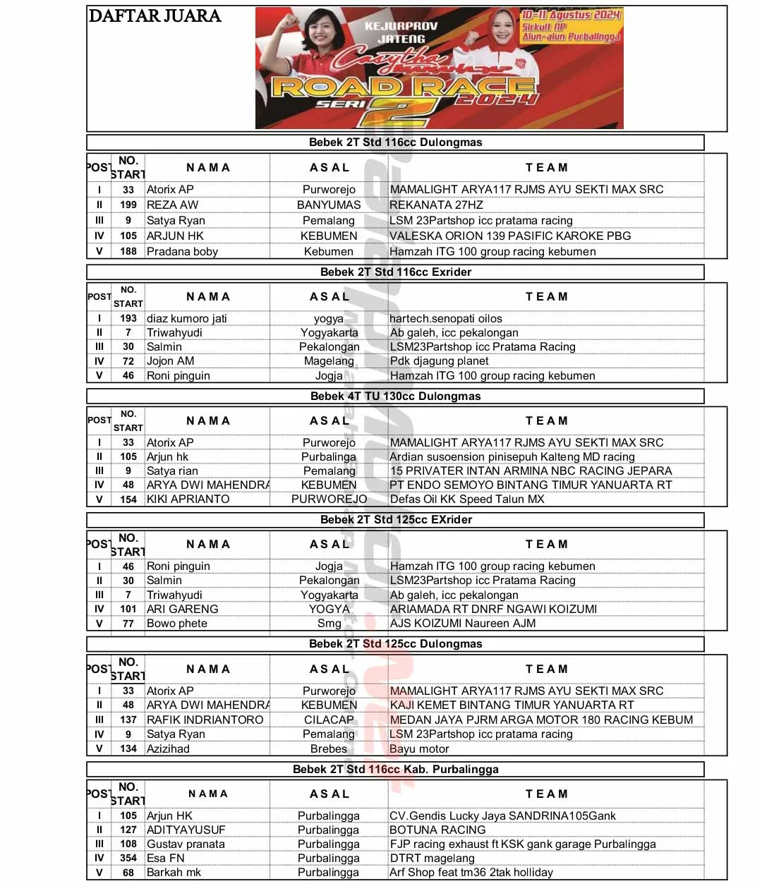 BalapMotor.Net – Berikut merupakan hasil lengkap juara Kejurprov Jateng Casytha Manahadap Road Race Championship 2024 putaran kedua yang berlangsung di sirkuit NP. Alun-alun Purbalingga, Jawa Tengah pada 10-11 Agustus 2024. (***)