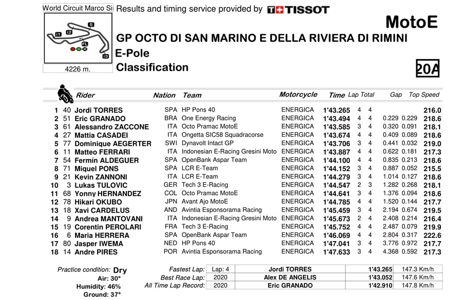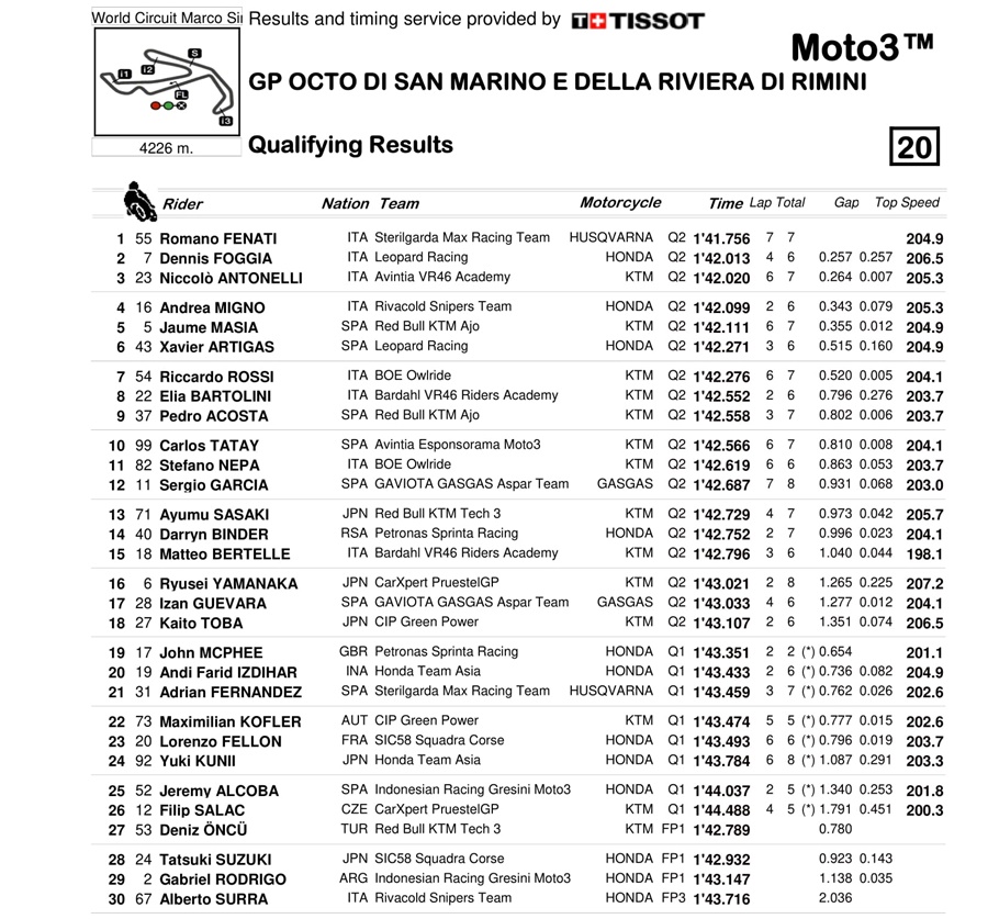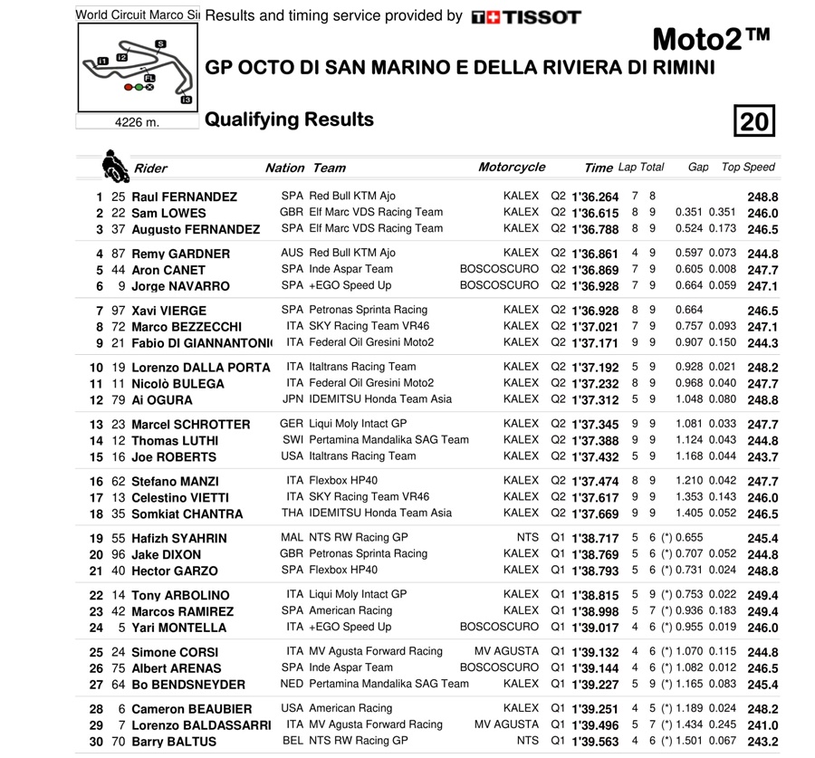 BalapMotor.Net – Berikut kami paparkan hasil lengkap kualifikasi Moto3, Moto3, MotoGP dan MotoE yang berlangsung di sirkuit Dunia Misano, San Marino pada Sabtu 18 September 2021.