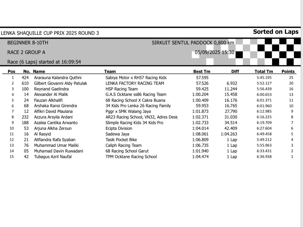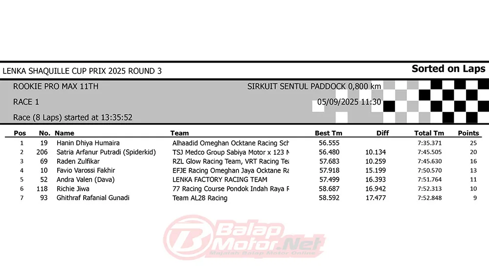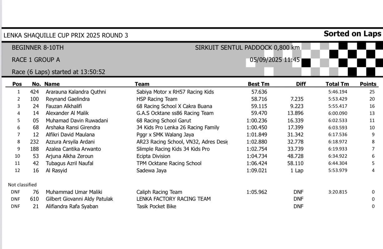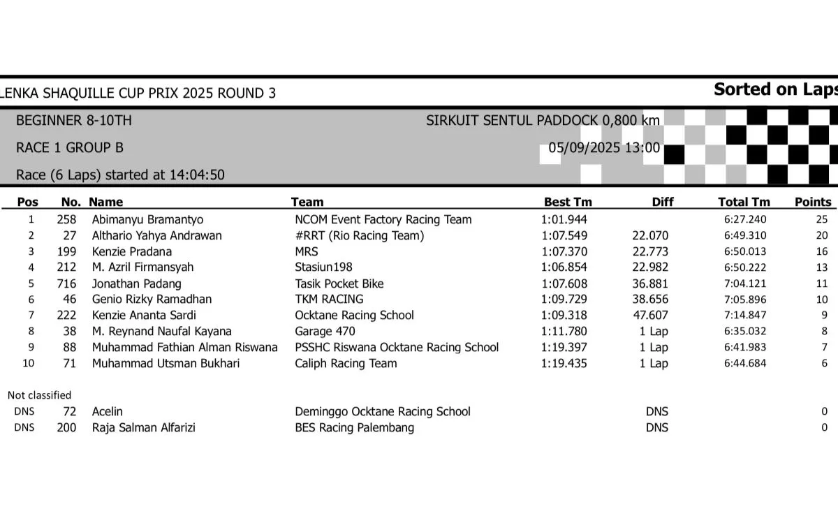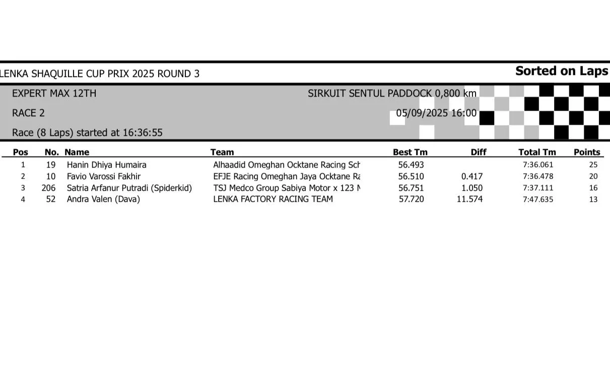 BalapMotor.Net – Berikut merupakan hasil race lengkap dari gelaran seri 3 LENKA Shaquille Aldy Jaya Cup Prix 2025 yang berlangsung di sirkuit Sentul Paddock, Bogor pada hari Jumat 5 September 2025 (**)