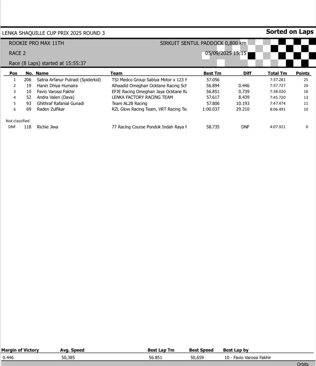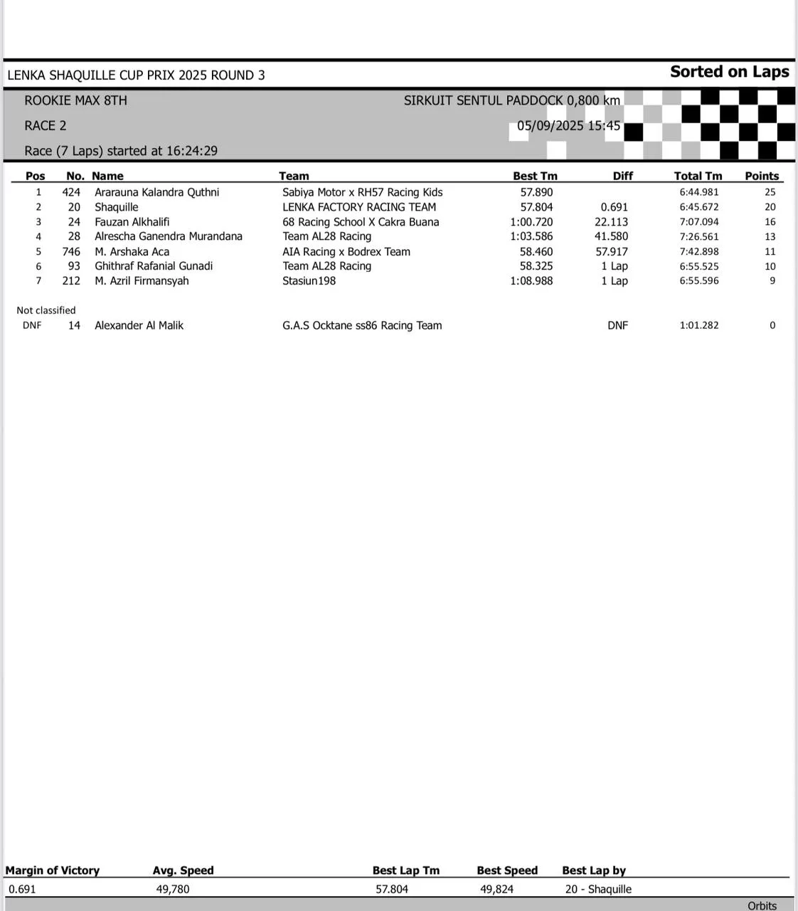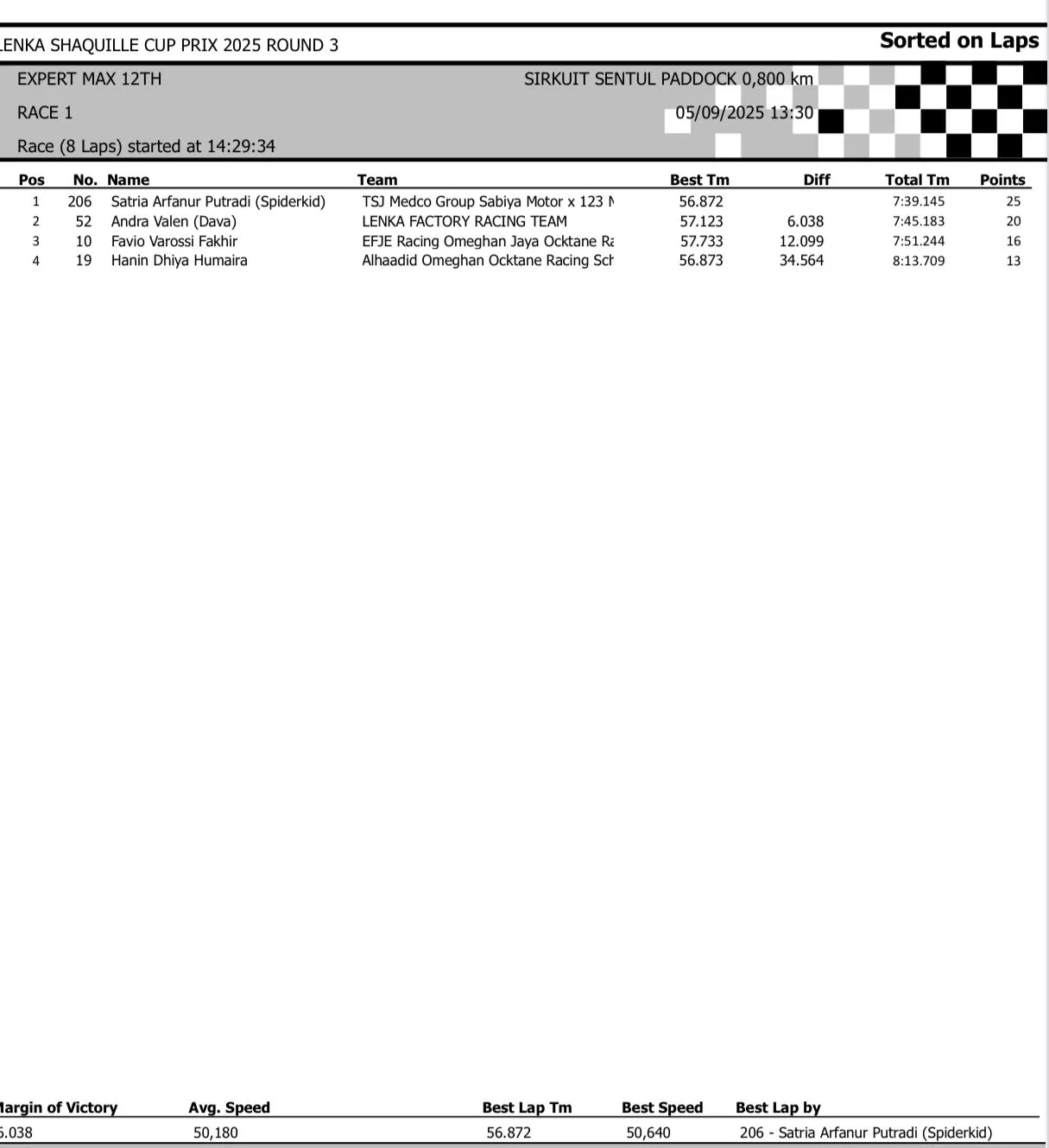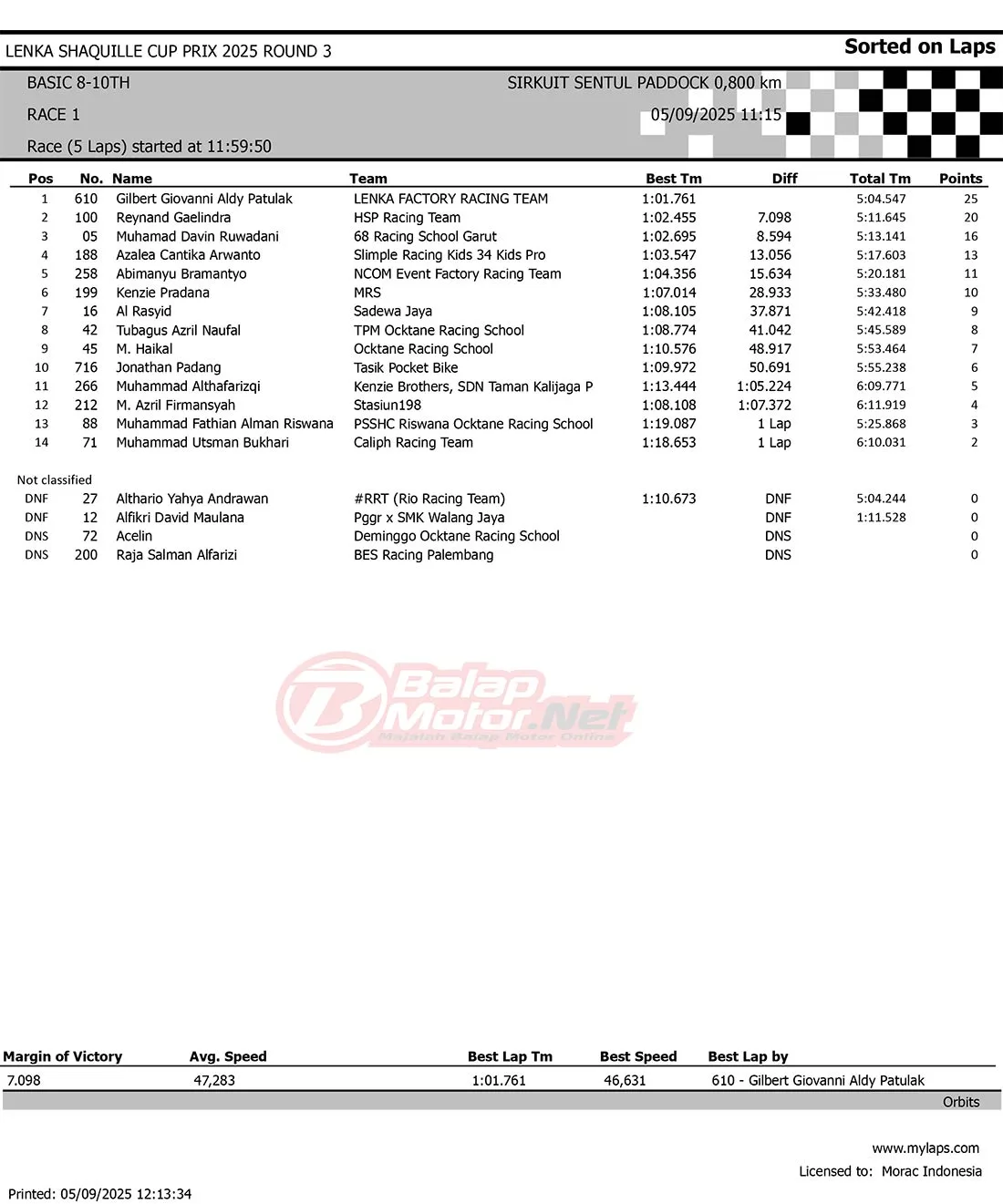 BalapMotor.Net – Berikut merupakan hasil race lengkap dari gelaran seri 3 LENKA Shaquille Aldy Jaya Cup Prix 2025 yang berlangsung di sirkuit Sentul Paddock, Bogor pada hari Jumat 5 September 2025 (**)