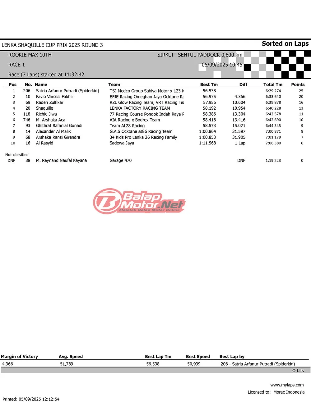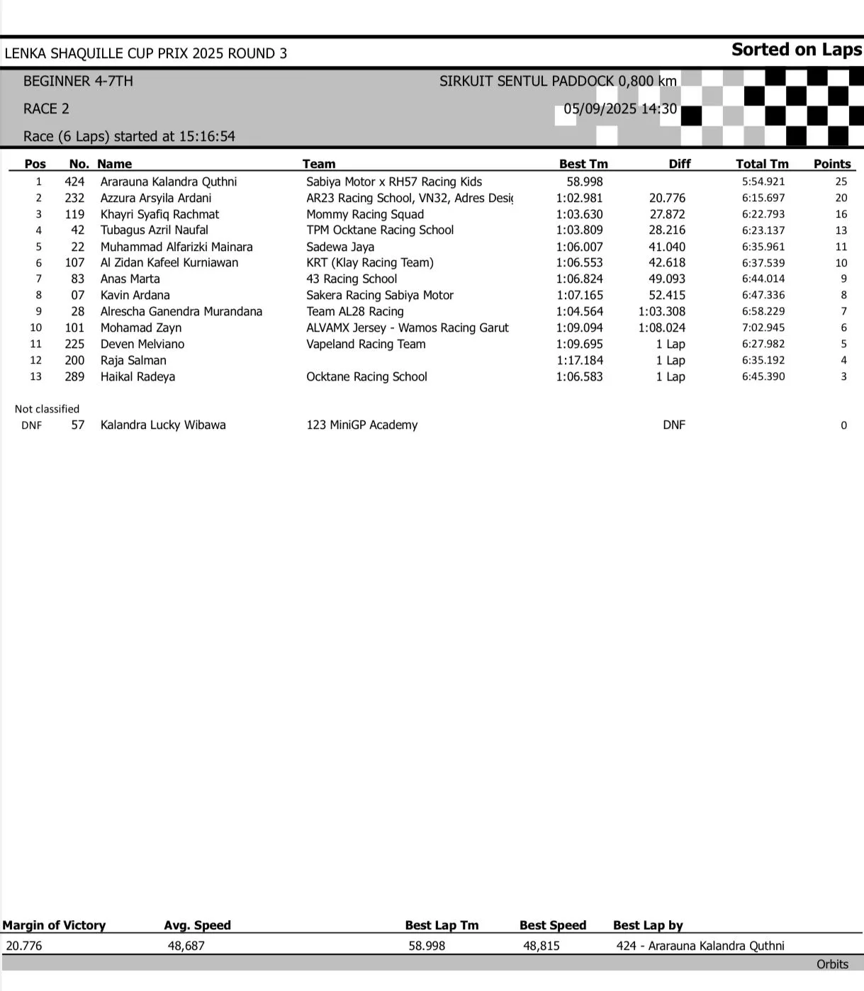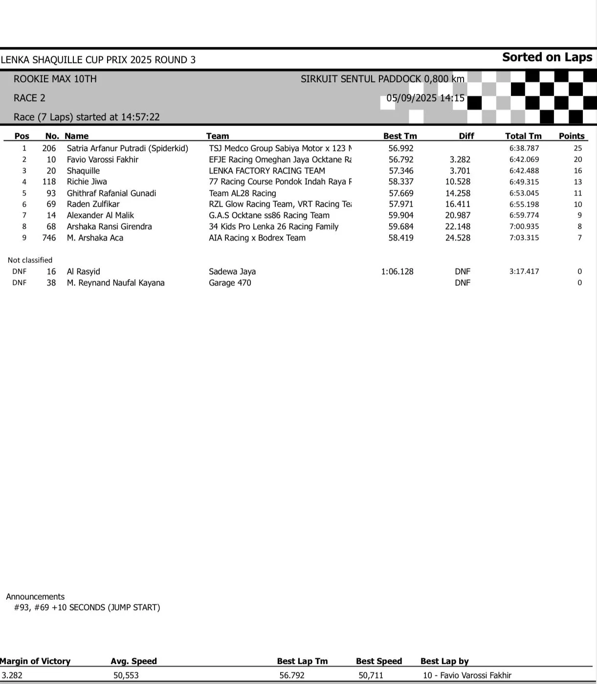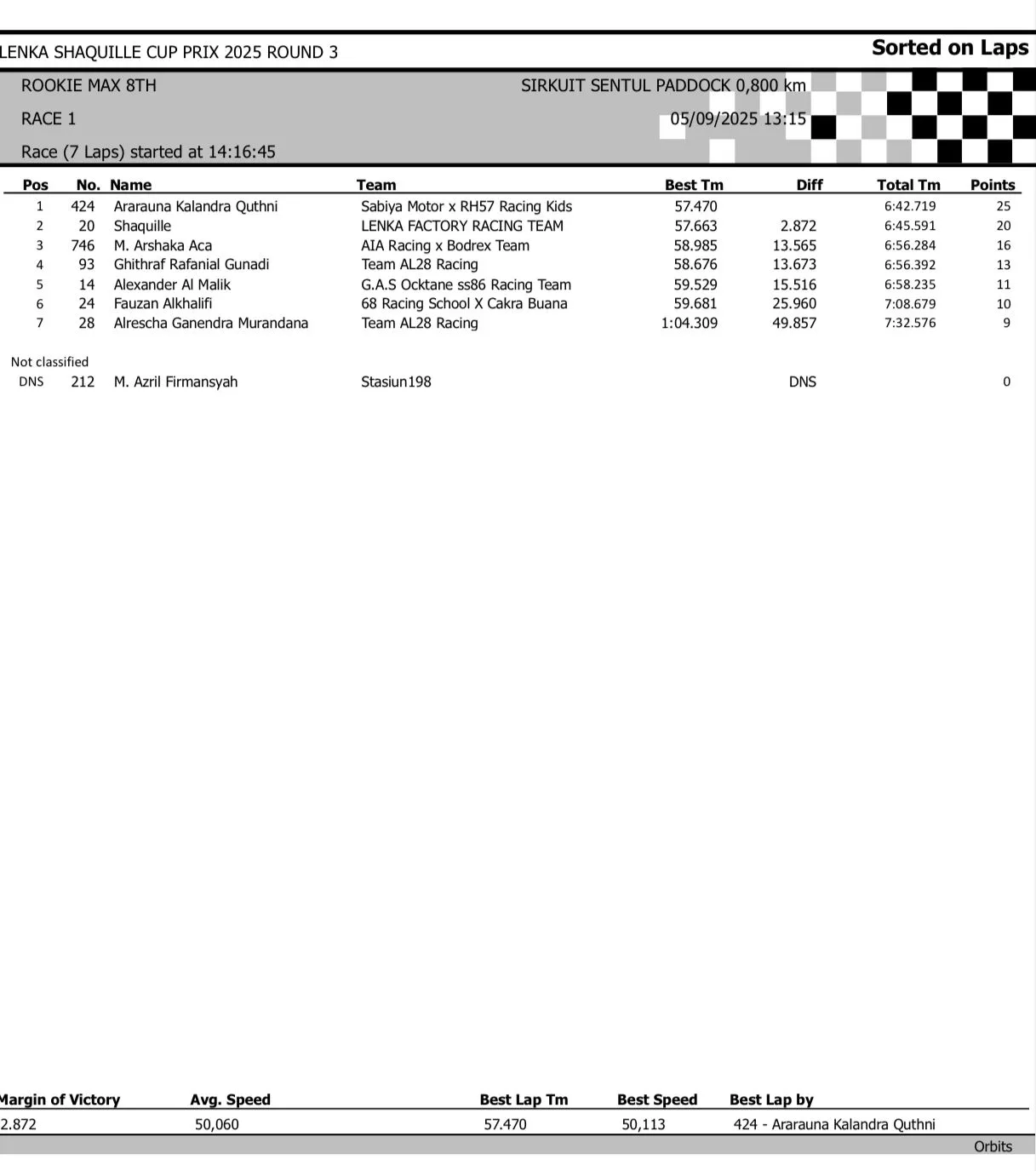 BalapMotor.Net – Berikut merupakan hasil race lengkap dari gelaran seri 3 LENKA Shaquille Aldy Jaya Cup Prix 2025 yang berlangsung di sirkuit Sentul Paddock, Bogor pada hari Jumat 5 September 2025 (**)