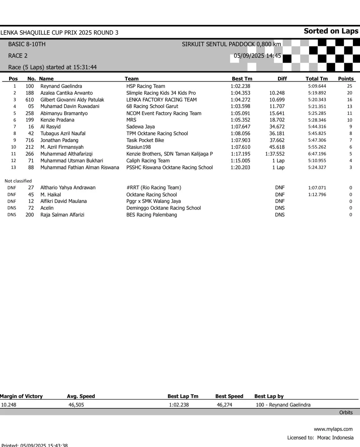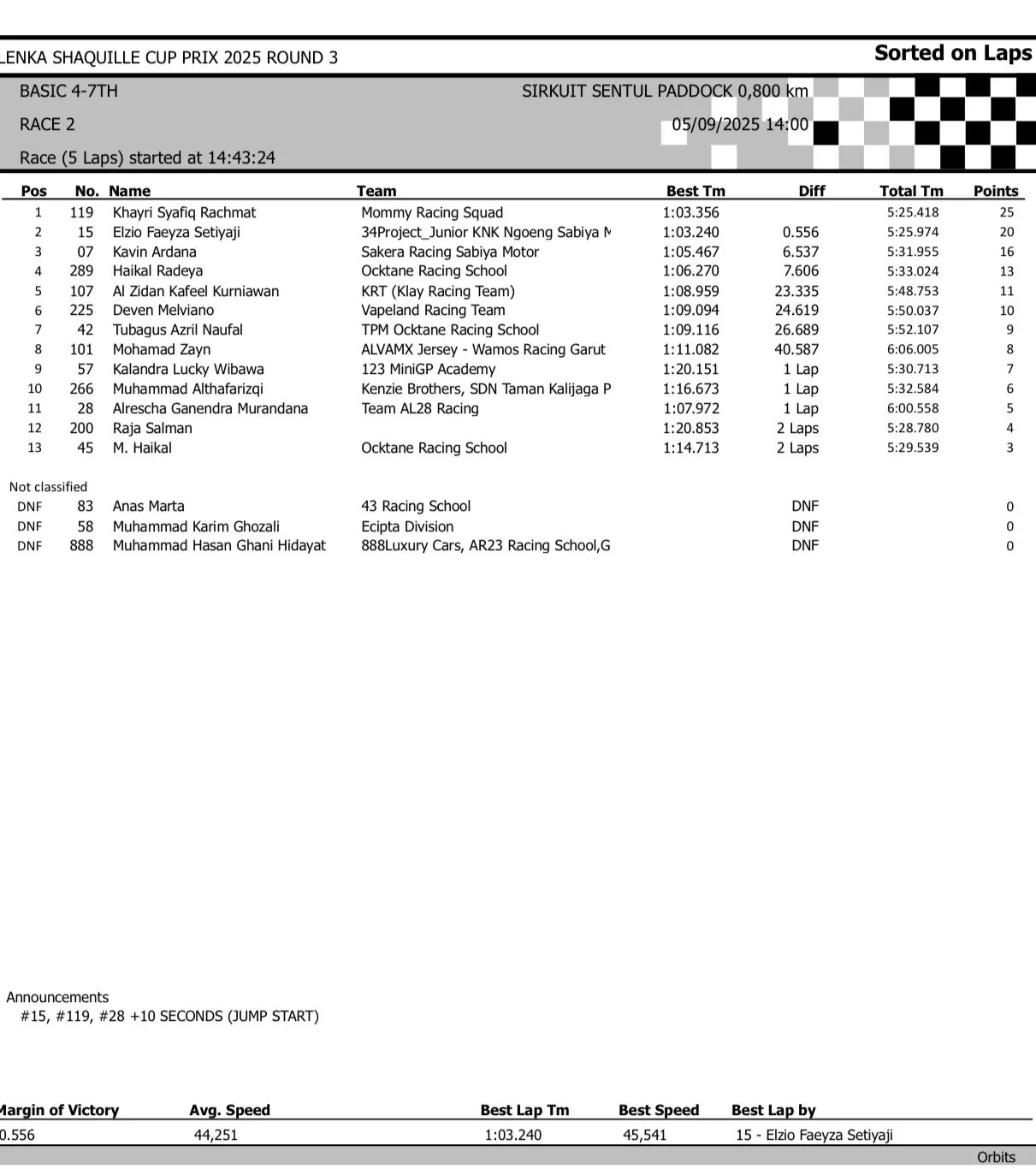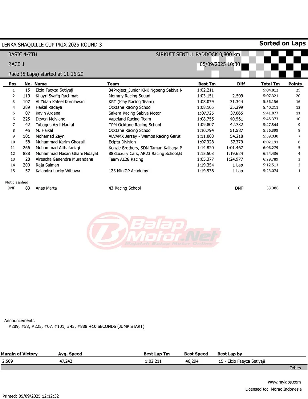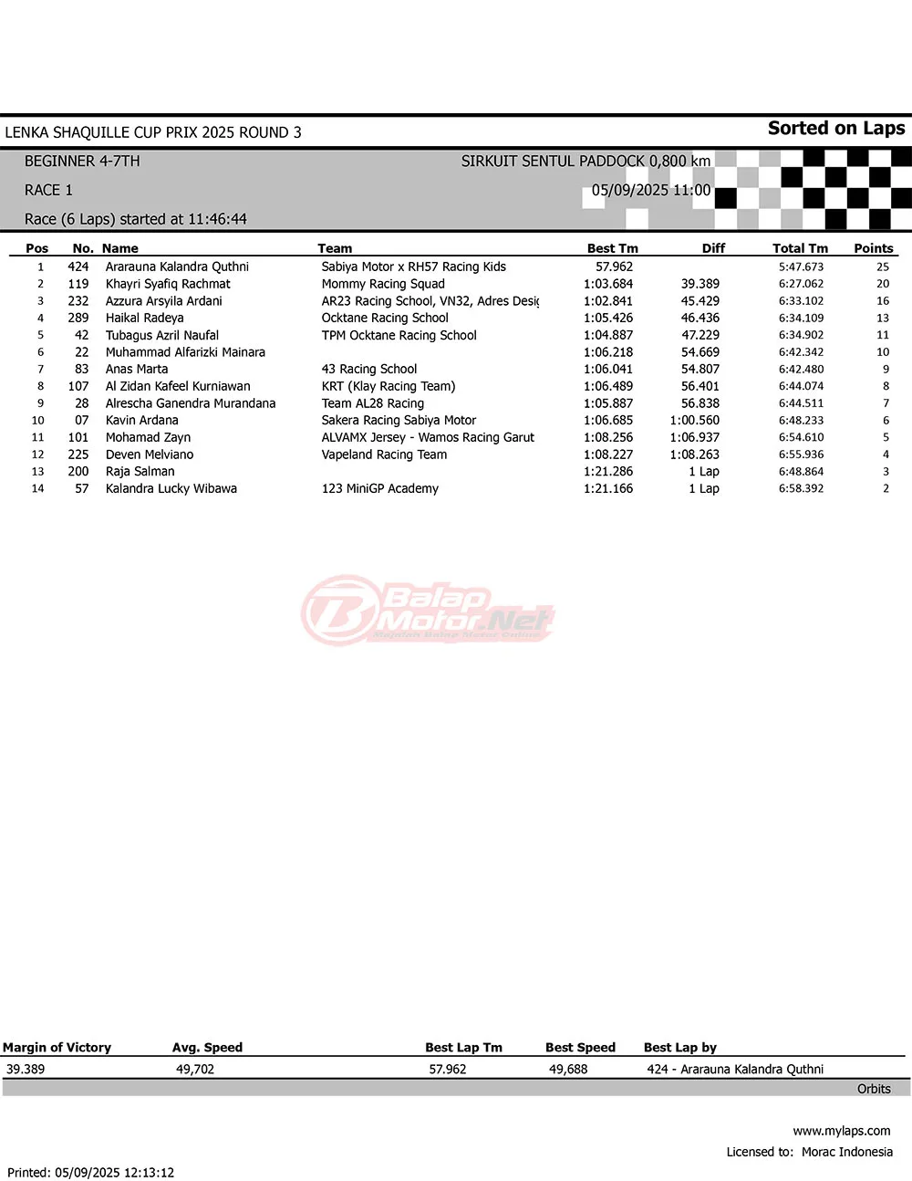 BalapMotor.Net – Berikut merupakan hasil race lengkap dari gelaran seri 3 LENKA Shaquille Aldy Jaya Cup Prix 2025 yang berlangsung di sirkuit Sentul Paddock, Bogor pada hari Jumat 5 September 2025 (**)