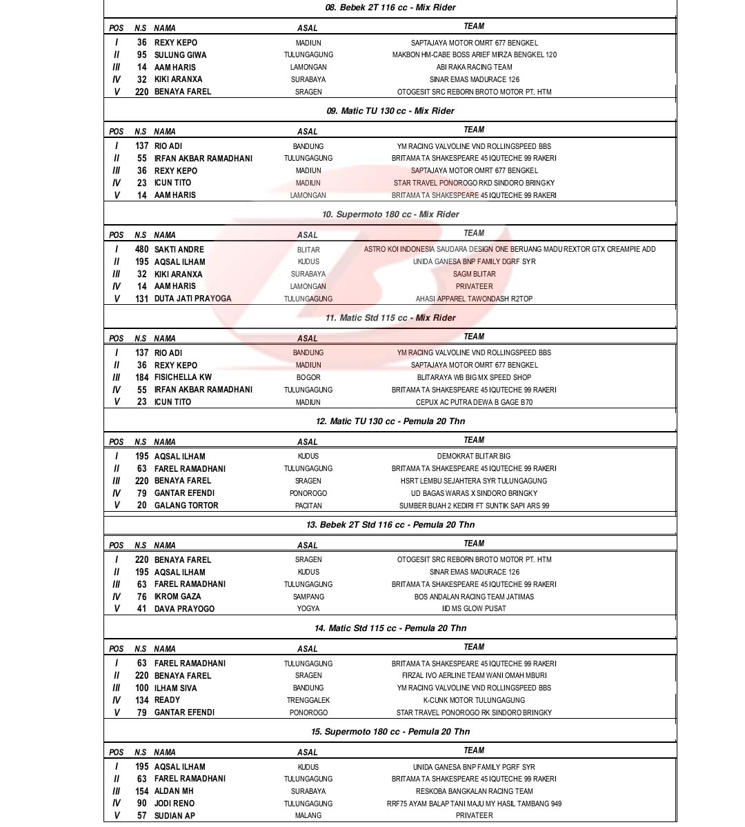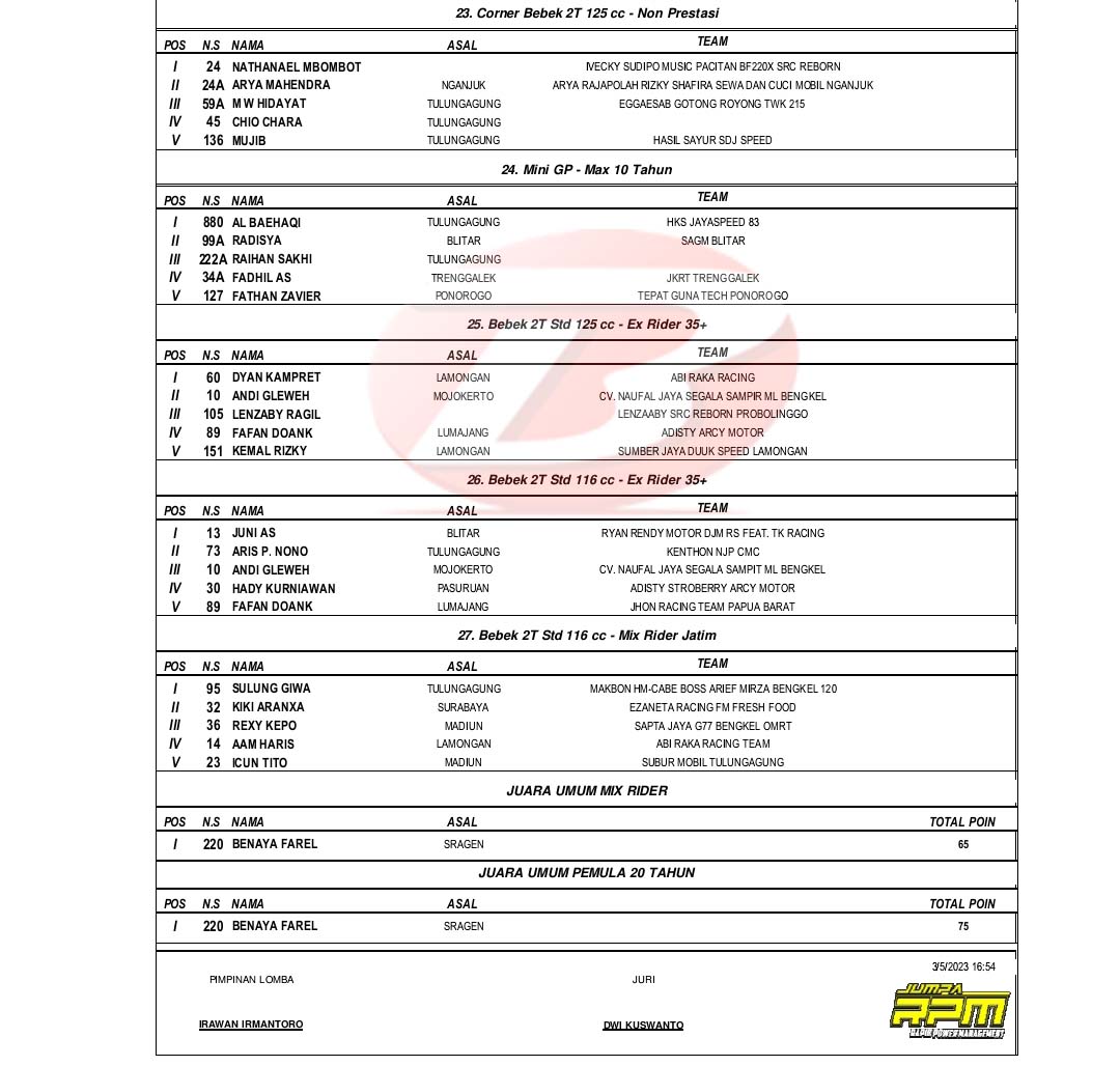 BalapMotor.Net – Berikut merupakan hasil lengkap kejuaraan balap motor bertajuk Matapanah Cup Race (MCR) yang berlangsung di sirkuit NP. GOR Lembu Peteng, Tulungagung, Jawa Timur pada 4-5 Maret 2023. (***)