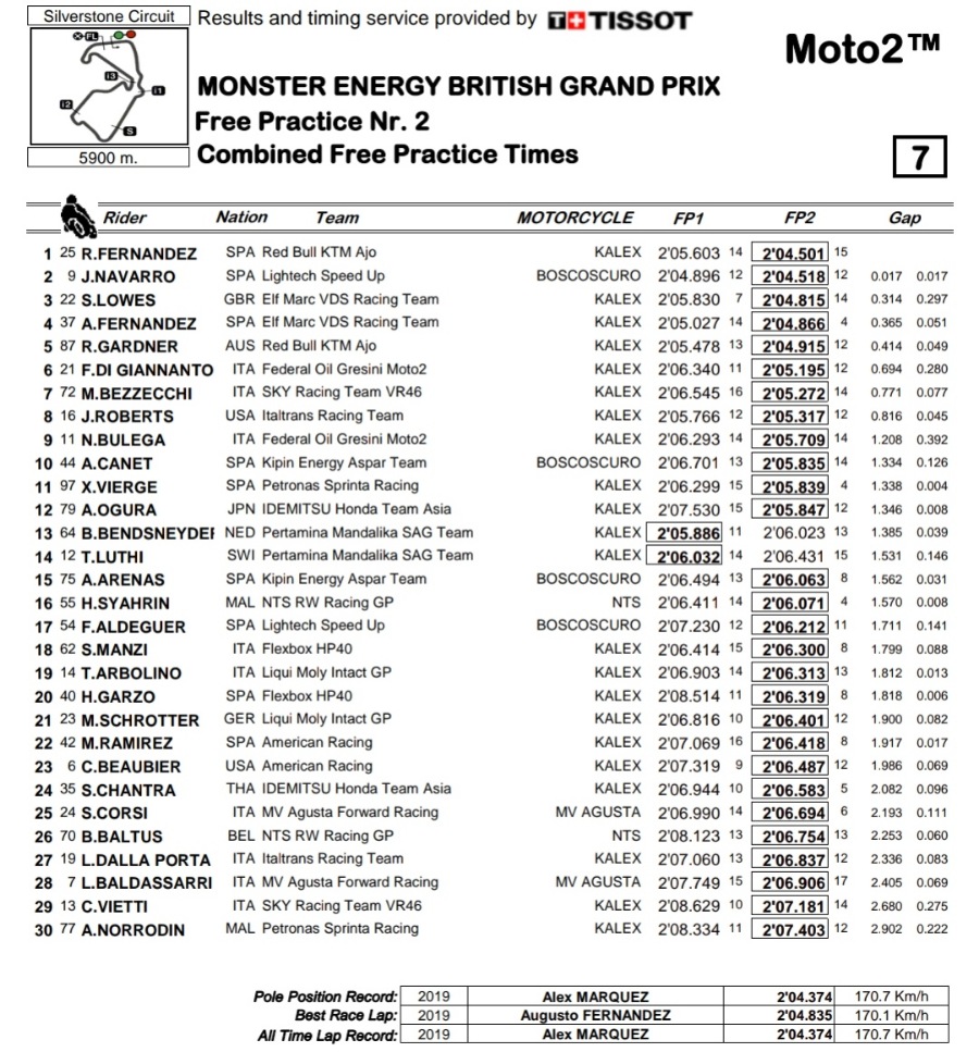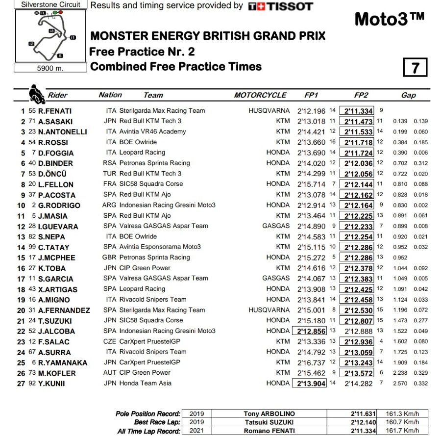 BalapMotor.Net – Berikut kami paparkan hasil kombinasi dari latihan bebas pertama dan kedua Kejuaraan Dunia Moto3, Moto2 dan MotoGP putaran ke-12 yang berlangsung di sirkuit Silverstone, Inggris pada Jumat 27 Agustus 2021.