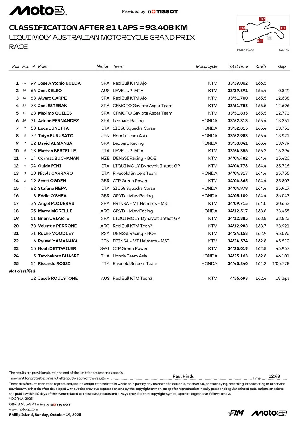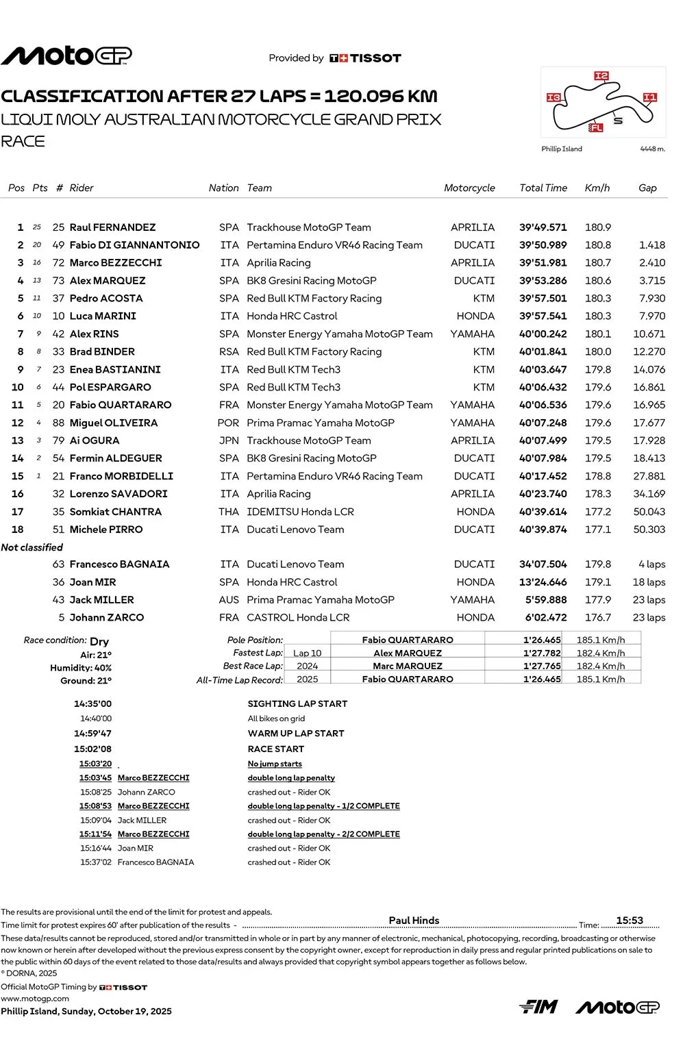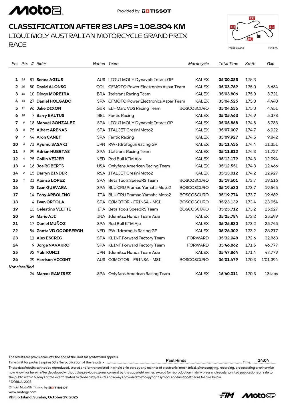 BalapMotor.Net – Berikut merupakan hasil race dari gelaran Liqui Moly Australian Motocycle Grand Prix 2025 “MotoGP Australia 2025” yang berlangsung di sirkuit Philip Island pada 19 Oktober 2025. (**)