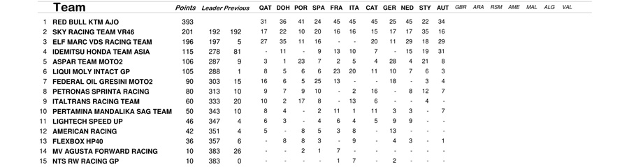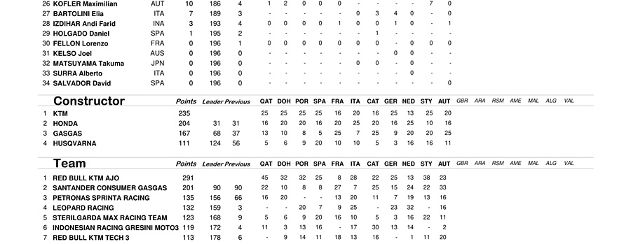 Di kelas Moto2, Raul Fernandes sukses memberikan podium juara untuk timnya Red Bull KTM Ajo. Untuk klasemen sementara masih dipimpin oleh rekan setimnya, Remy Garnder yang kali ini harus puas finis di posisi ke-7.