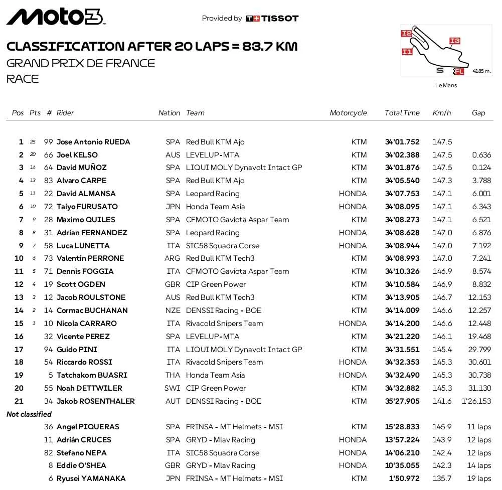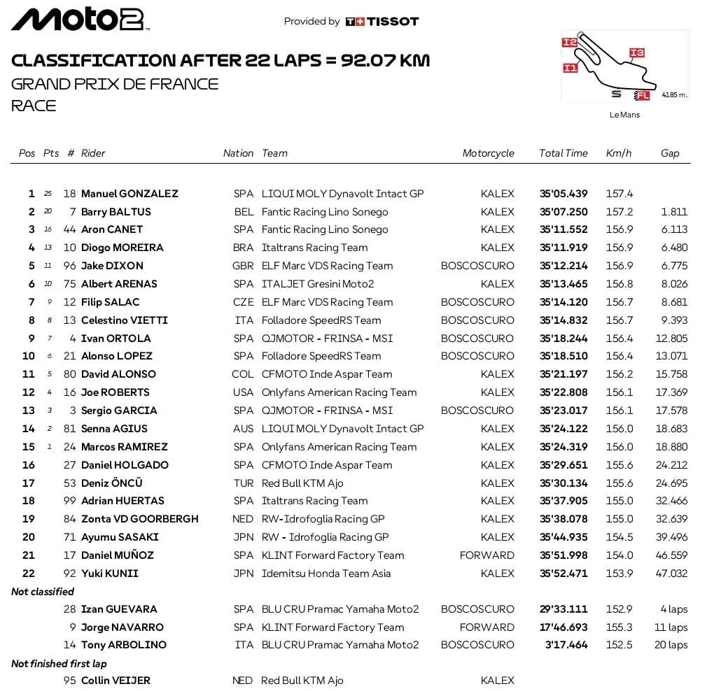 BalapMotor.Net – Berikut merupakan hasil Race Kejuaraan Dunia MotoGP, Moto2 dan Moto3 putaran keenam yang berlangsung di sirkuit Le Mans, Prancis pada 9-11 Mei 2025. (**)