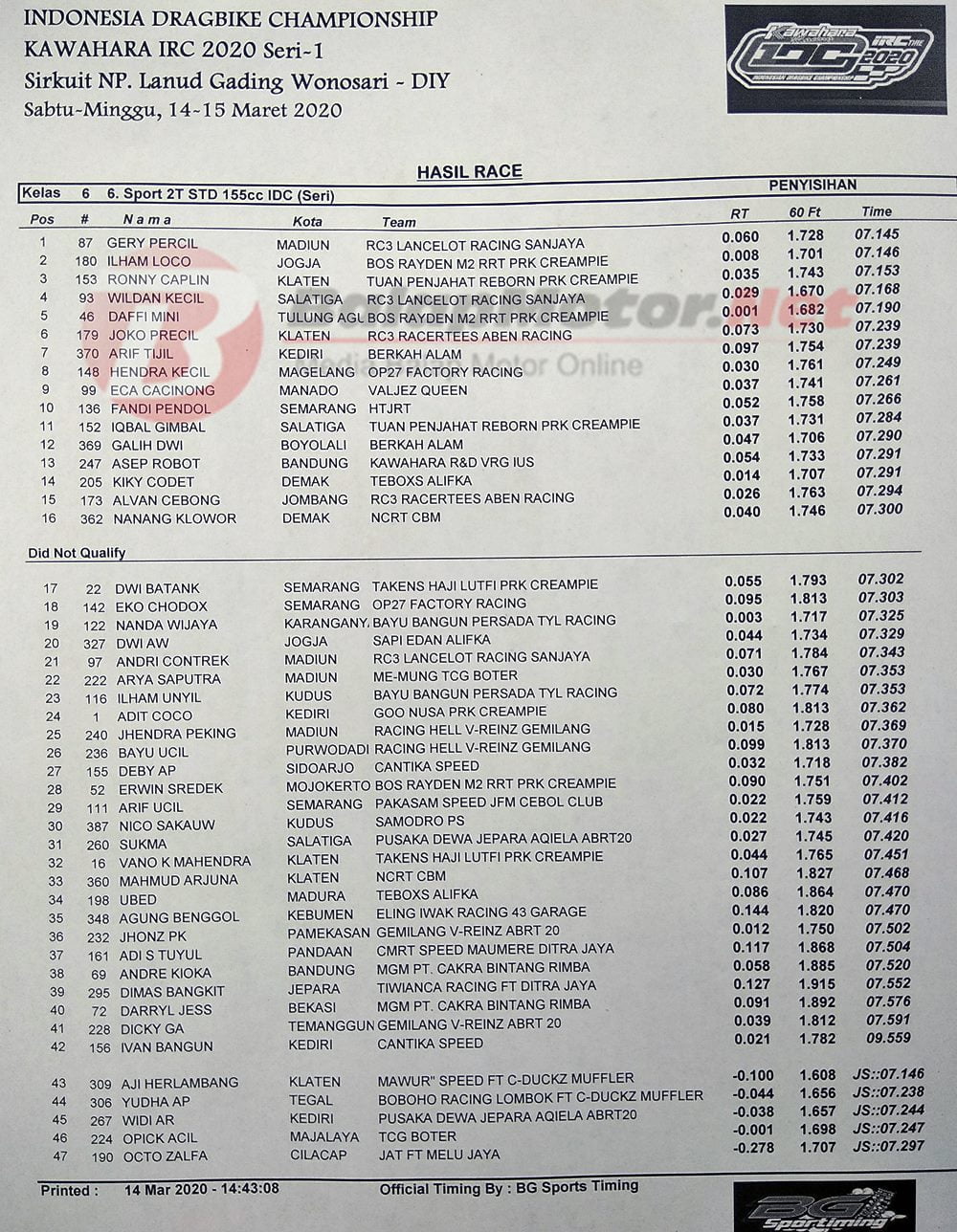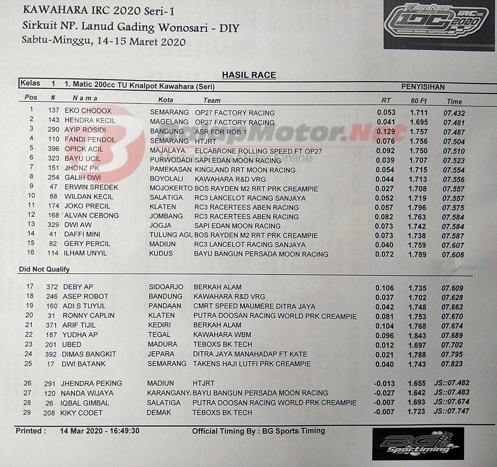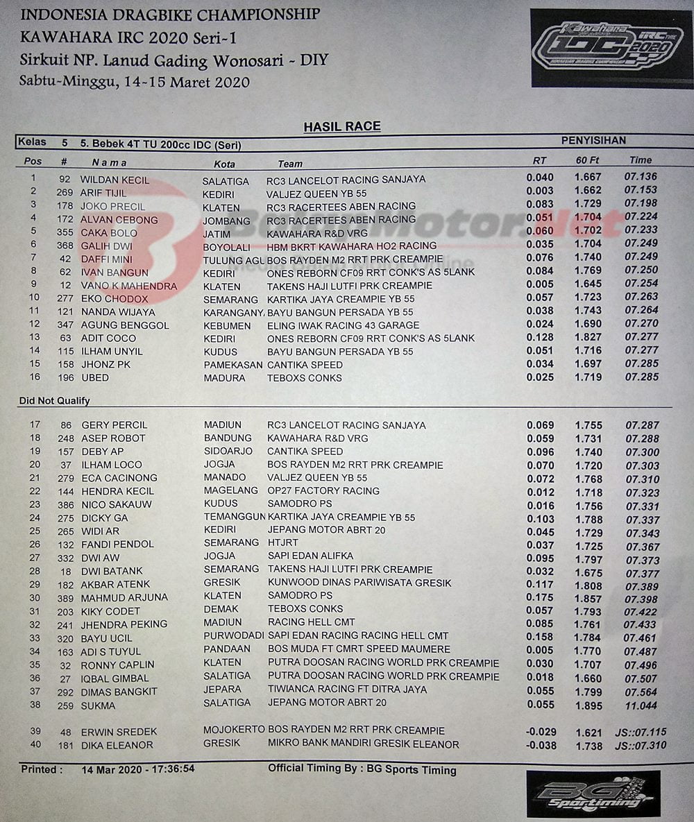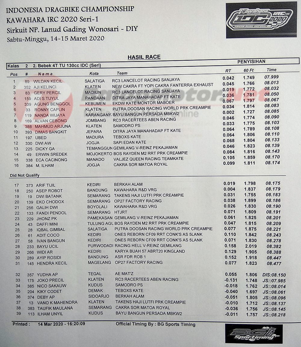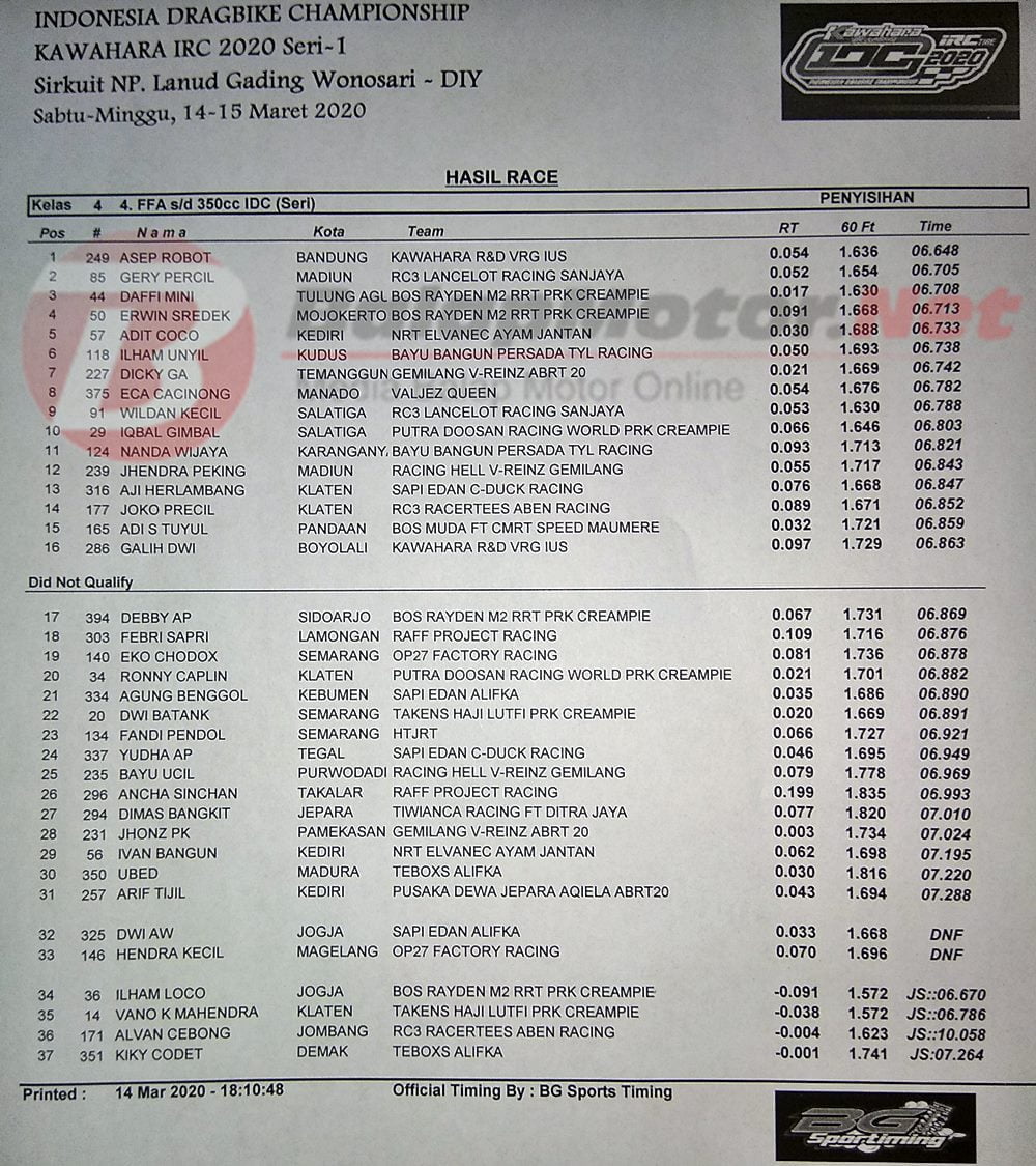 BalapMotor.Net – Berikut kami paparkan hasil lengkap dari penyisihan kategori kelas poin kejuaraan Kawahara IRC Indonesia Drag Bike Championship (IDC) 2020 putaran 1.