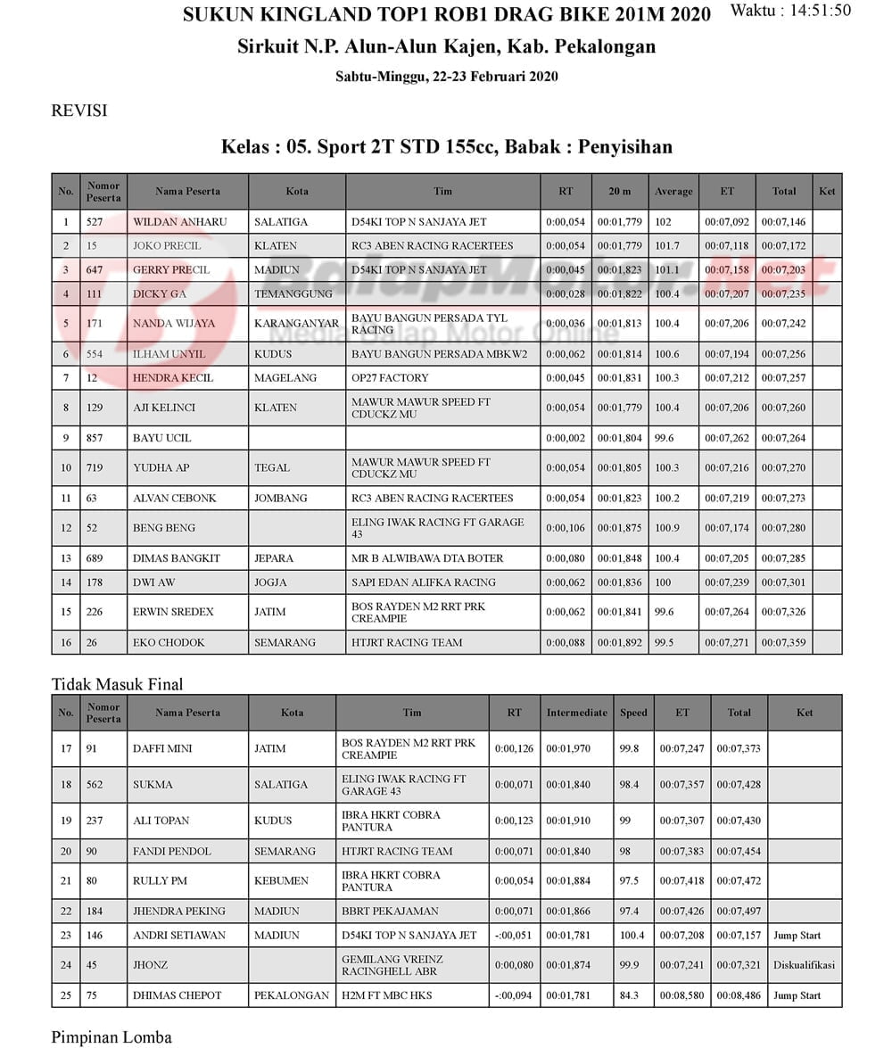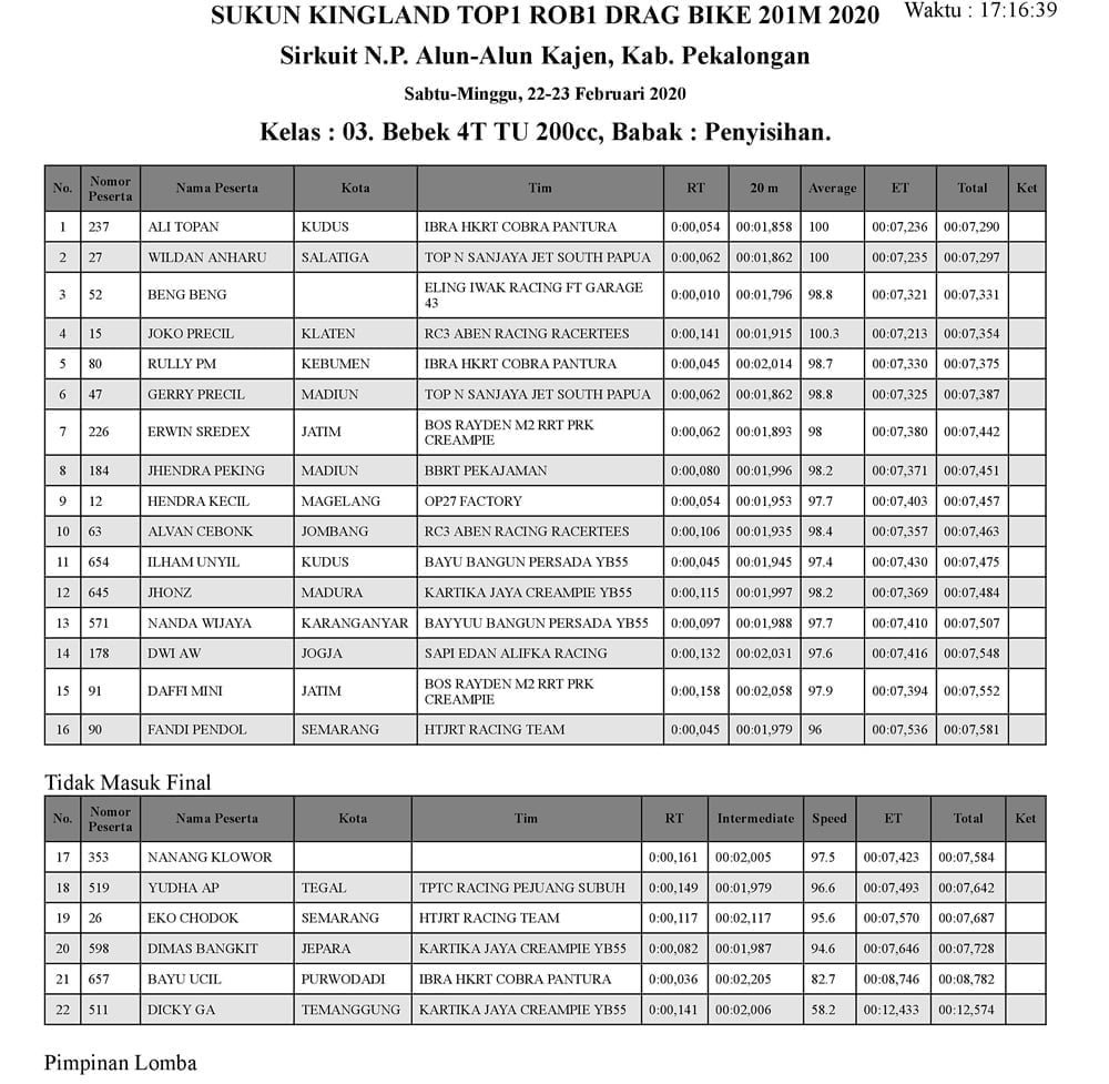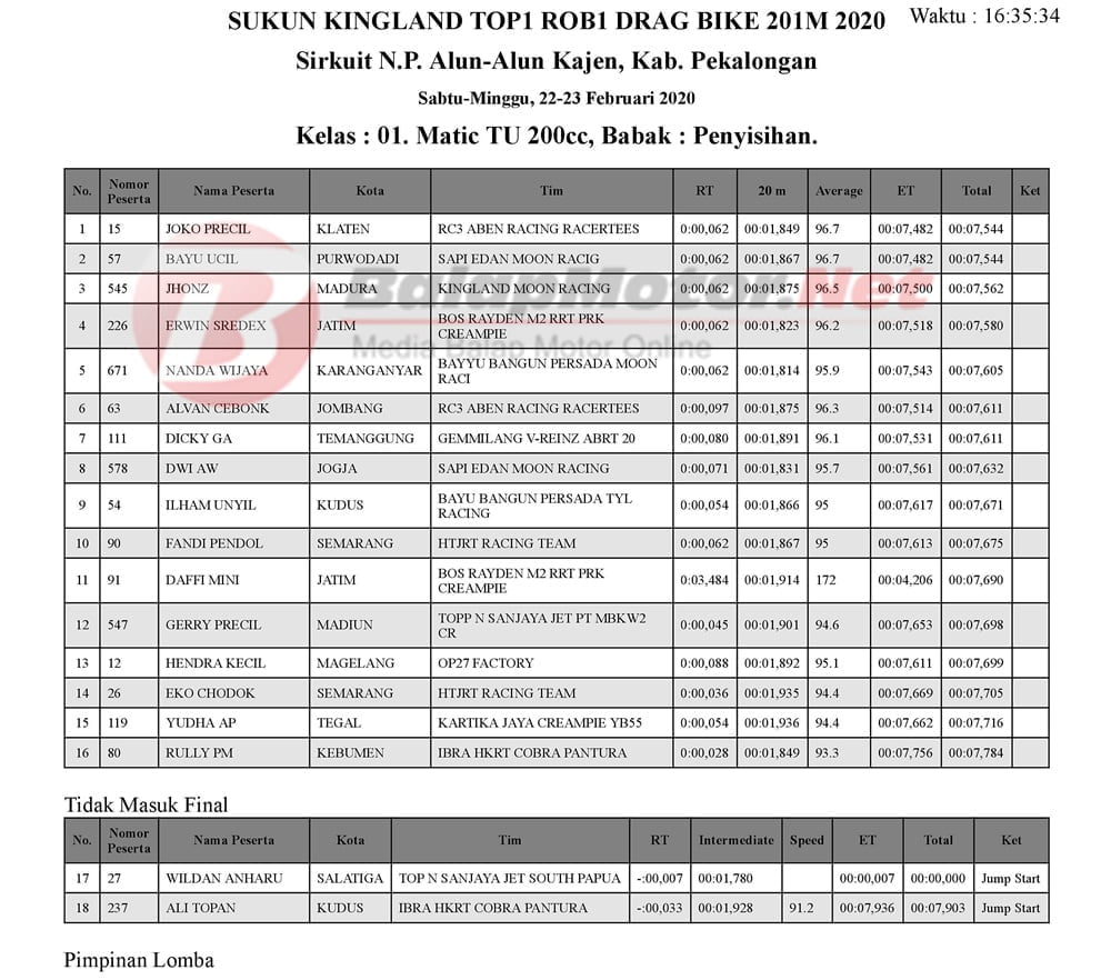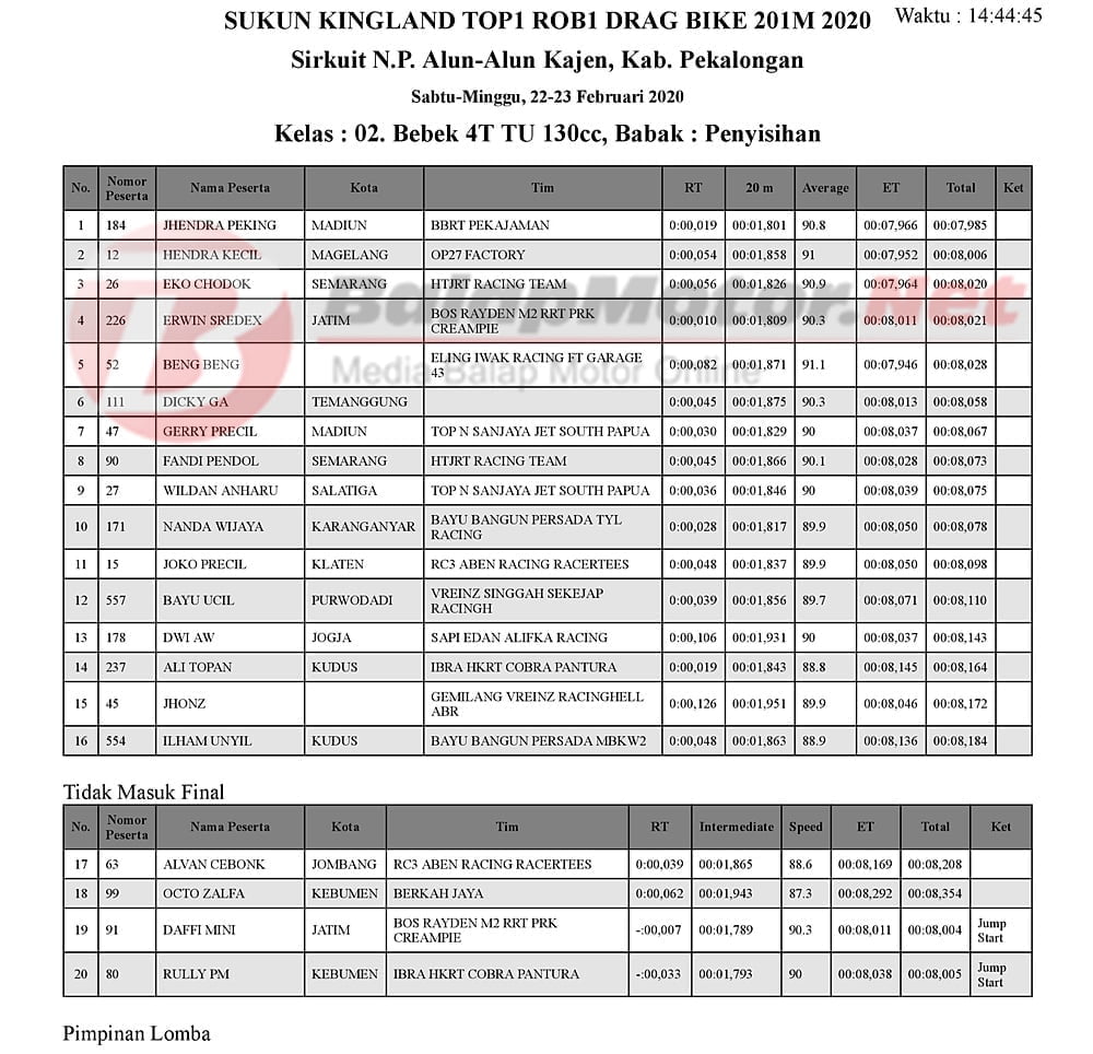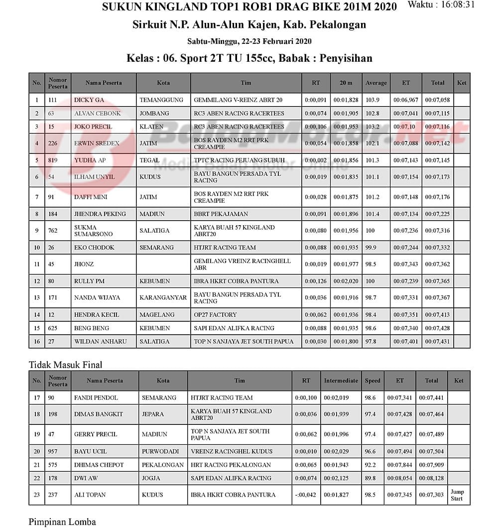 BalapMotor.Net – Berikut kami paparkan hasil penyisihan kejuaraan balap lurus 201m yang bertajuk Sukun Kingland TOP1 ROB1 Gadhuro Drag Bike Series putaran 1 tahun 2020.