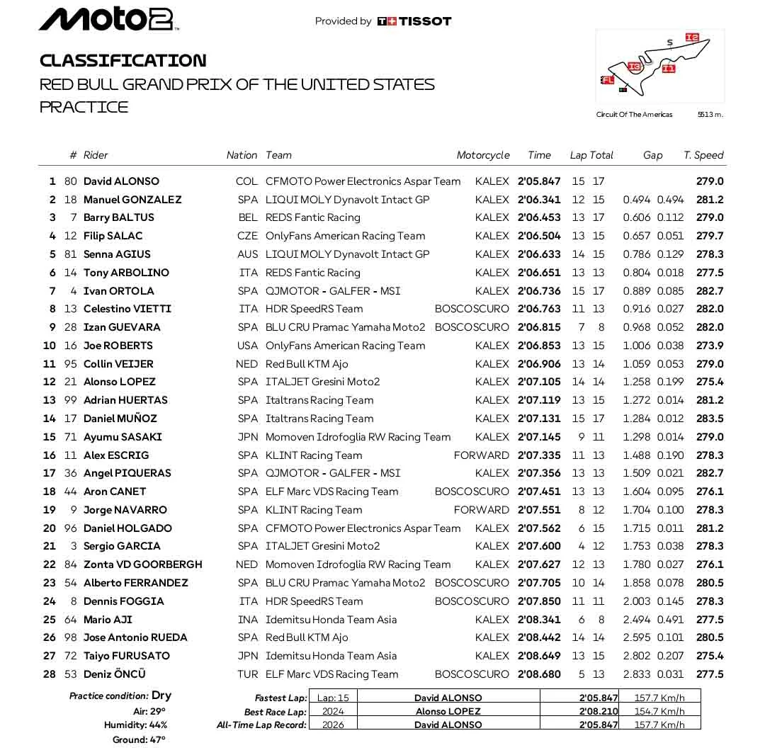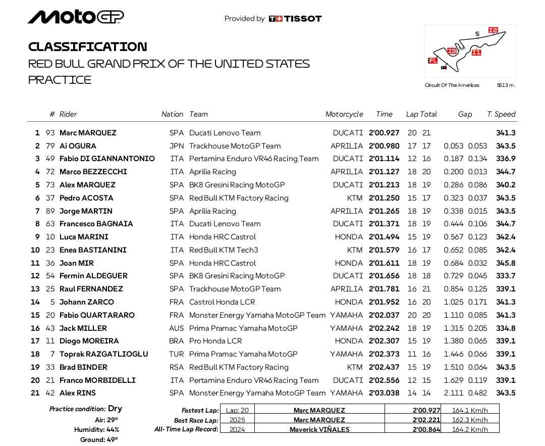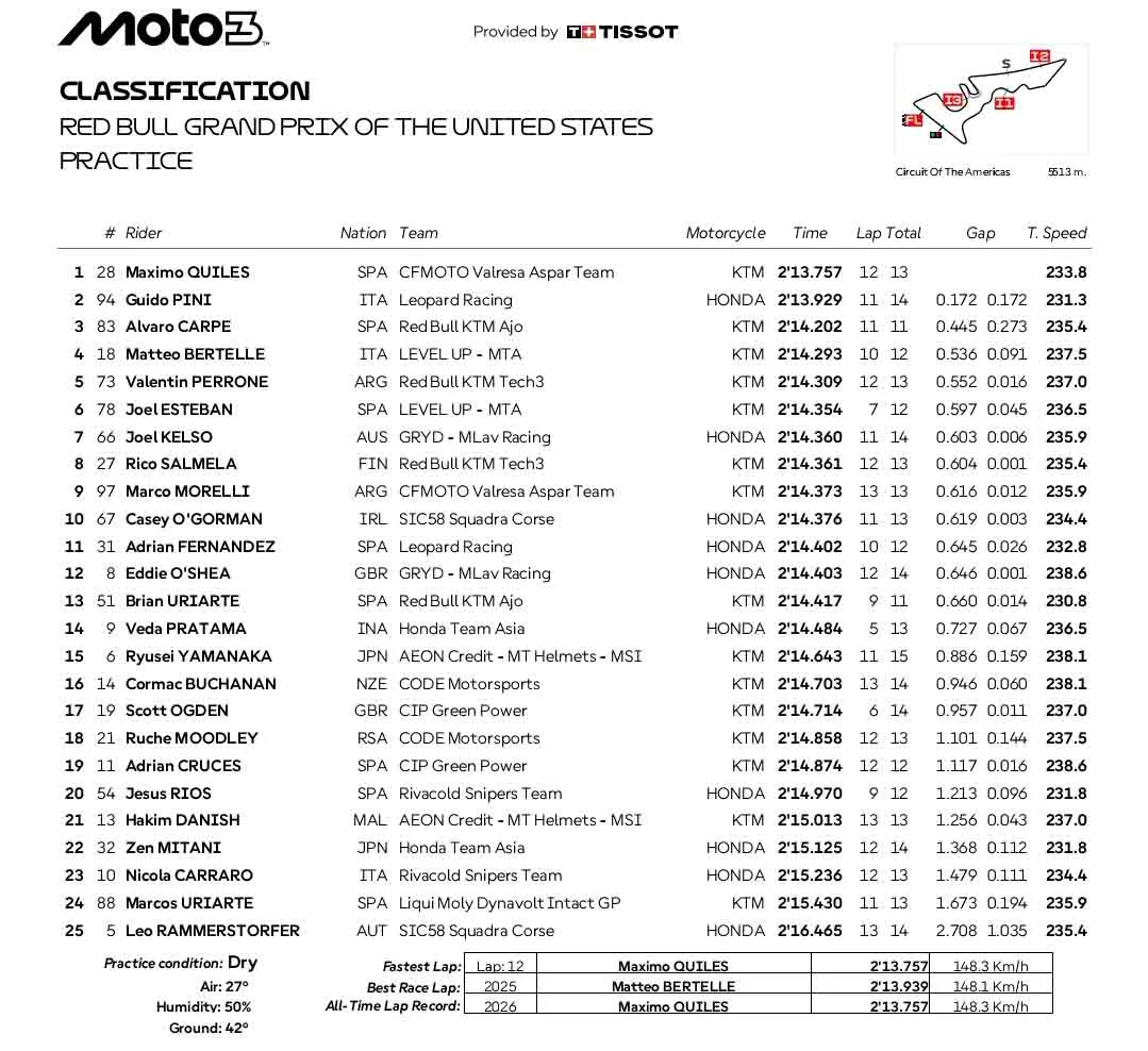 BalapMotor.Net – Berikut merupakan hasil sesi latihan bebas kejuaraan dunia Moto3, Moto2 dan MotoGP putaran ketiga yang berlangsung di Circuit Of The Americas, Austin, Texas. (**)