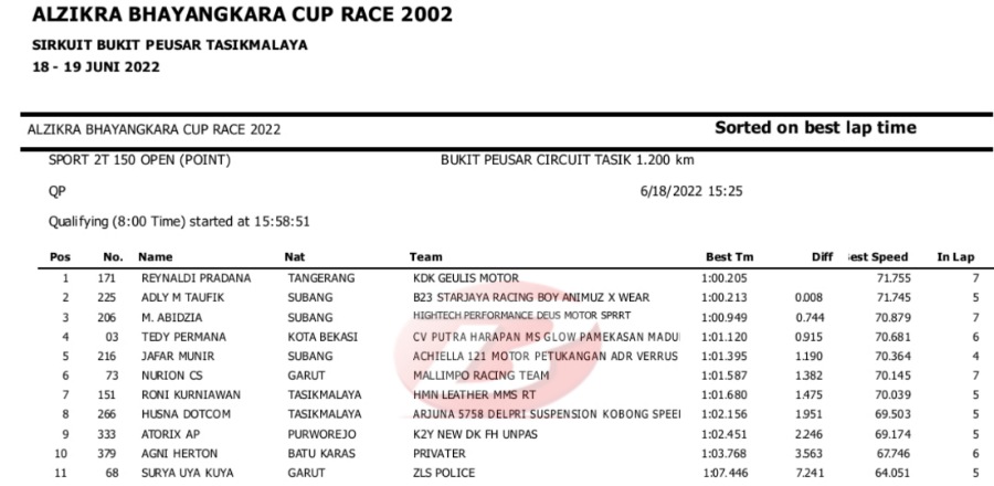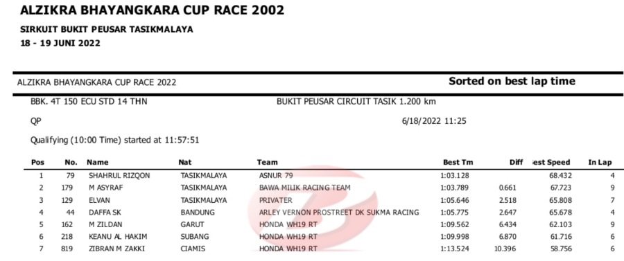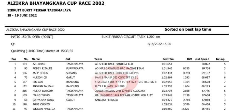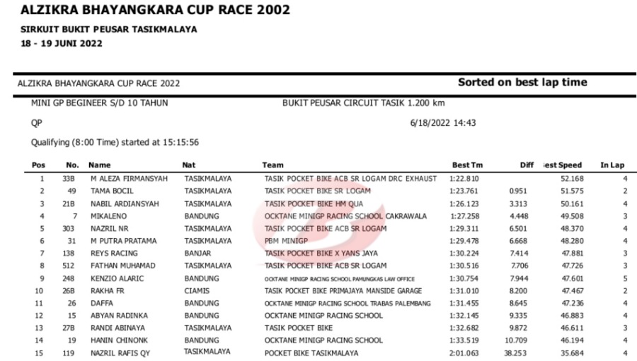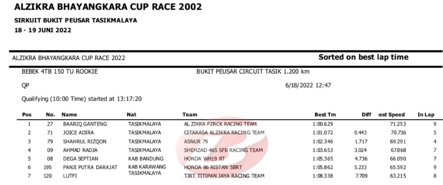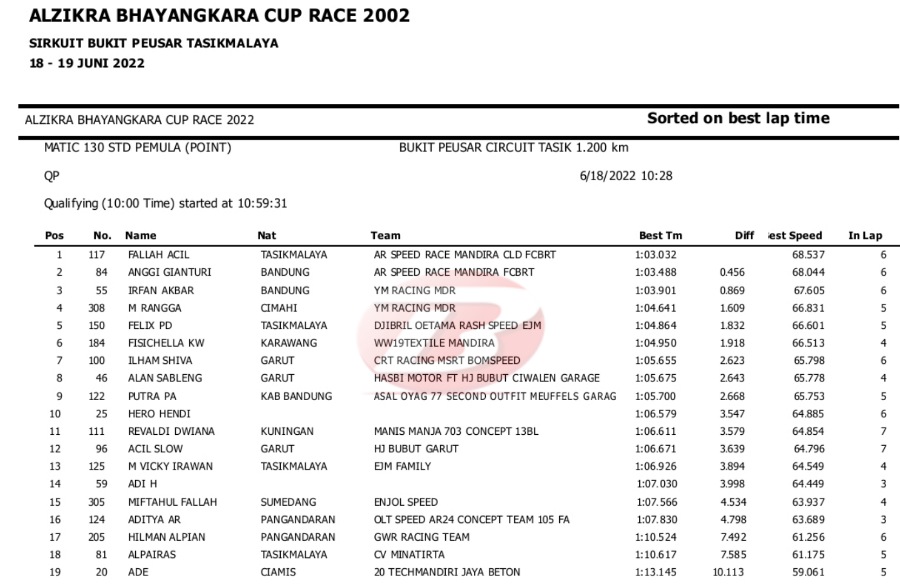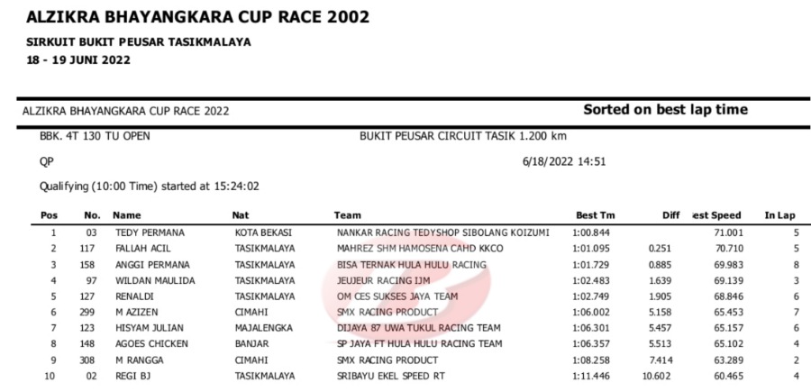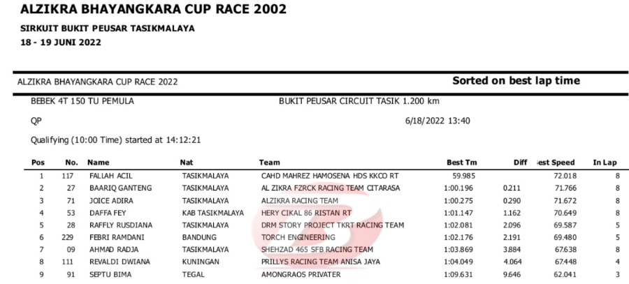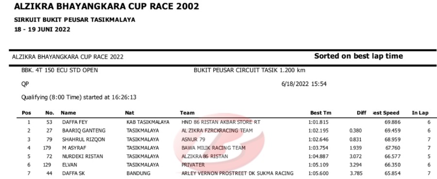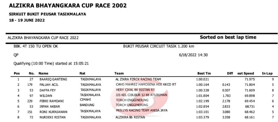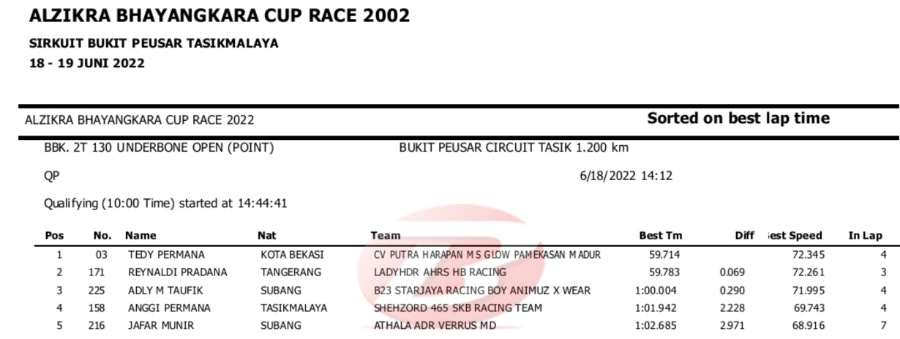 Hasil Lengkap QTT Alzikra Bhayangkara Cup Race TasikmalayaPenulis Yugo Aol - 18/06/2022 BalapMotor.Net – Berikut kami paparkan hasil lengkap kualifikasi kejuaraan balap motor bertajuk Alzikra Bhayangkara Cup Race 2022 yang berlangsung di sirkuit Bukit Peusar Tasikmalaya, Jawa Barat pada Sabtu (18 Juni).