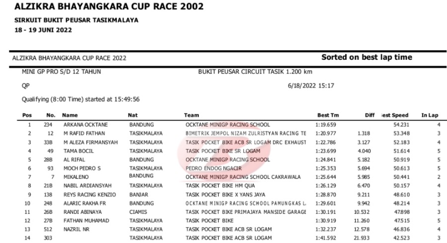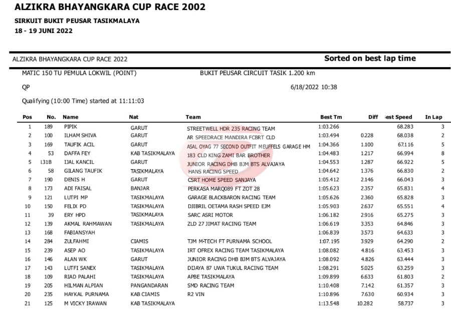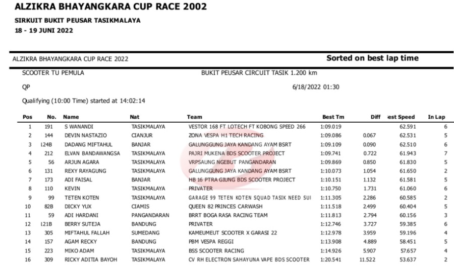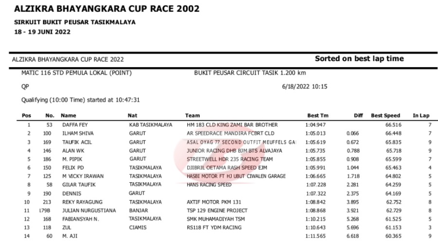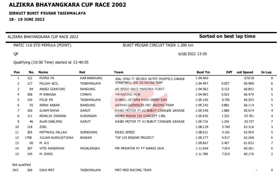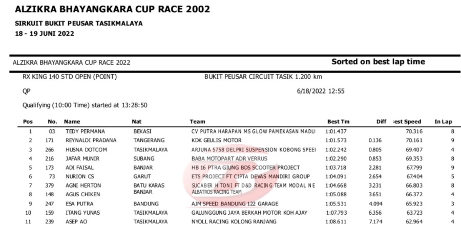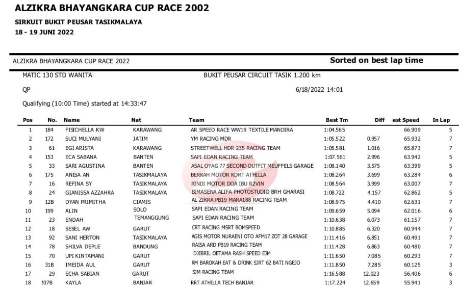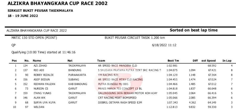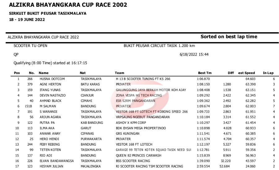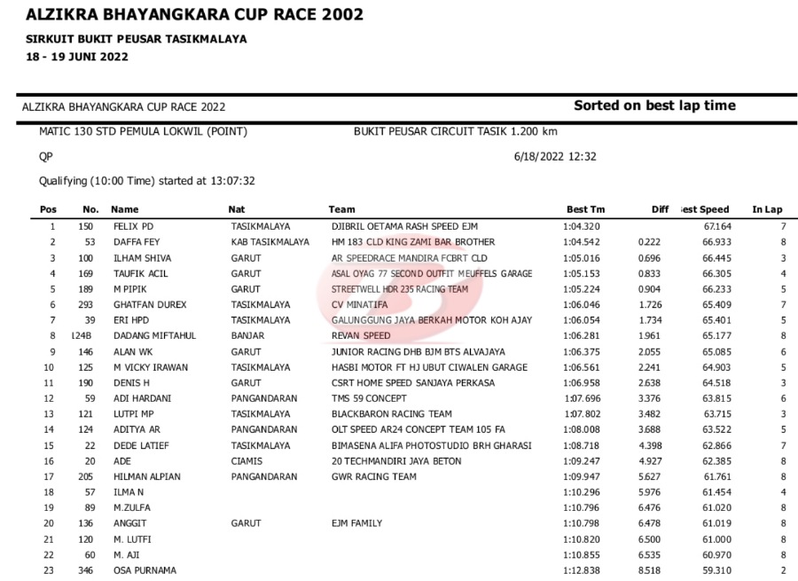 Hasil Lengkap QTT Alzikra Bhayangkara Cup Race TasikmalayaPenulis Yugo Aol - 18/06/2022 BalapMotor.Net – Berikut kami paparkan hasil lengkap kualifikasi kejuaraan balap motor bertajuk Alzikra Bhayangkara Cup Race 2022 yang berlangsung di sirkuit Bukit Peusar Tasikmalaya, Jawa Barat pada Sabtu (18 Juni).