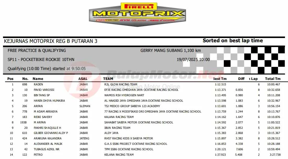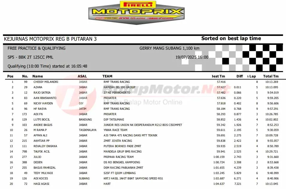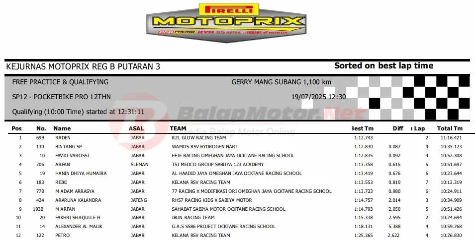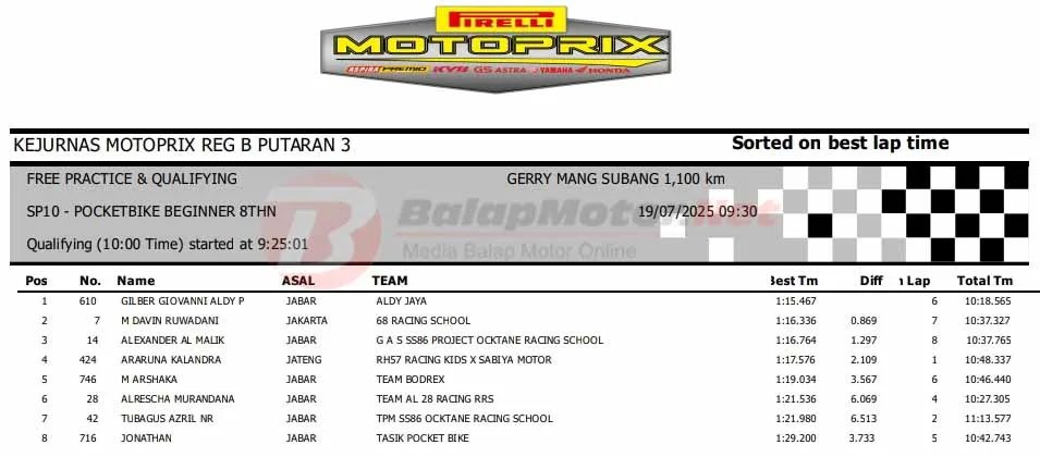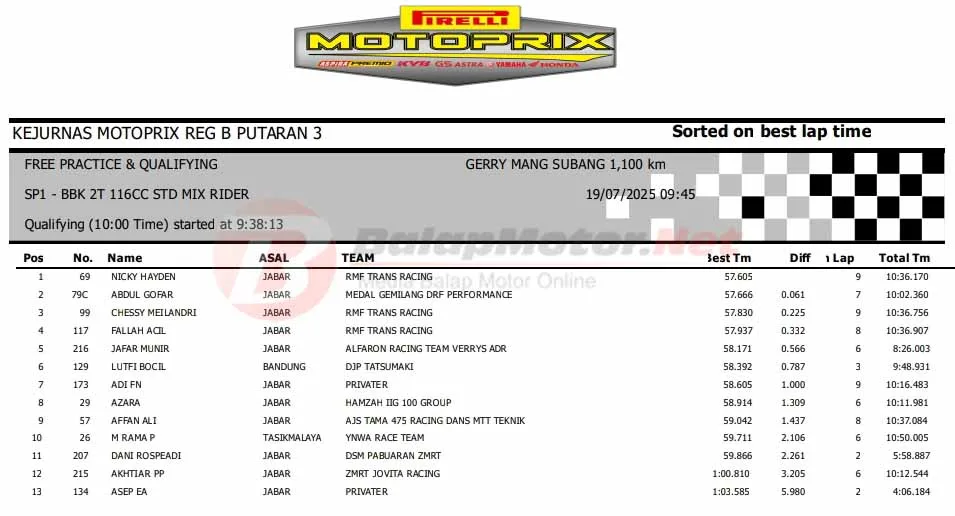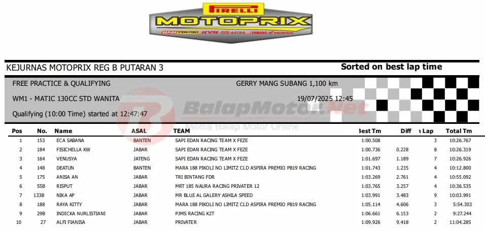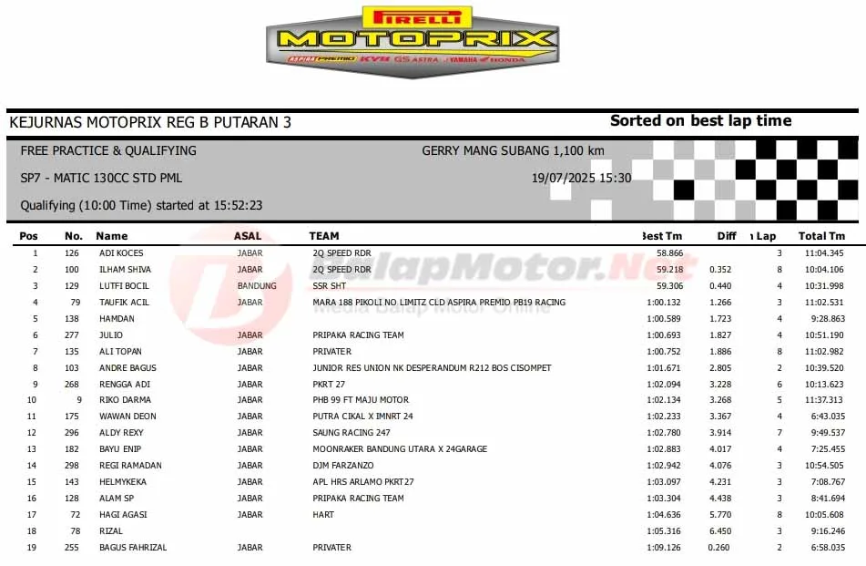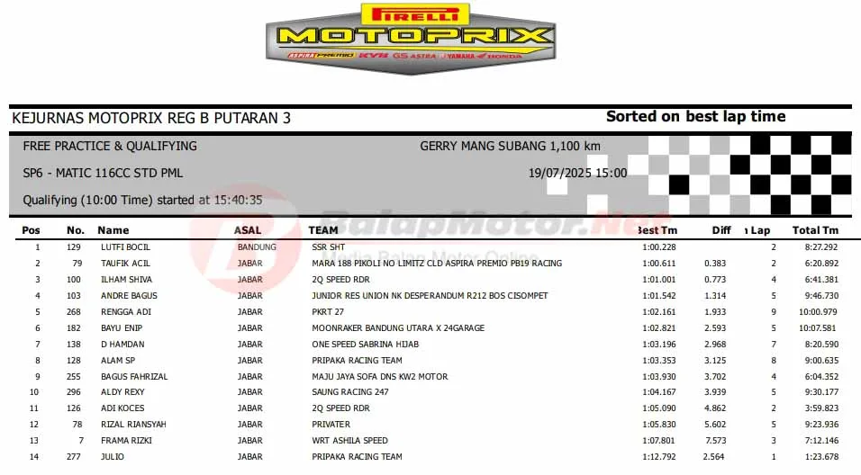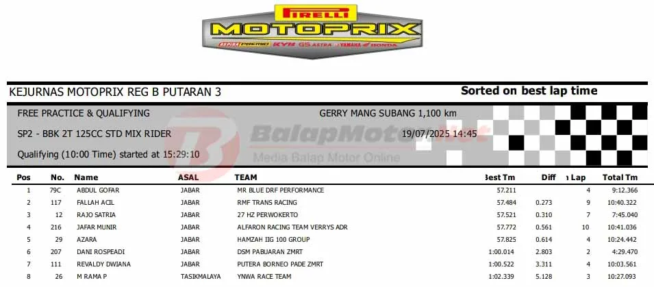 BalapMotor.Net – Berikut merupakan hasil sesi kualifikasi (QTT) semua kelas di Kejurnas Motoprix Region B Seri 3 yang berlangsung di sirkuit Gery Mang, Subang, Jawa Barat pada Sabtu 19 Juli 2025. (**)