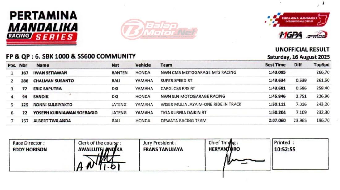 BalapMotor.Net – Berikut merupakan hasil lengkap dari sesi QTT gelaran Mandalika Racing Series (MRS) ronde ketiga yang berlangsung di sirkuit Mandalika, Lombok-NTB pada hari Sabtu 16 Agustus 2025. (**)