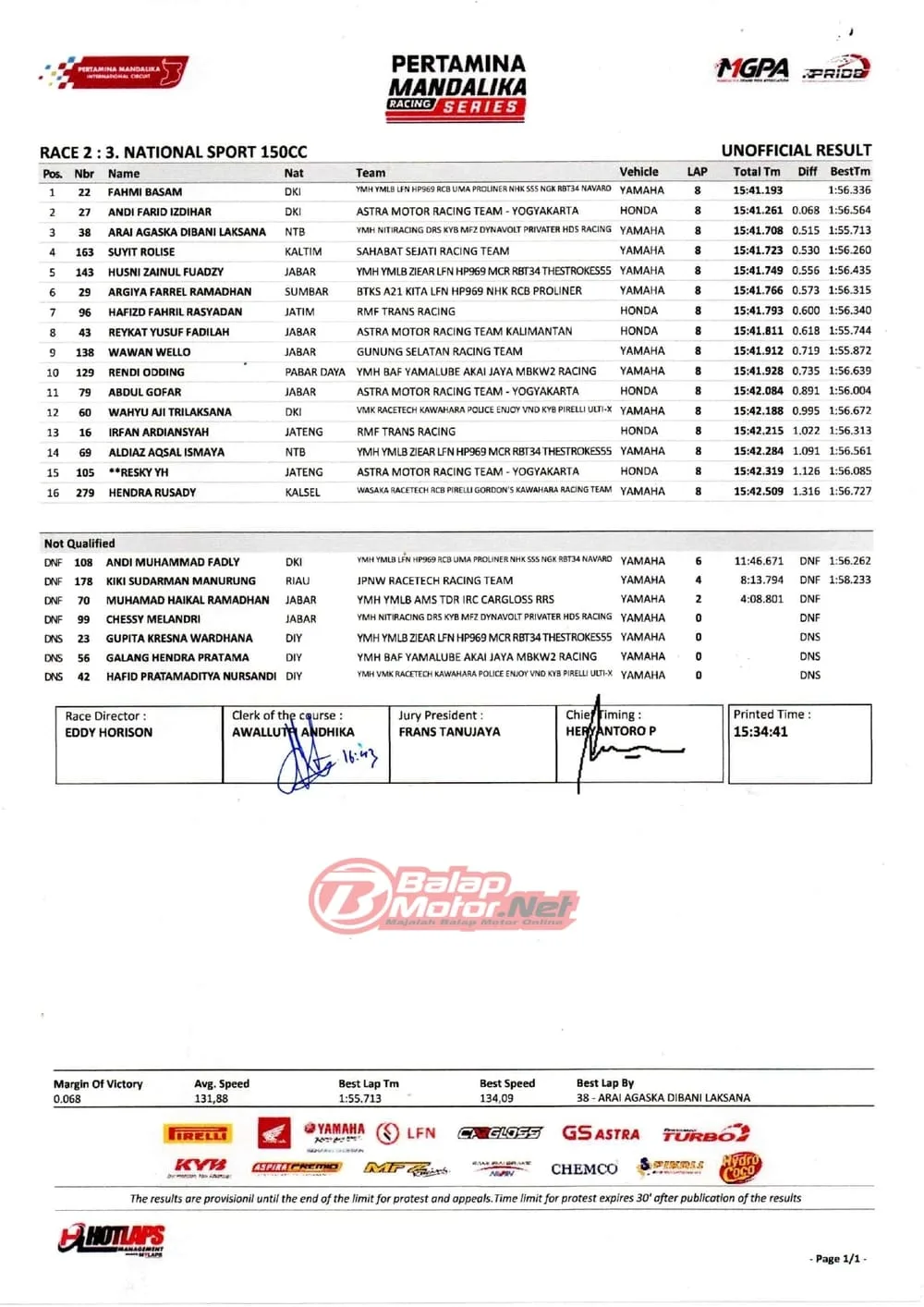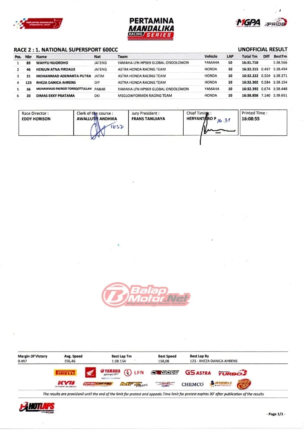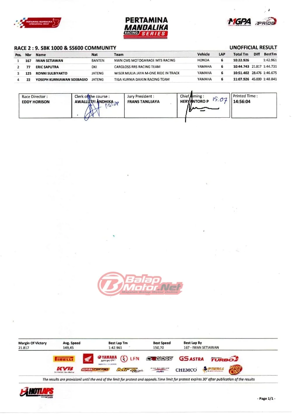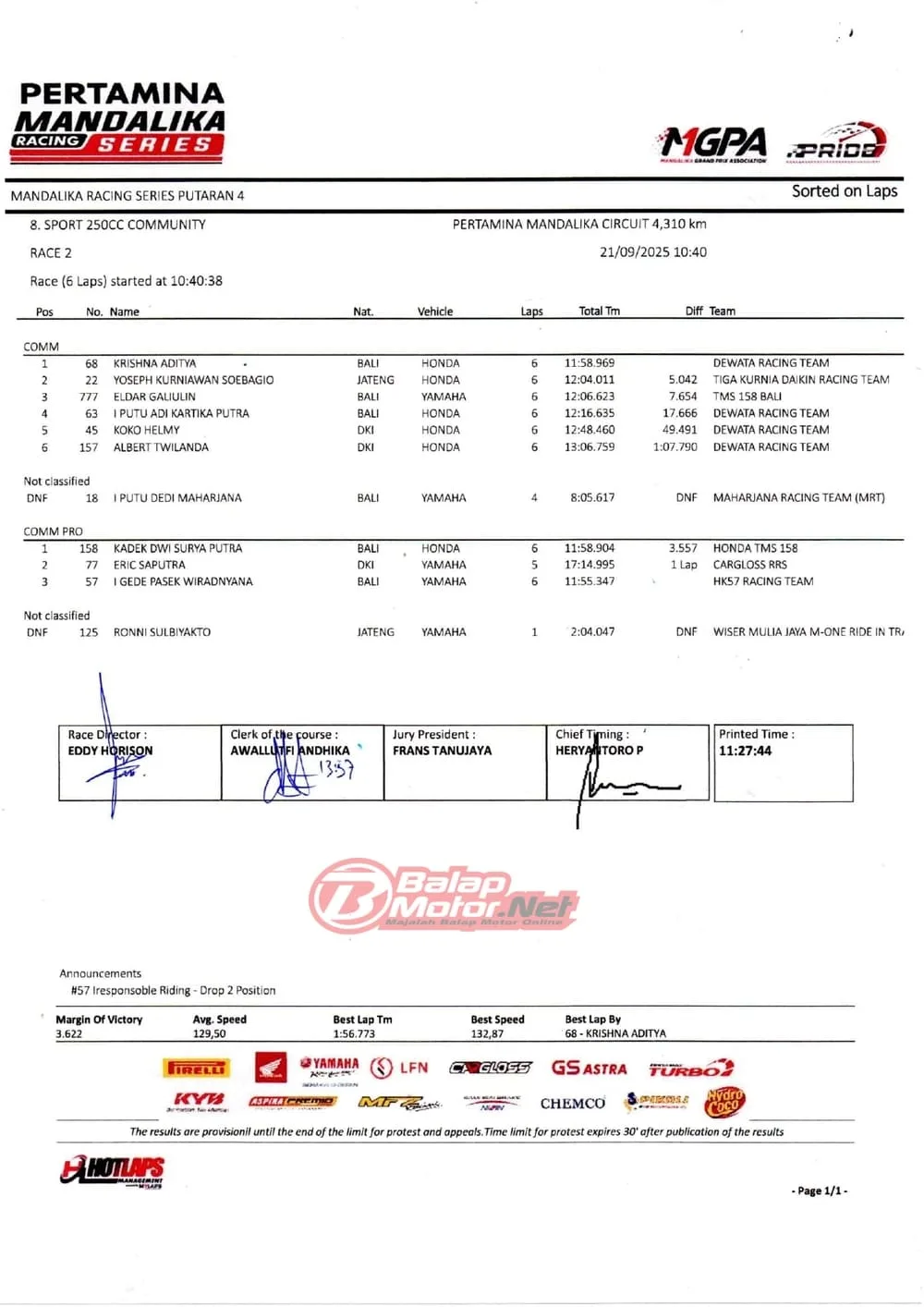 BalapMotor.Net – Berikut merupakan hasil lengkap race 2 dari gelaran Pertamina Mandalika Racing Series (MRS) 2025 ronde 4 yang berlangsung di sirkuit Mandalika, Lombok-NTB (20-21/9). (**)