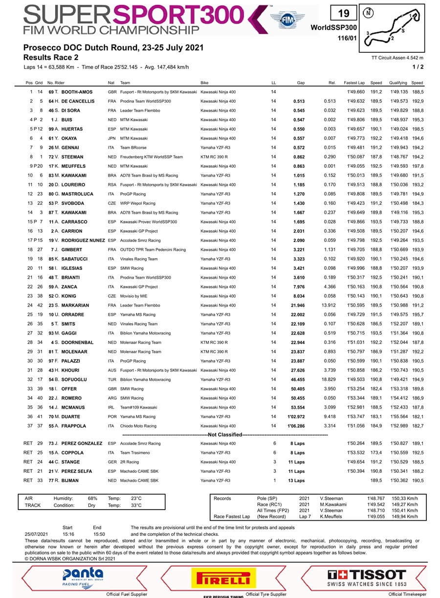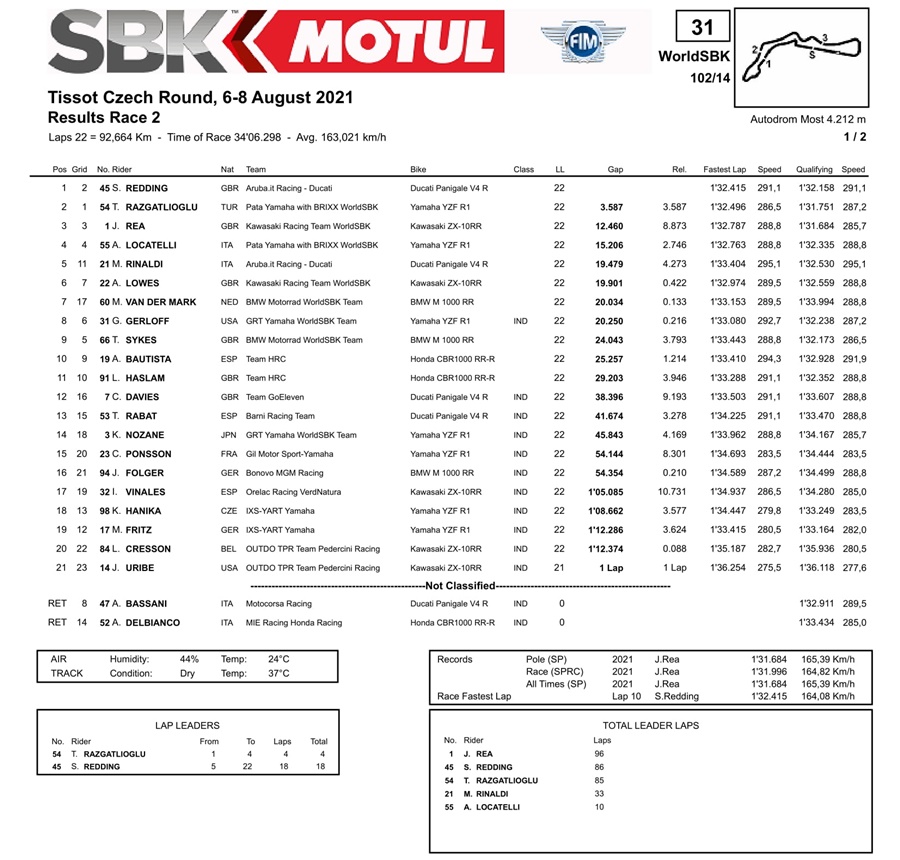 BalapMotor.Net – Berikut kami paparkan hasil lengkap Race kedua Kejuaraan Dunia Superbike, Supersport dan Supersport 300cc yang berlangsung di sirkuit Autodrom Most, Republik Ceko pada Minggu 8 Agustus dan klasemen sementara musim 2021.