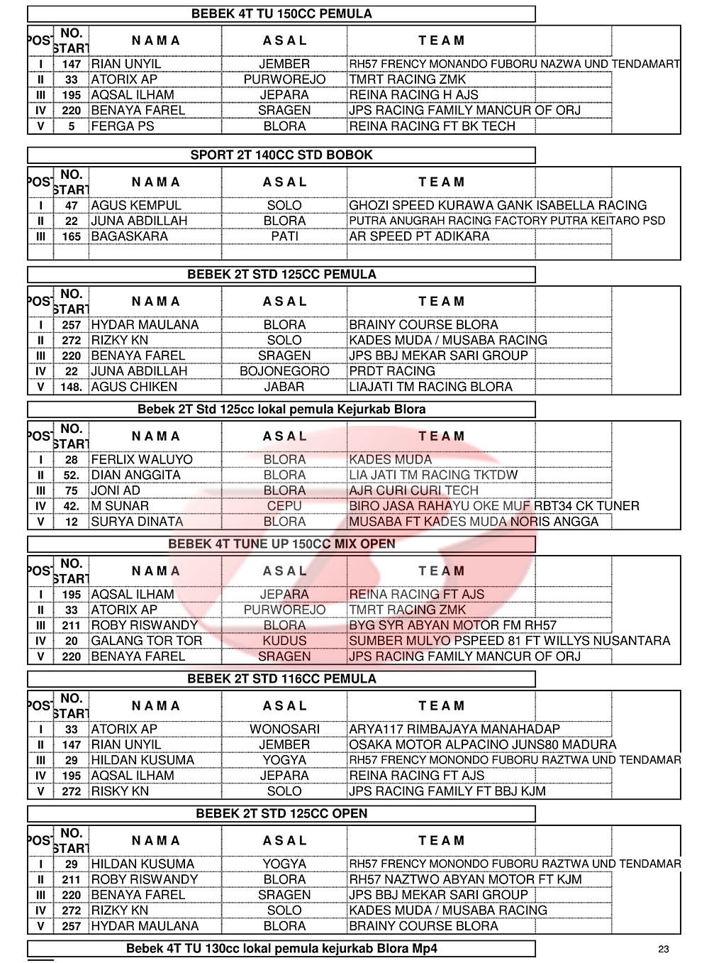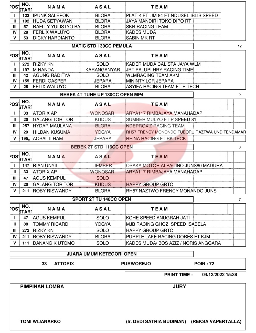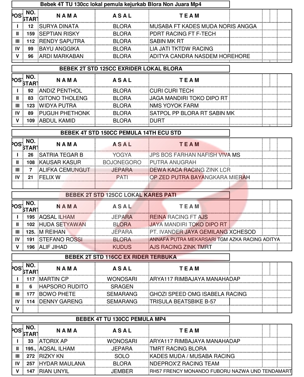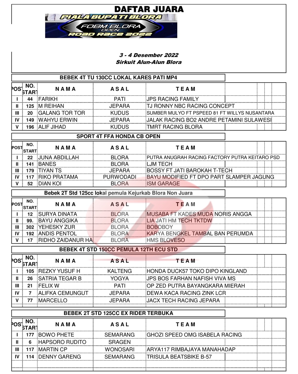 BalapMotor.Net – Berikut merupakan hasil lengkap kejuaraan Piala Bupati Blora FOBM Blora Open Road Race 2022 yang berlangsung di sirkuit NP. Alun-alun Blora, Jawa Tengah pada 3-4 Desember 2022.