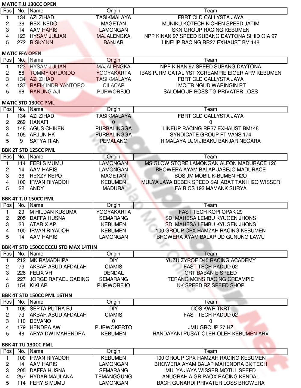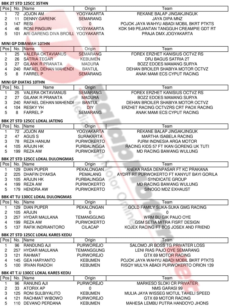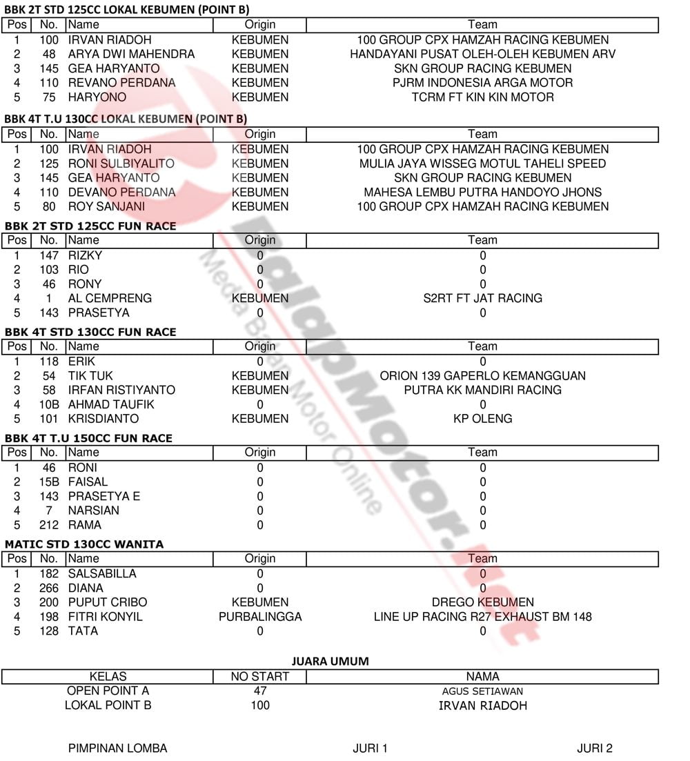 BalapMotor.Net – Berikut kami paparkan hasil lengkap kejuaraan balap motor bertajuk Kapolres Kebumen Cup Open Road Race 2019 yang berlangsung di sirkuit NP. Alun-alun Kebumen, Jateng pada 14-15 Desember 2019. | Yugo