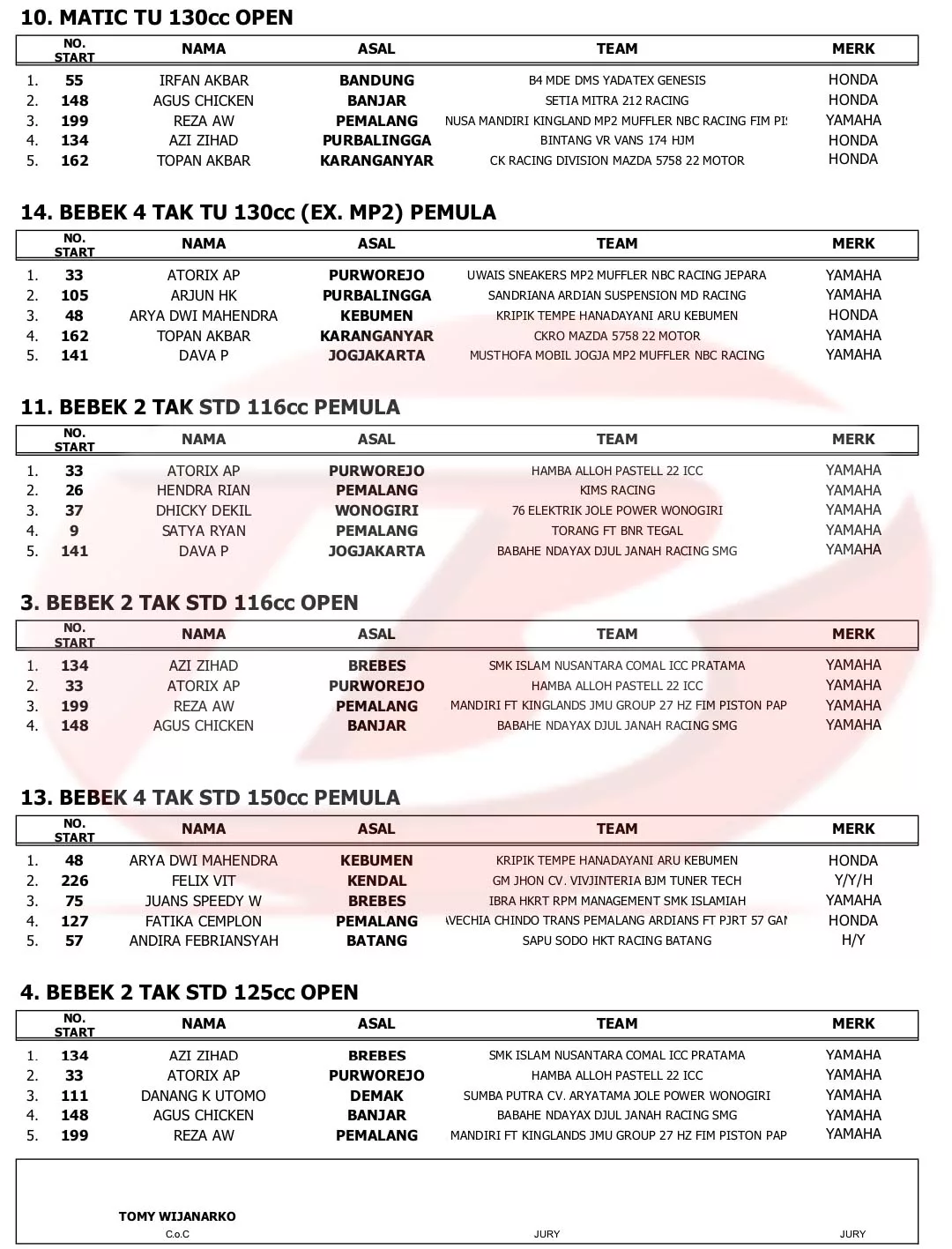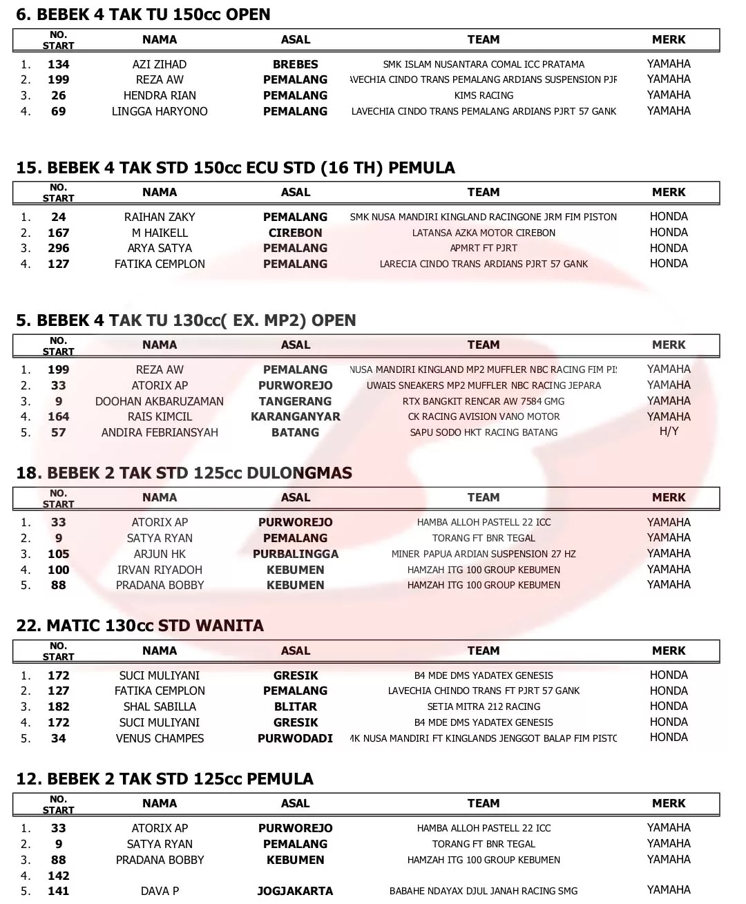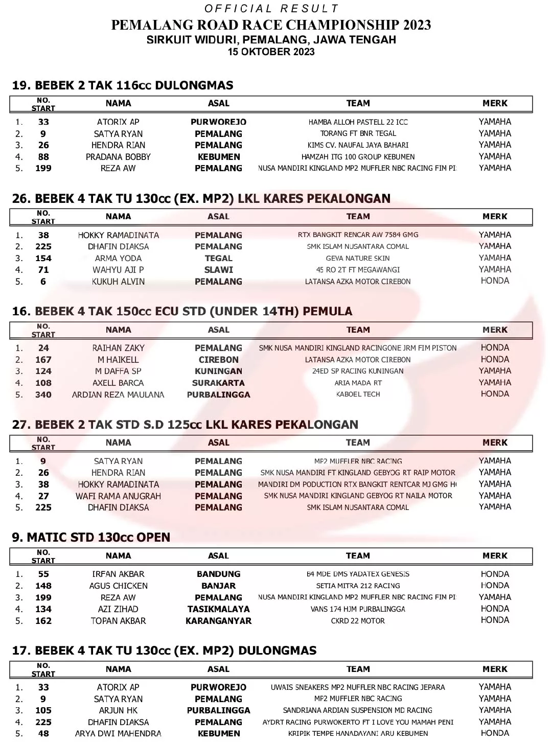 BalapMotor.Net – Berikut merupakan hasil lengkap kejuaraan balap motor dengan tajuk Pemalang Road Race Championship 2023 yang berlangsung di sirkuit Pantai Widuri, Pemalang, Jawa Tengah pada 14-15 Oktober 2023. (***)