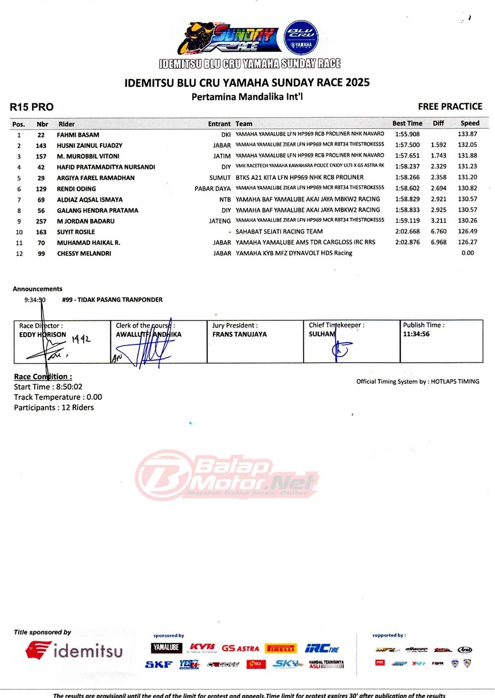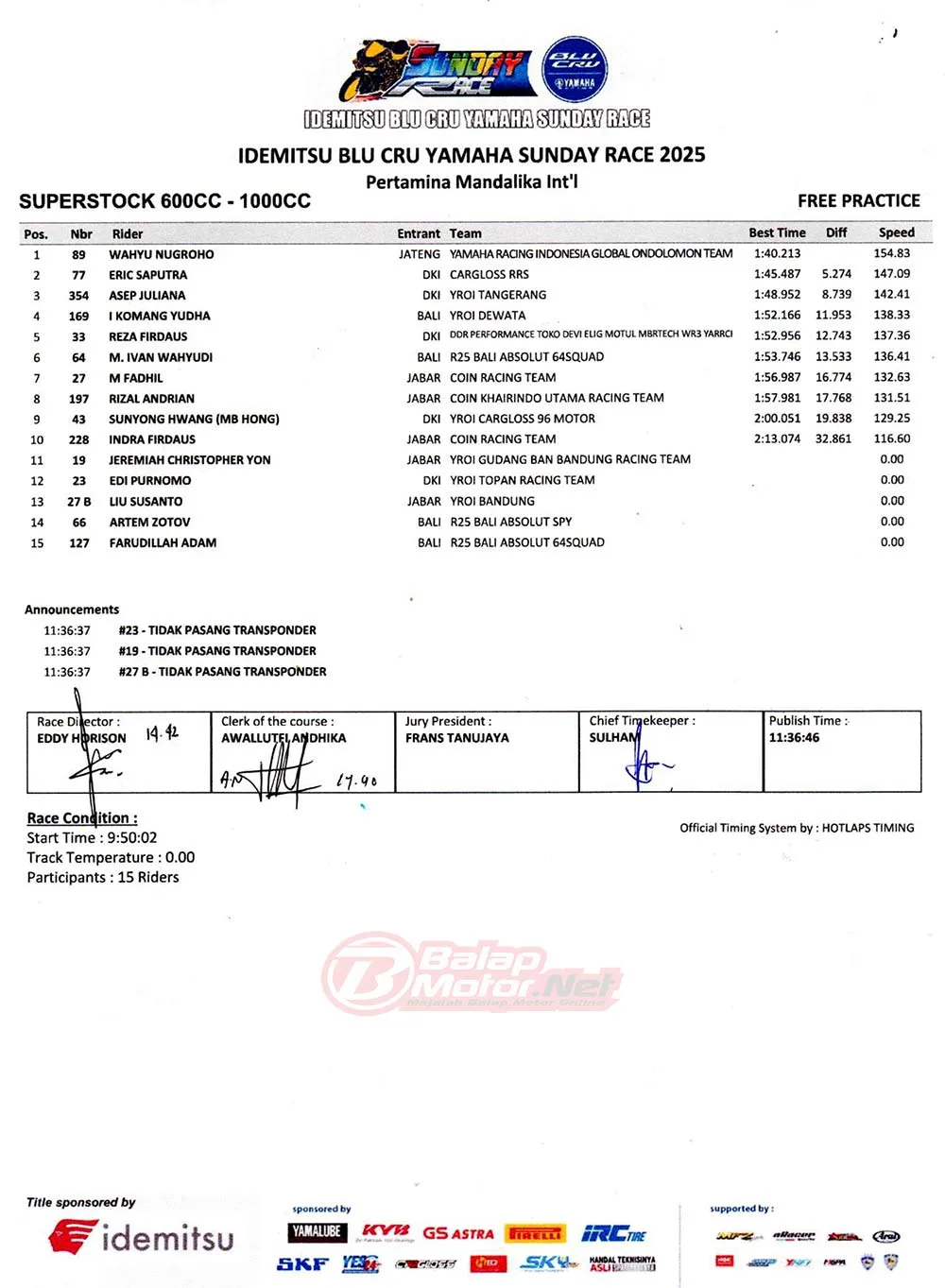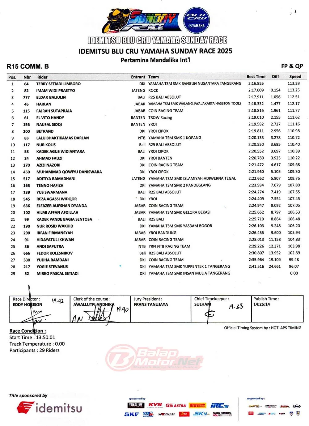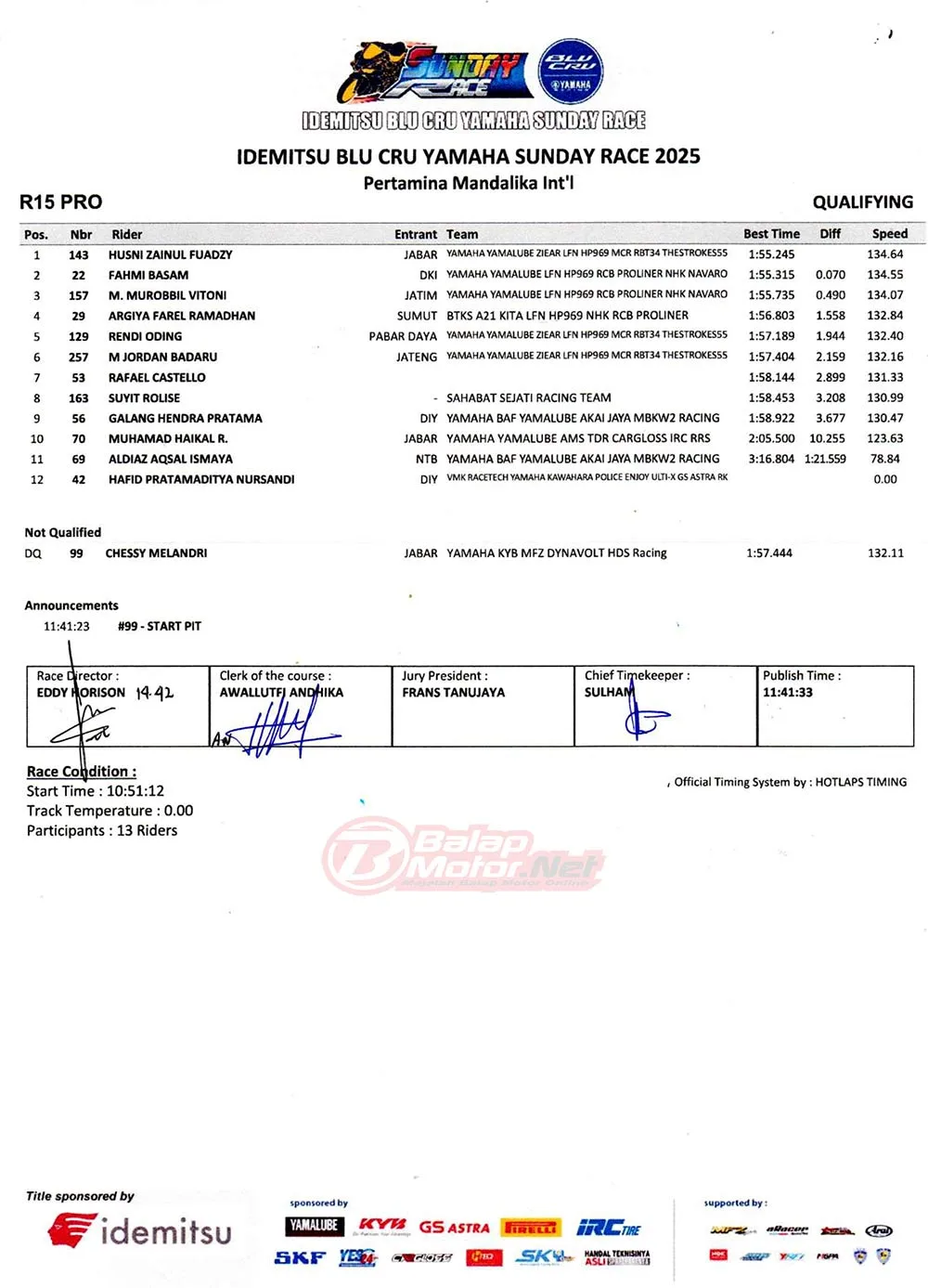 BalapMotor.Net – Berikut merupakan hasil lengkap dari sesi hari pertama (13/6) gelaran Idemitsu BLU CRU Yamaha Sunday Race 2025 yang berlangsung di sirkuit Pertamina Mandalika, Lombok pada hari Jumat 13 Juni 2025. (**)