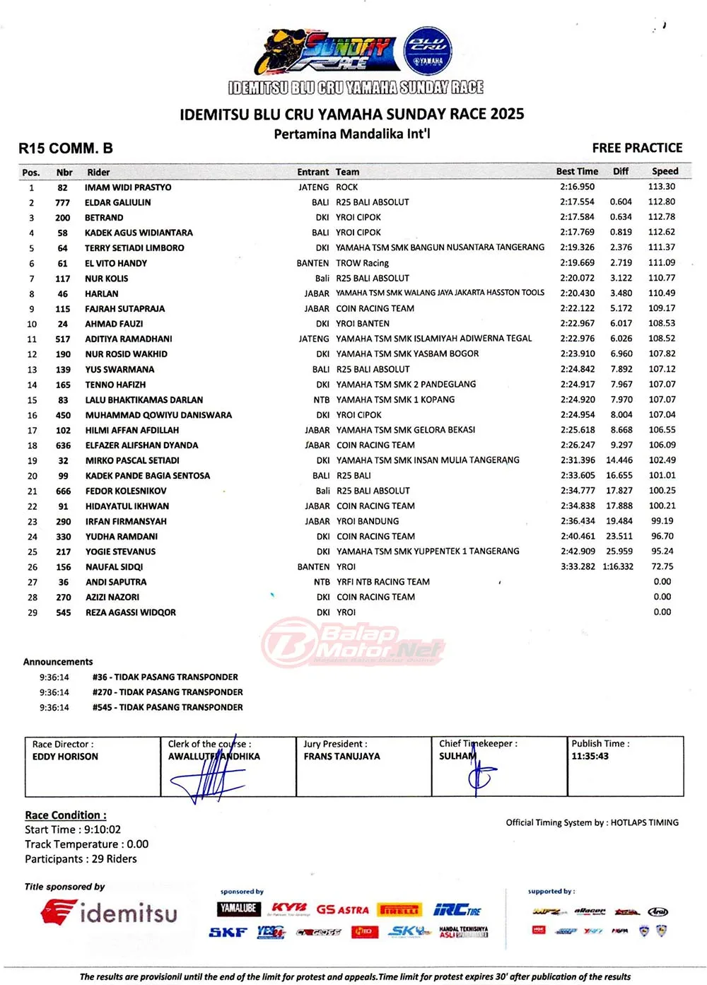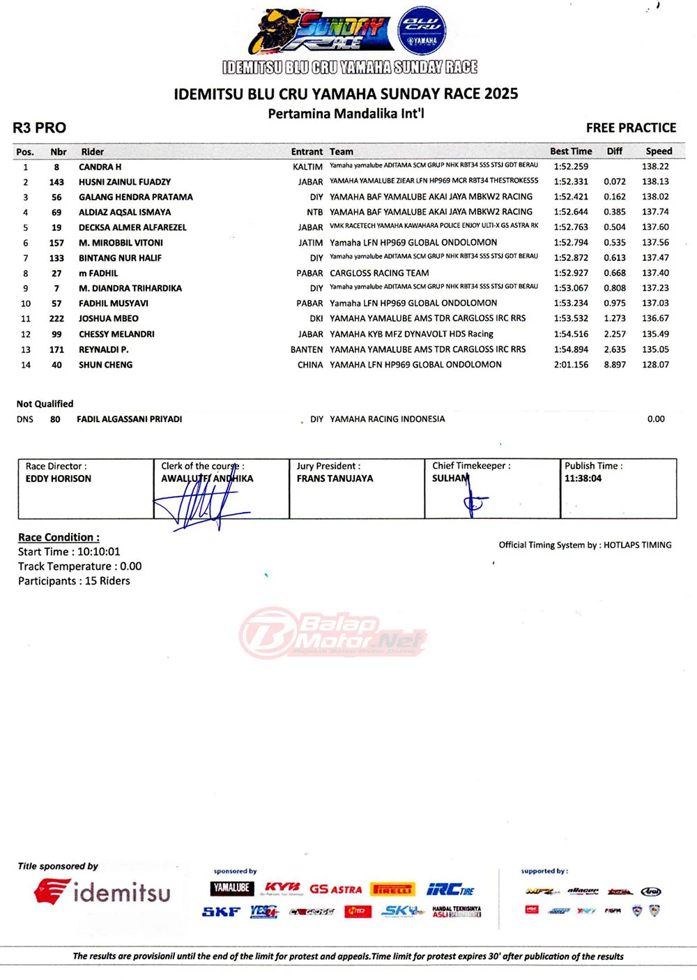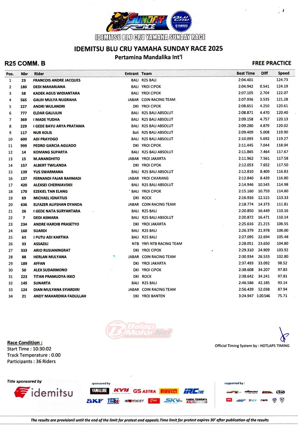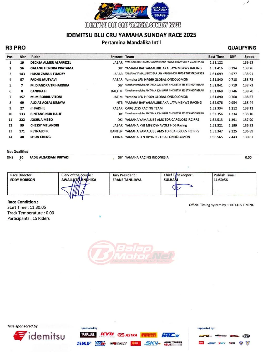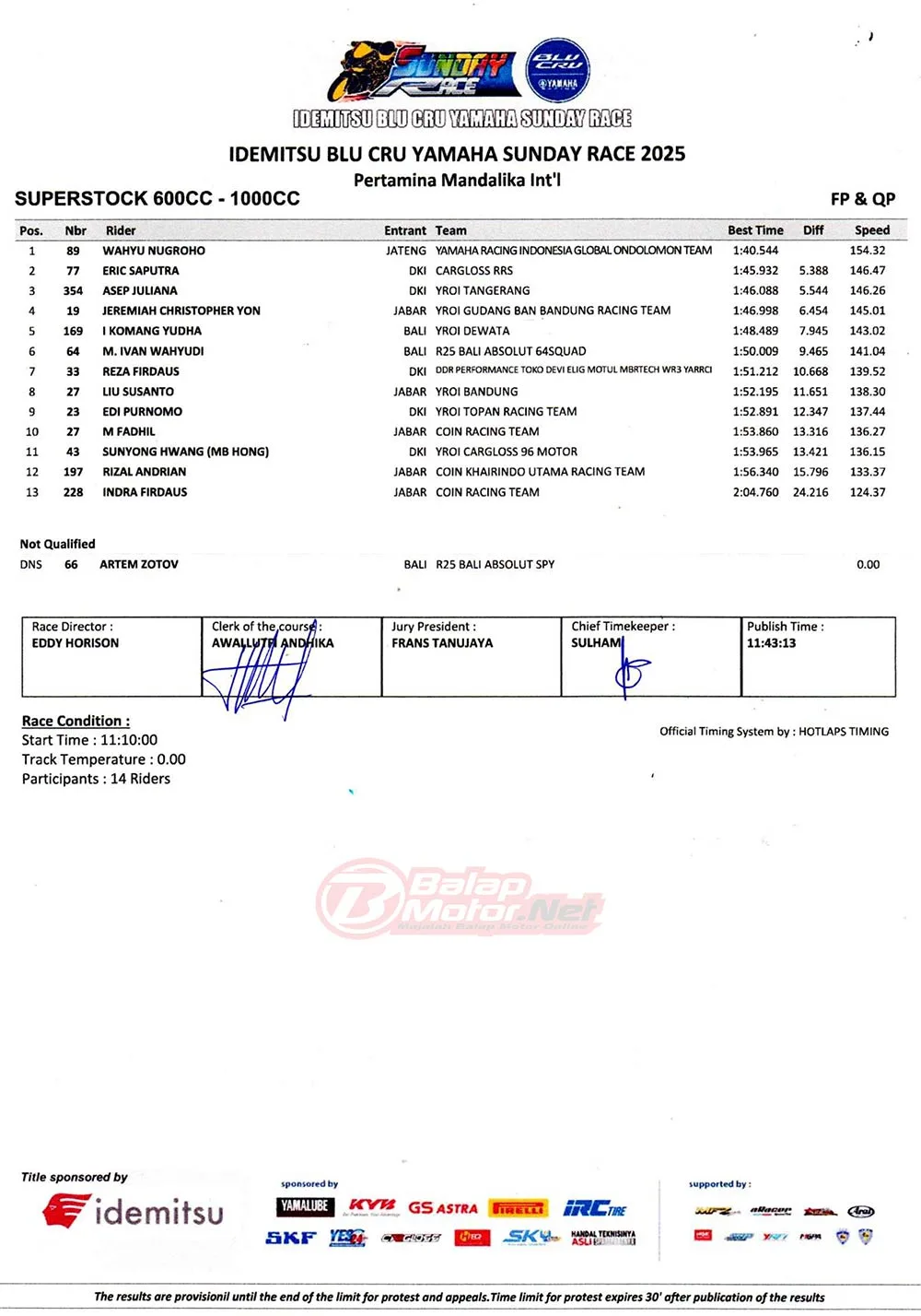 BalapMotor.Net – Berikut merupakan hasil lengkap dari sesi hari pertama (13/6) gelaran Idemitsu BLU CRU Yamaha Sunday Race 2025 yang berlangsung di sirkuit Pertamina Mandalika, Lombok pada hari Jumat 13 Juni 2025. (**)
