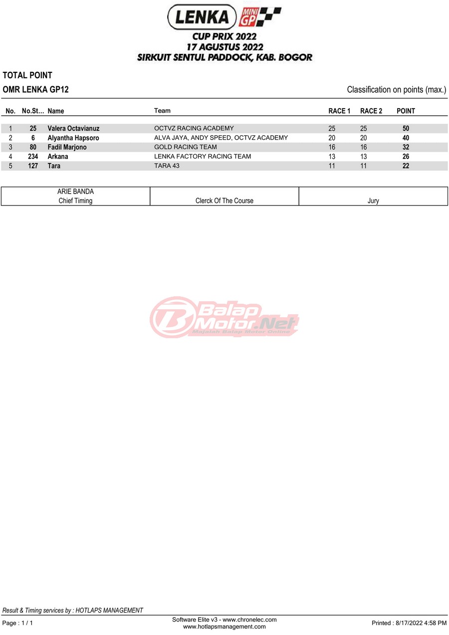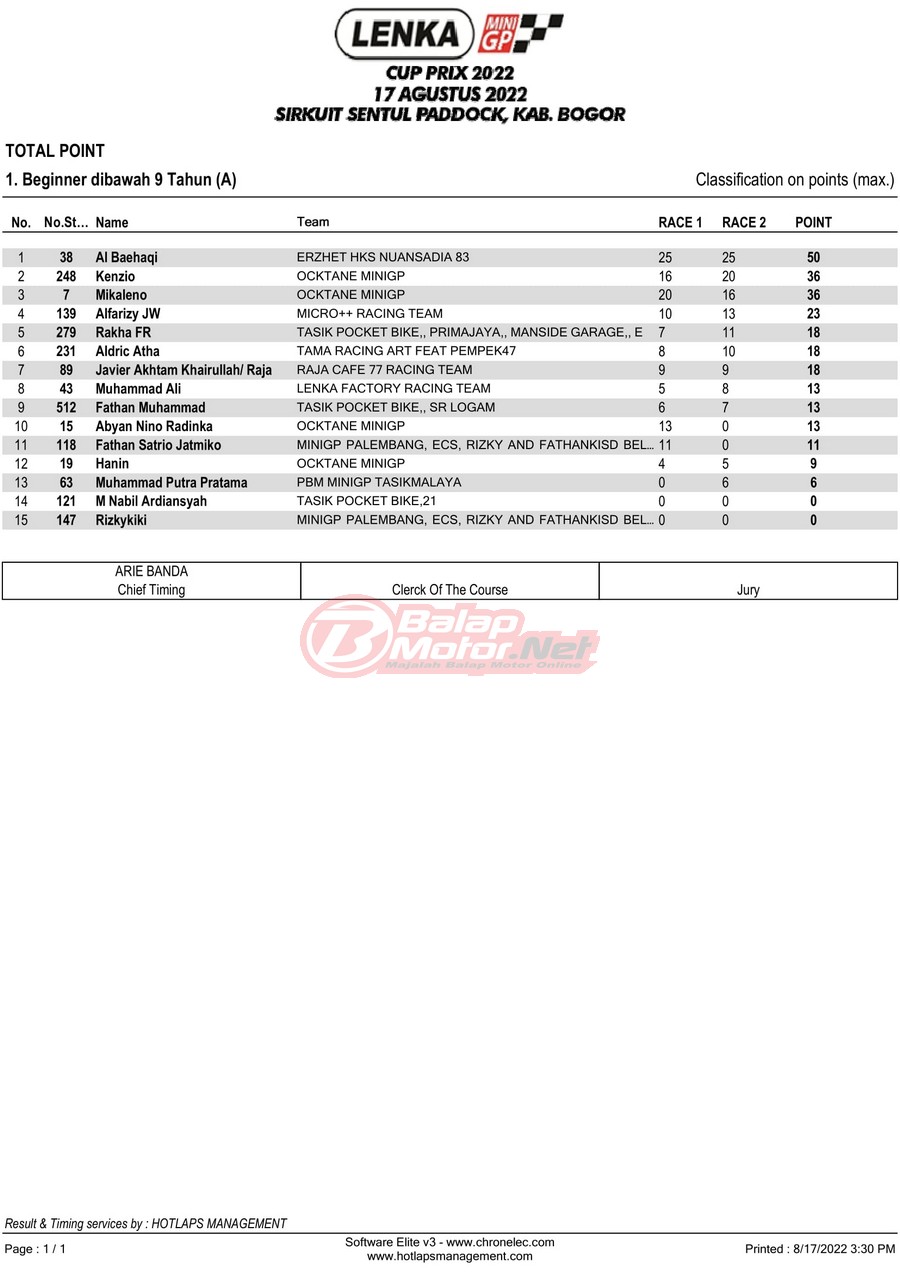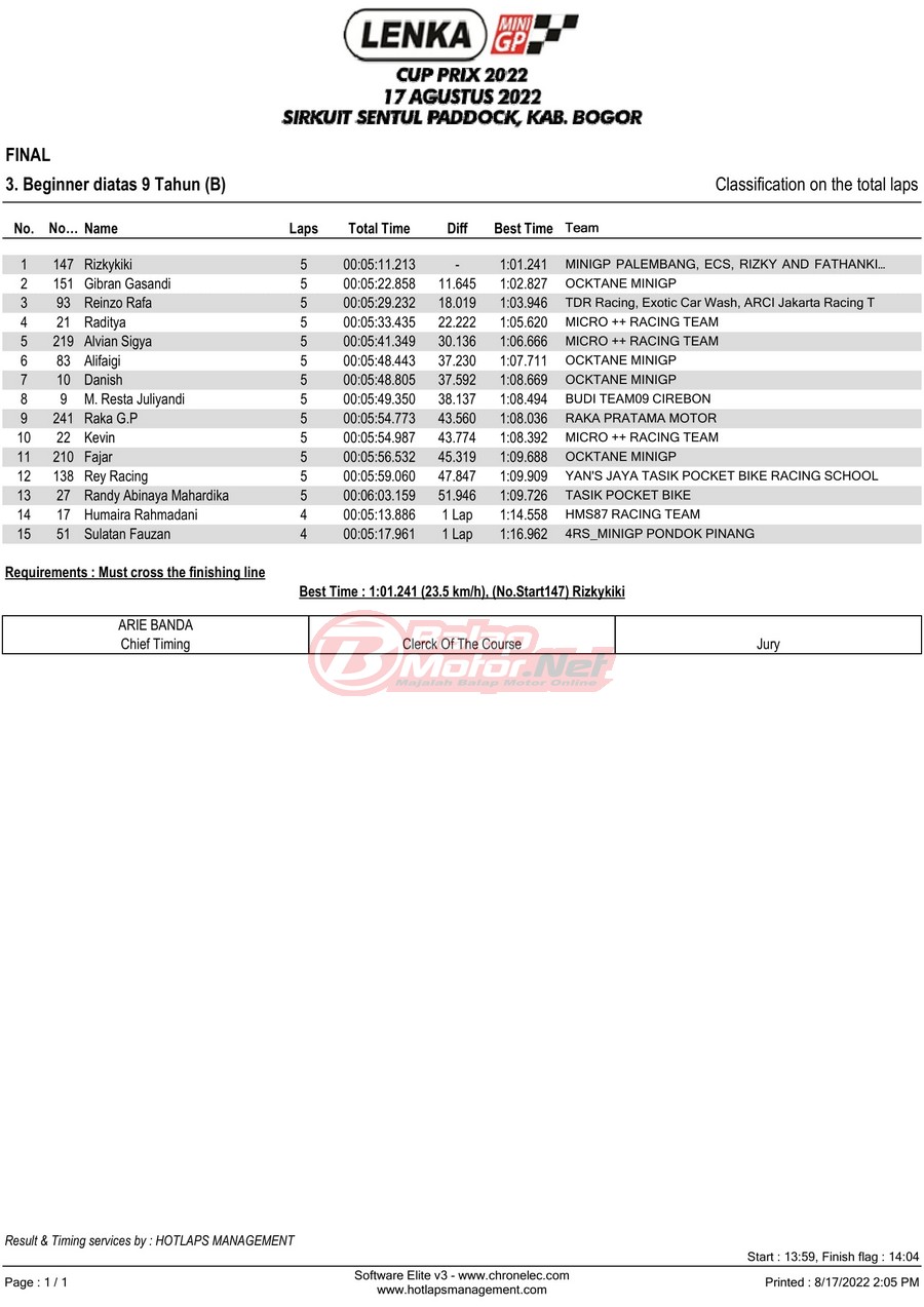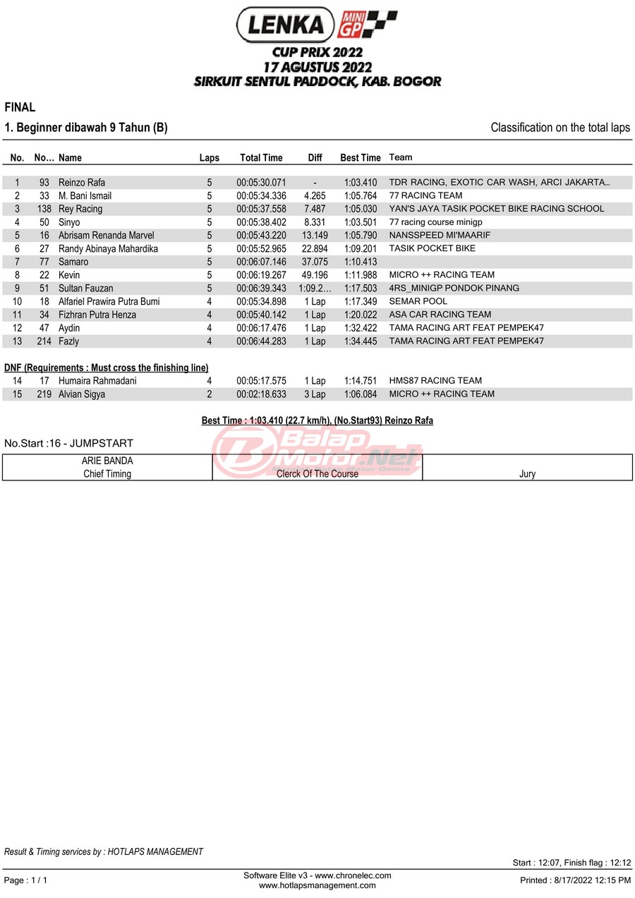 BalapMotor.Net – Berikut merupakan hasil lomba dari gelaran LENKA MiniGP Cup Prix 2022 Ronde 3 yang digelar di sirkuit Sentul Paddock, Kabupaten Bogor pada hari Rabu 17 Agustus 2022.