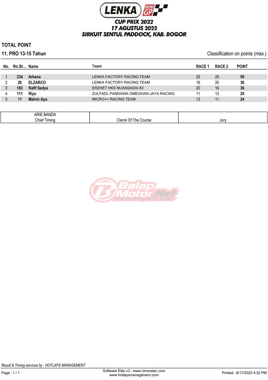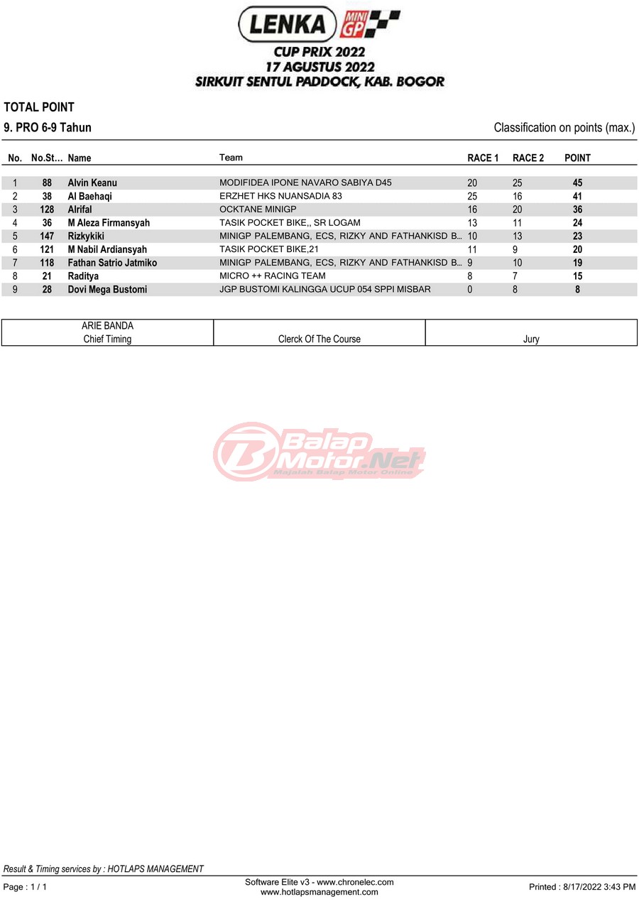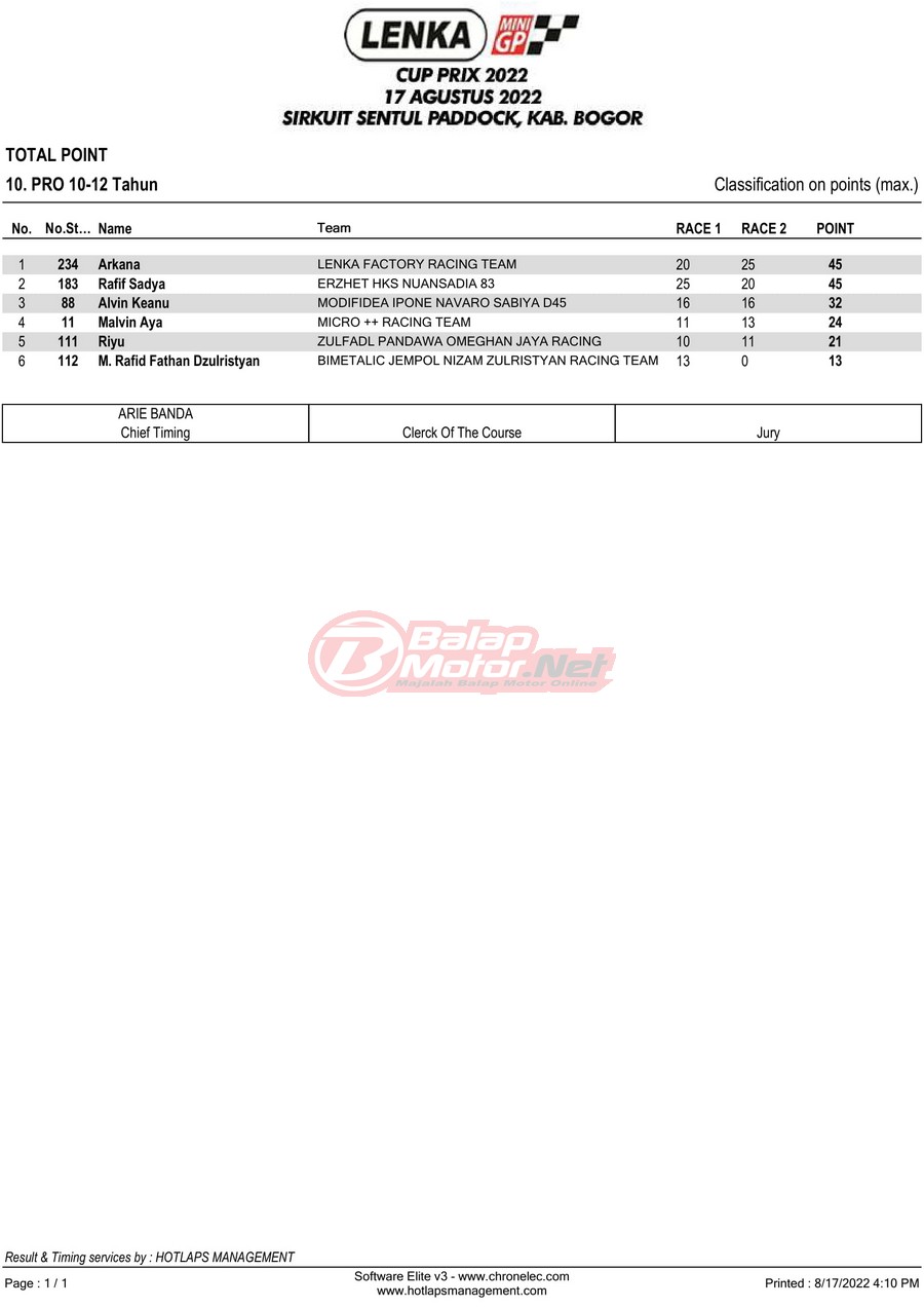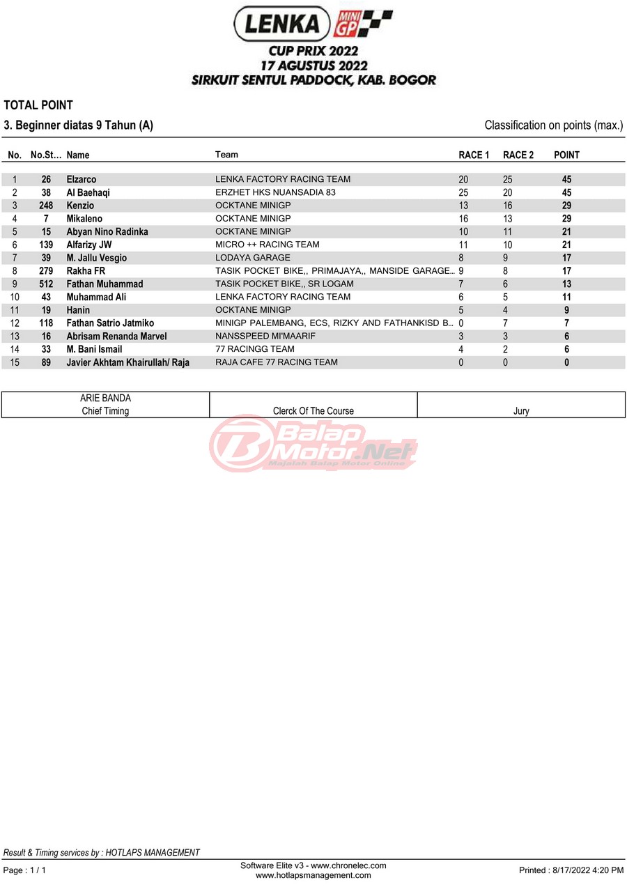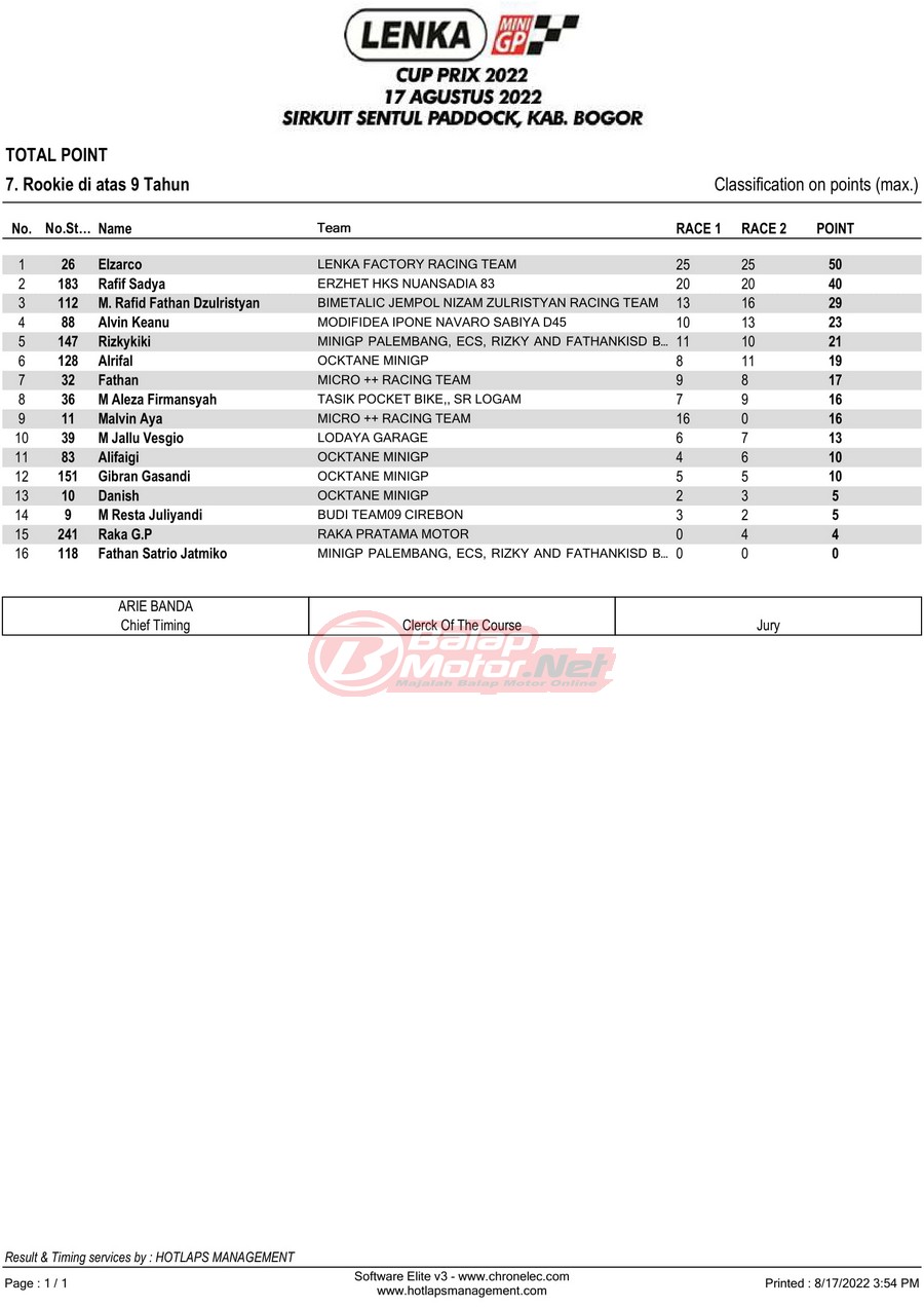 BalapMotor.Net – Berikut merupakan hasil lomba dari gelaran LENKA MiniGP Cup Prix 2022 Ronde 3 yang digelar di sirkuit Sentul Paddock, Kabupaten Bogor pada hari Rabu 17 Agustus 2022.